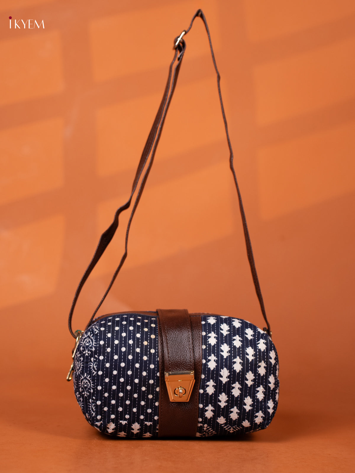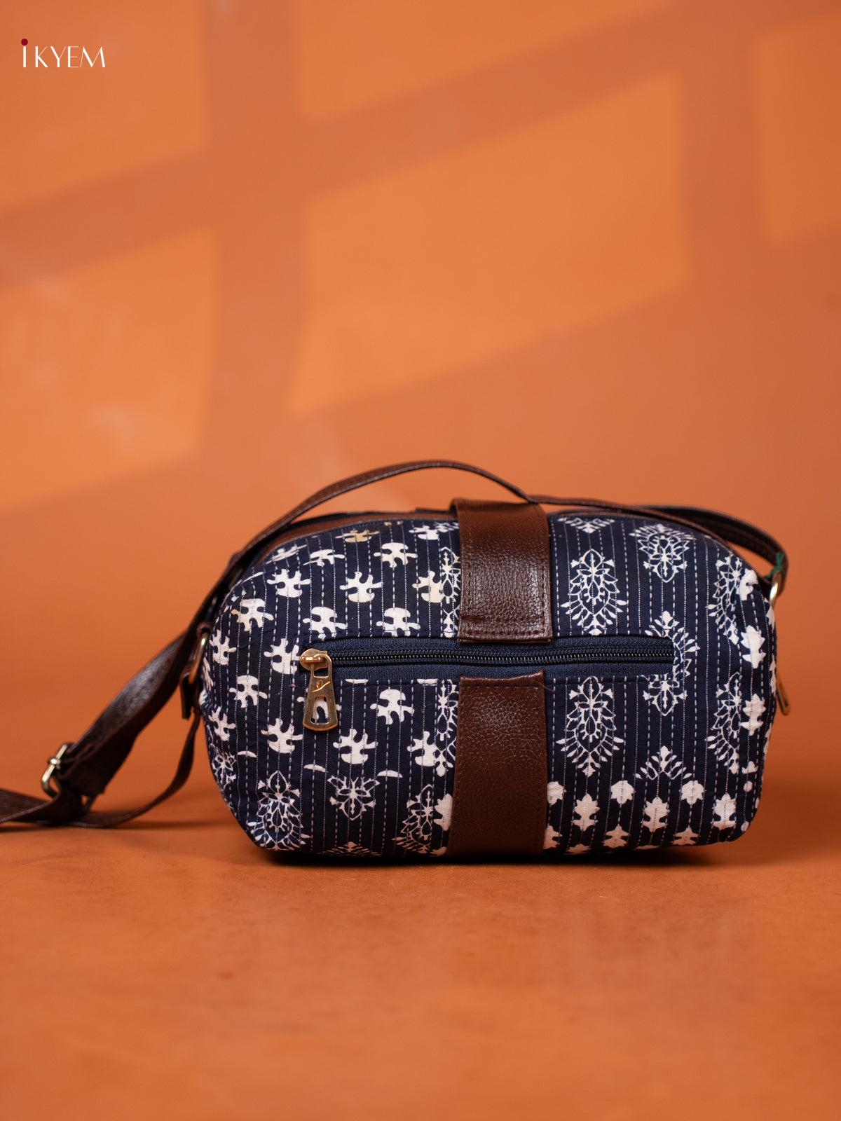 Ikat Cotton Leather Sling bag with 3 Compartments -Navy Blue - KD26970