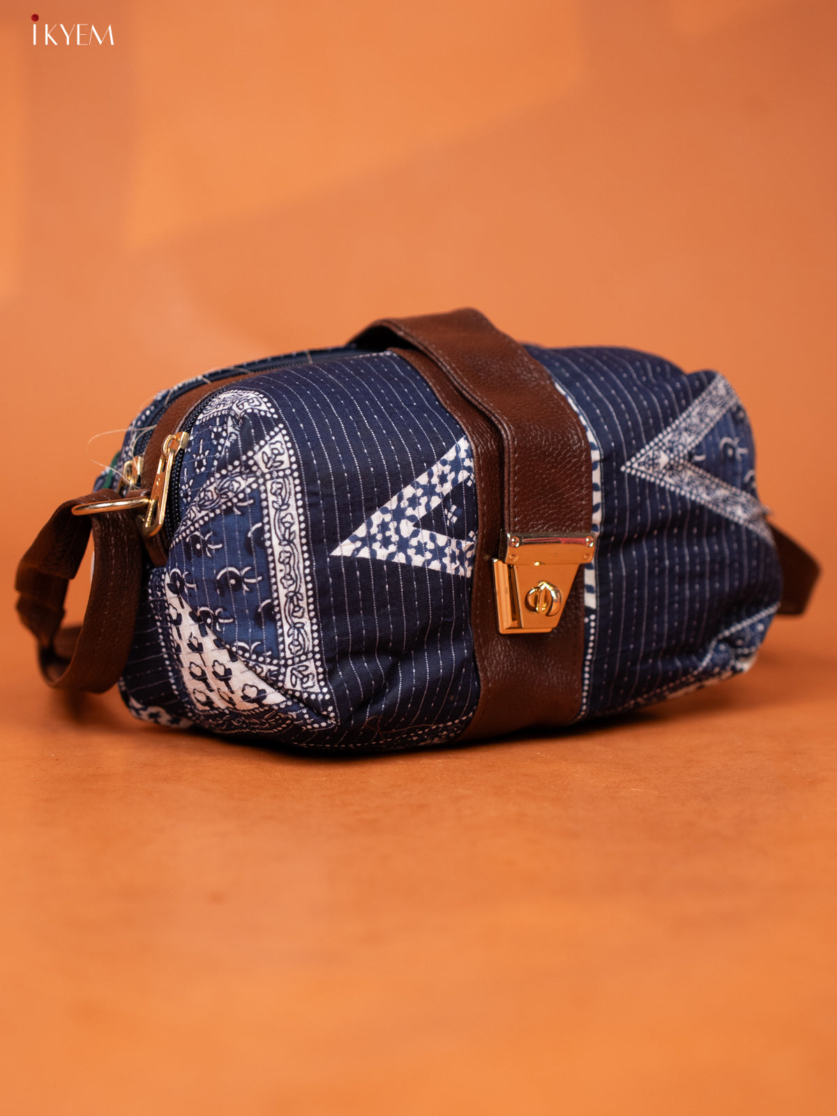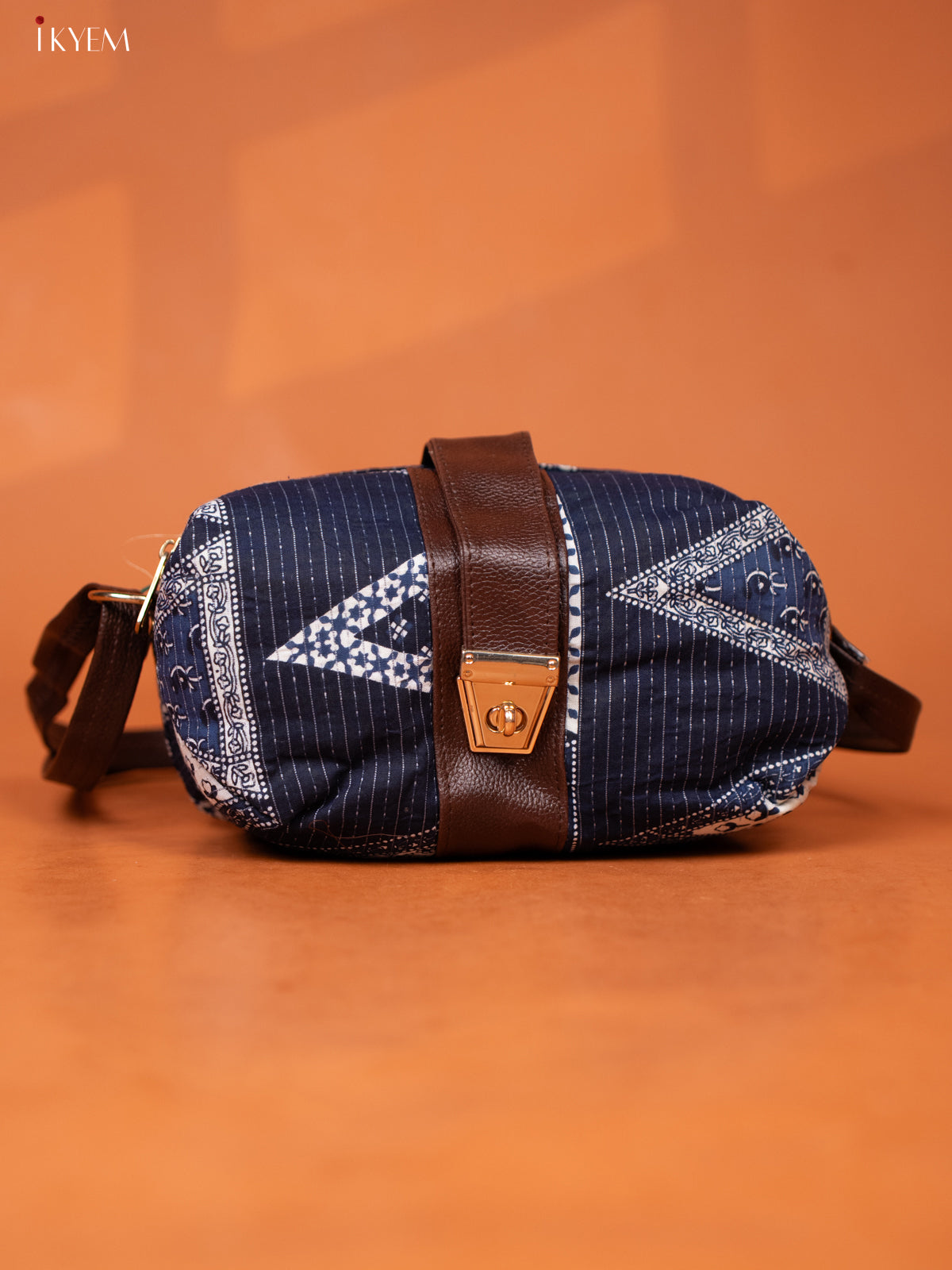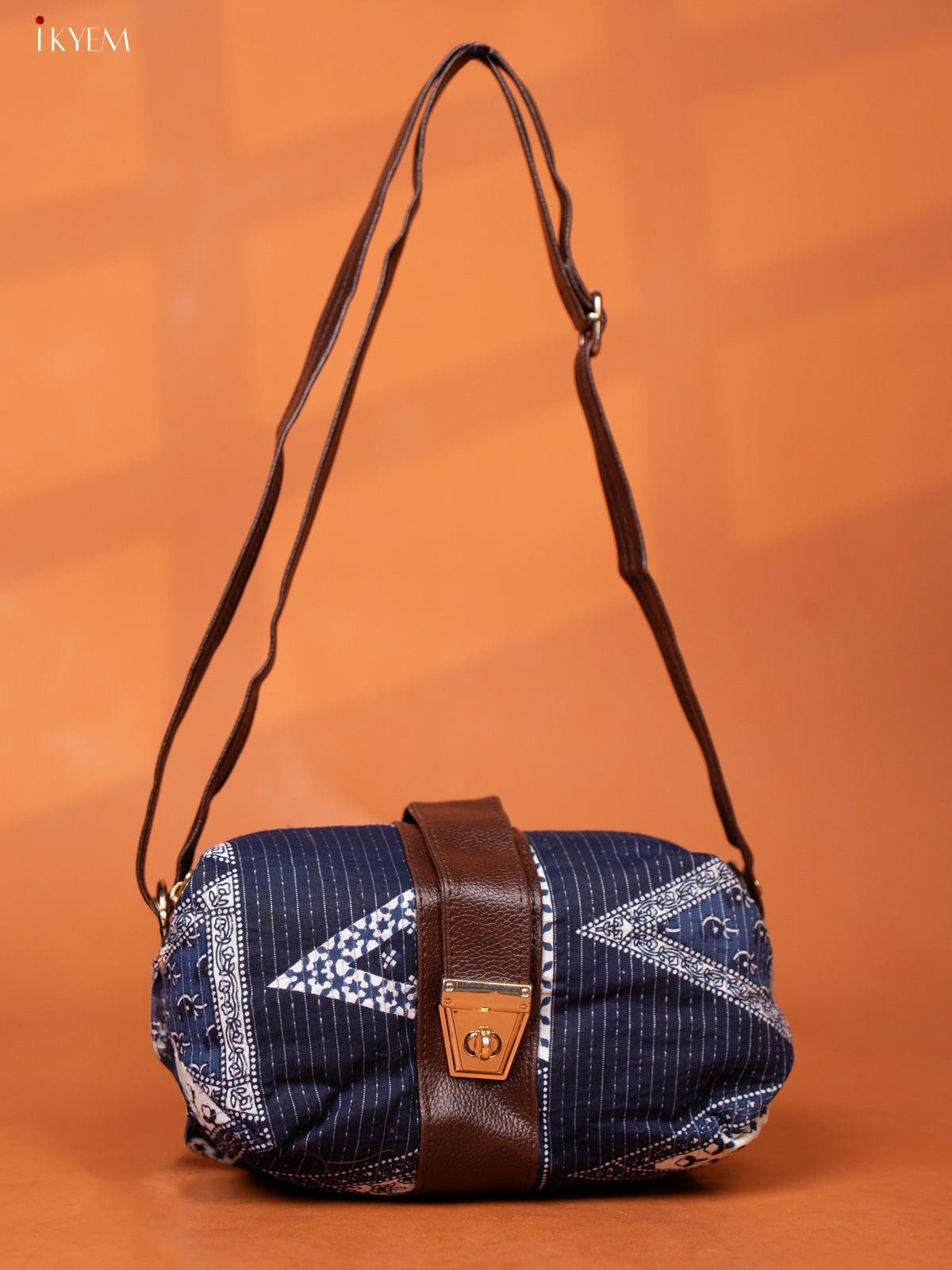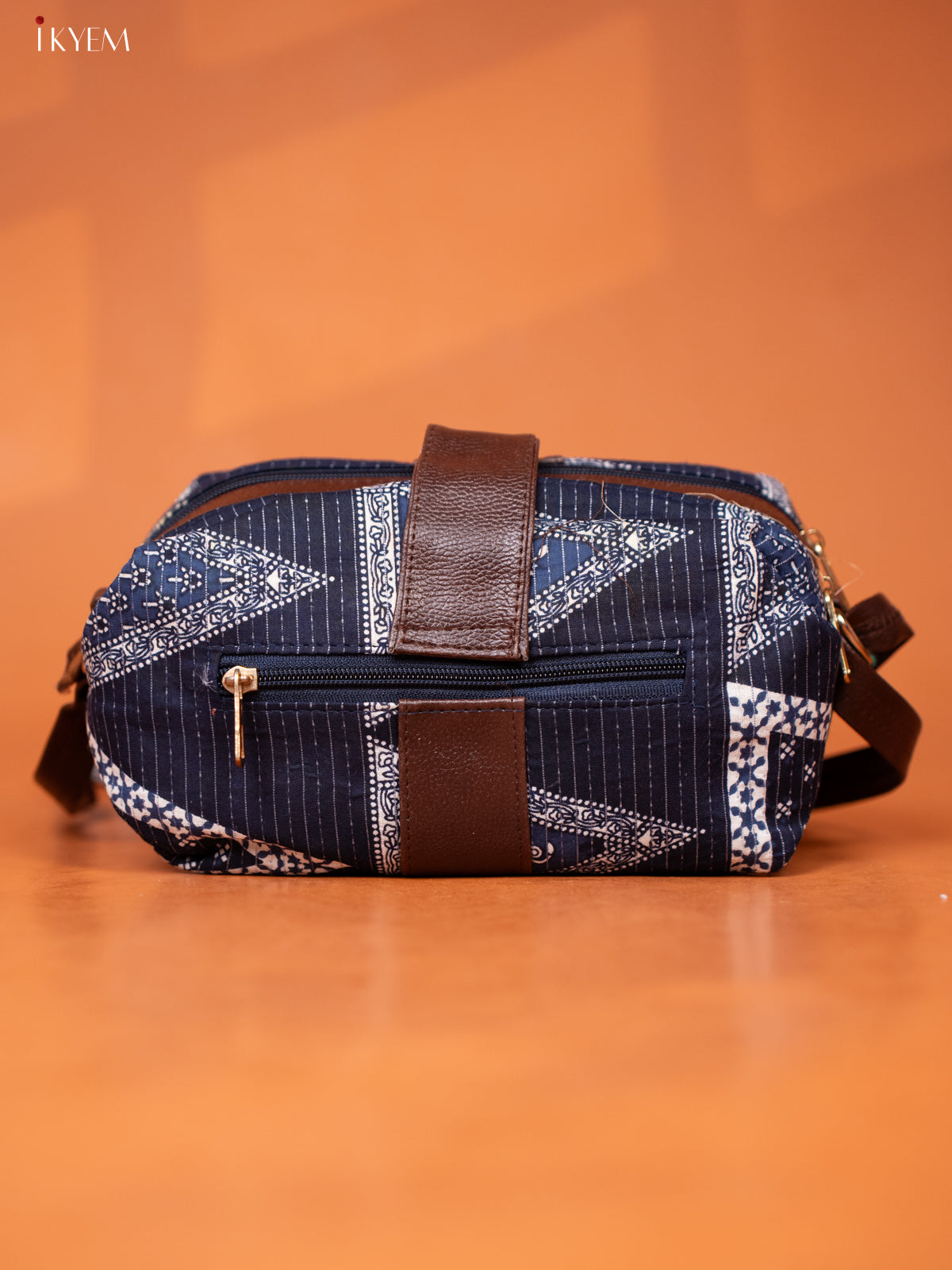 Ikat Cotton Leather Sling bag with 3 Compartments -Navy Blue - KD26973