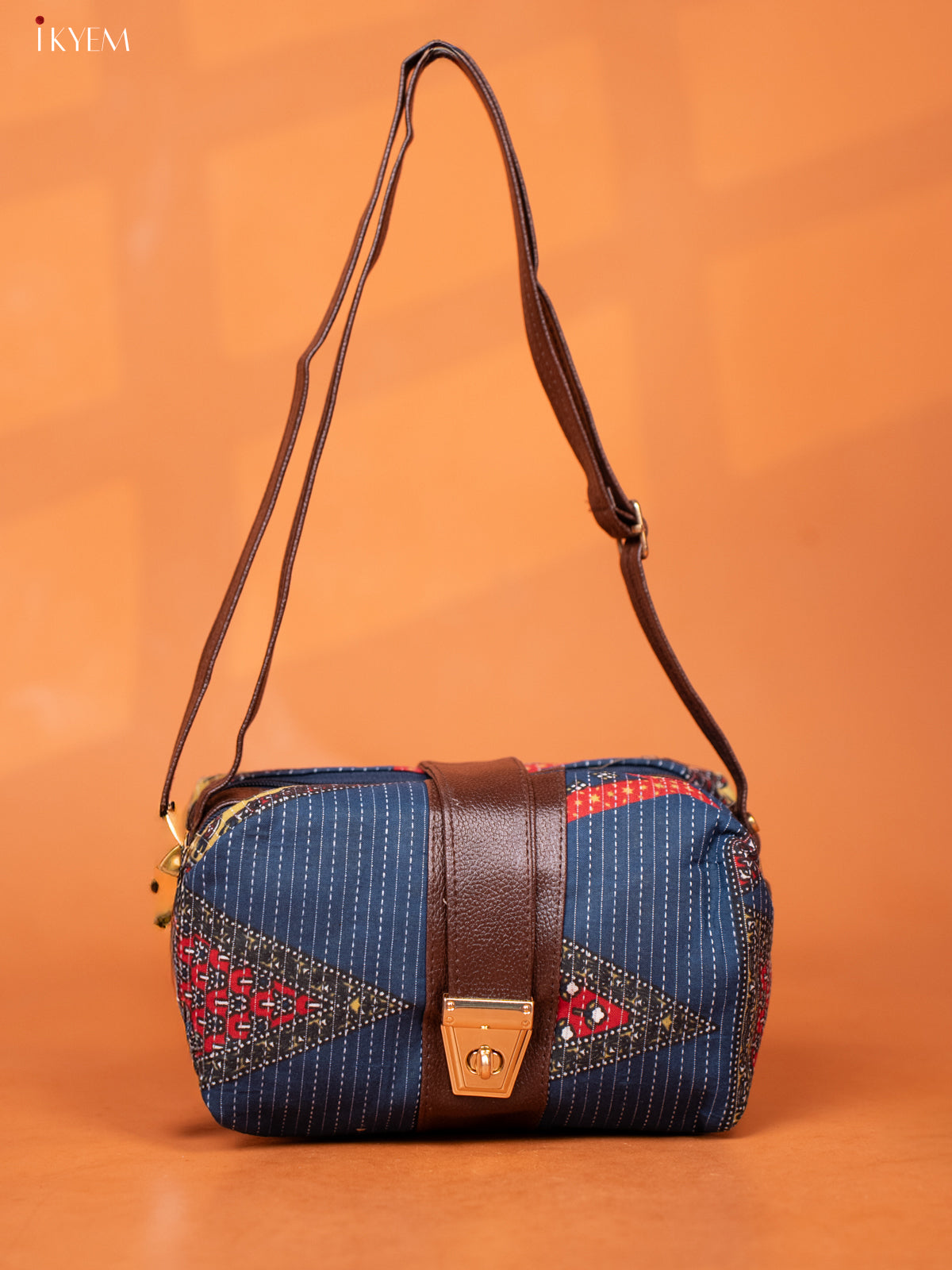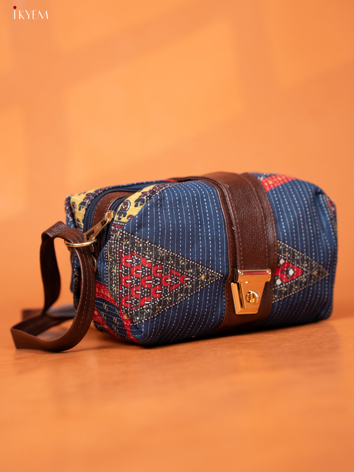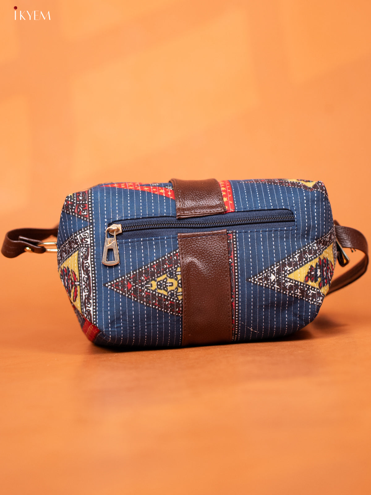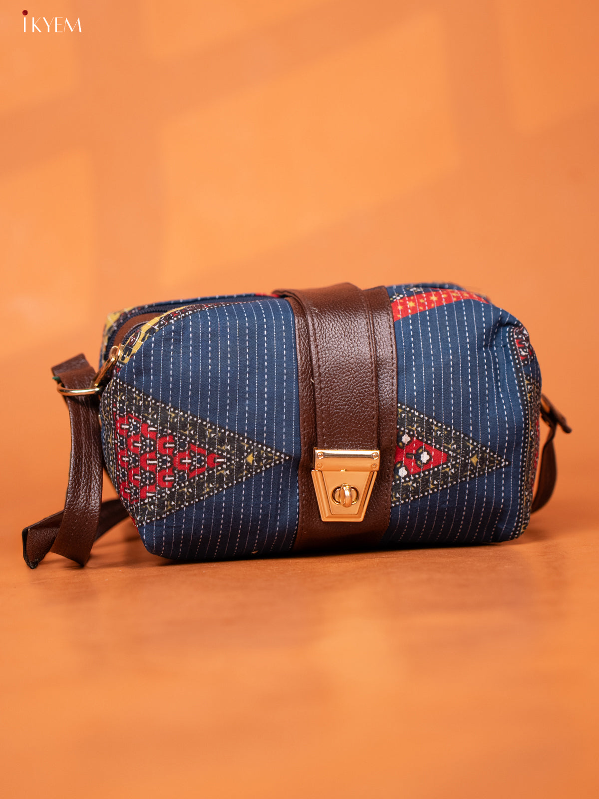 Ikat Cotton Leather Sling bag with 3 Compartments - Blue - KD26974