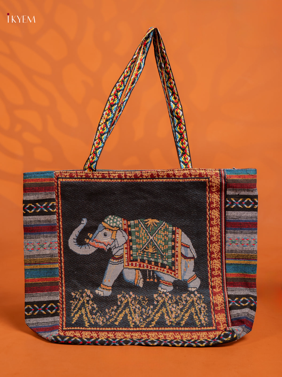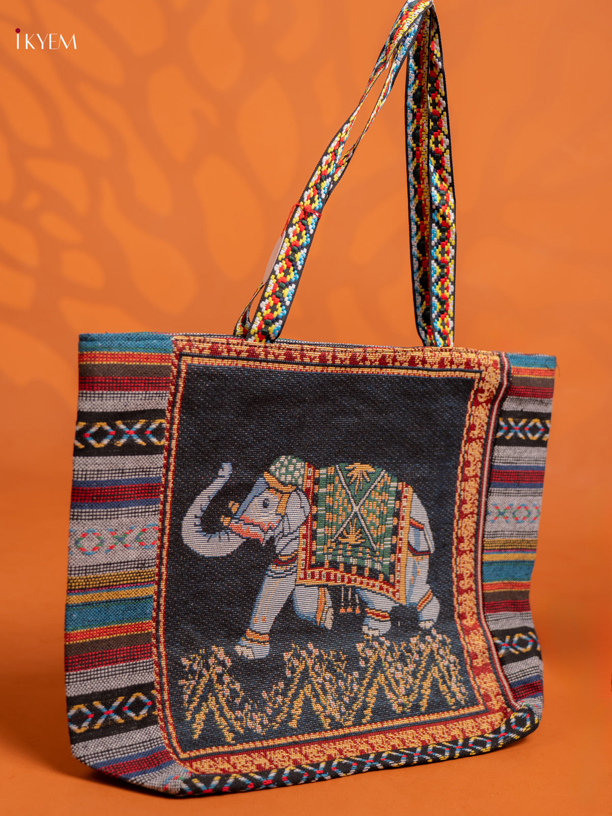 - Stylish navy blue and grey elephant tote bag with a single compartment design.
