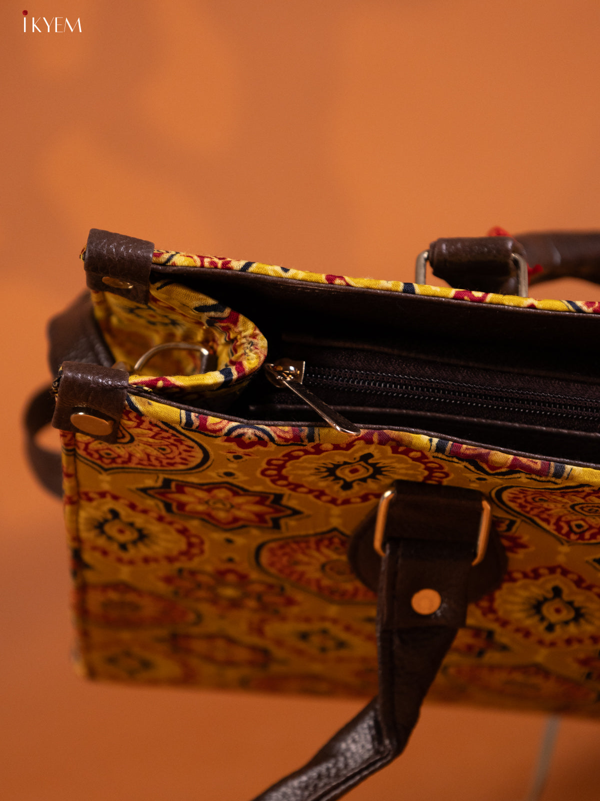 Ajrakh Print Handbag and leather Sling Bag with 1 Compartments - Yellow - KE16283