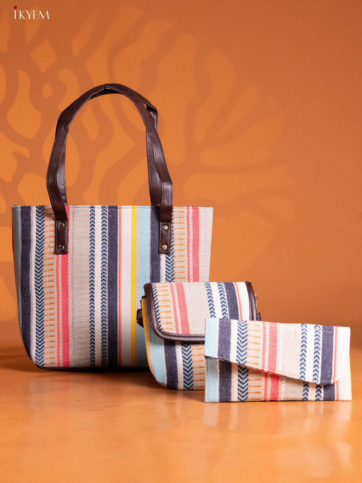 - The versatile collection includes a coordinated handbag, sling bag, and wallet all constructed from premium fabric.