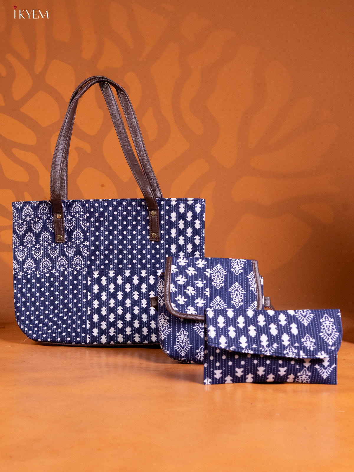 - This Ikat Design Handbag Combo Set in Navy Blue features meticulously handcrafted traditional Ikat patterns.