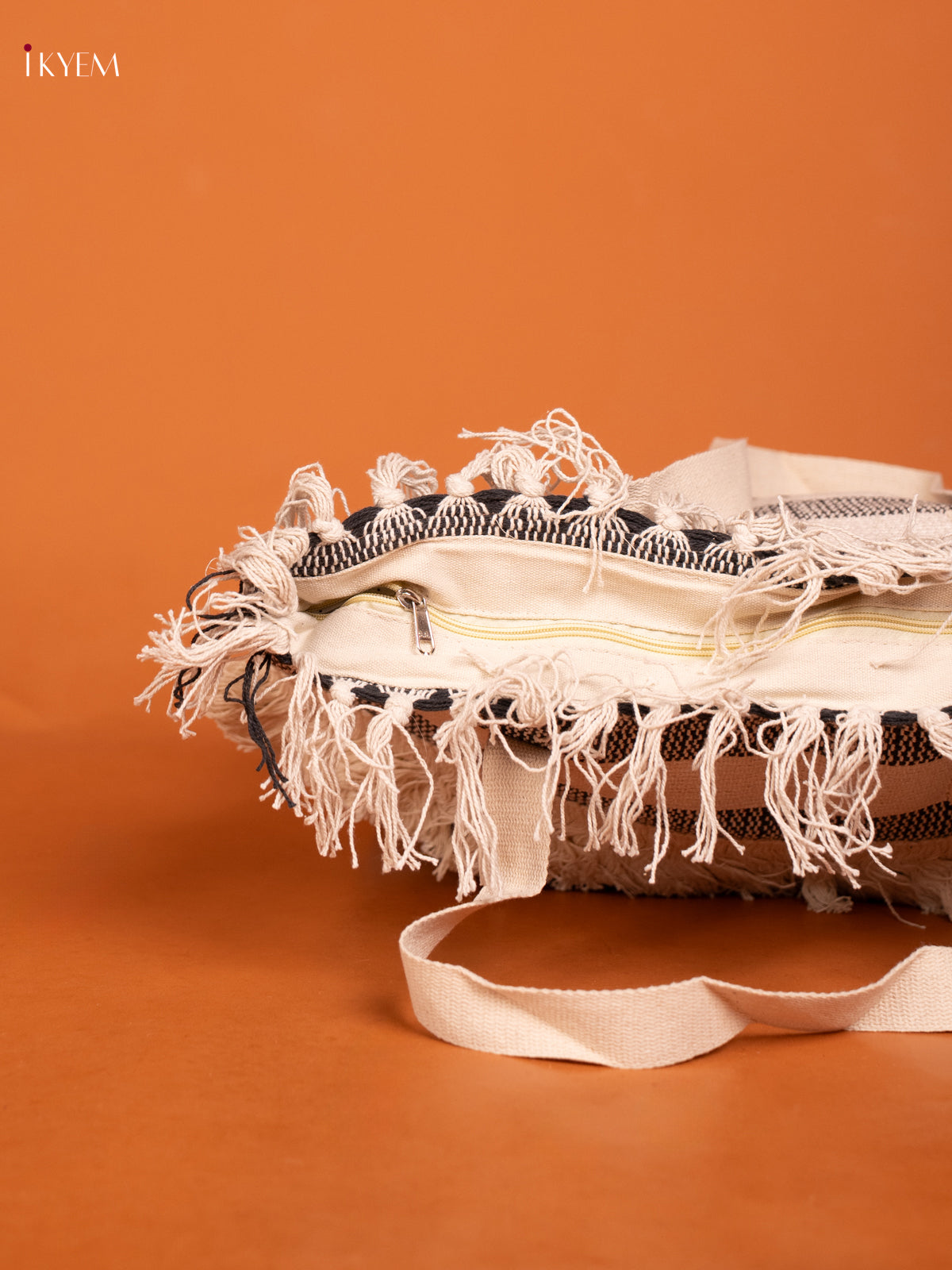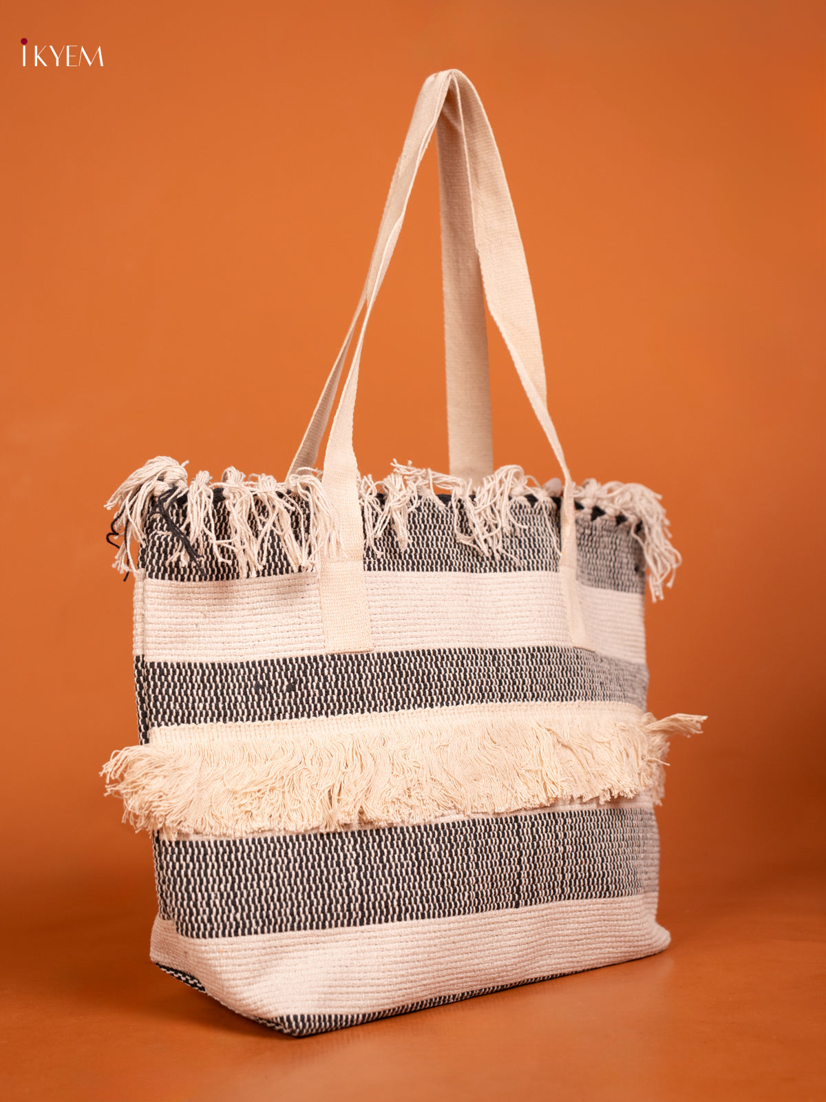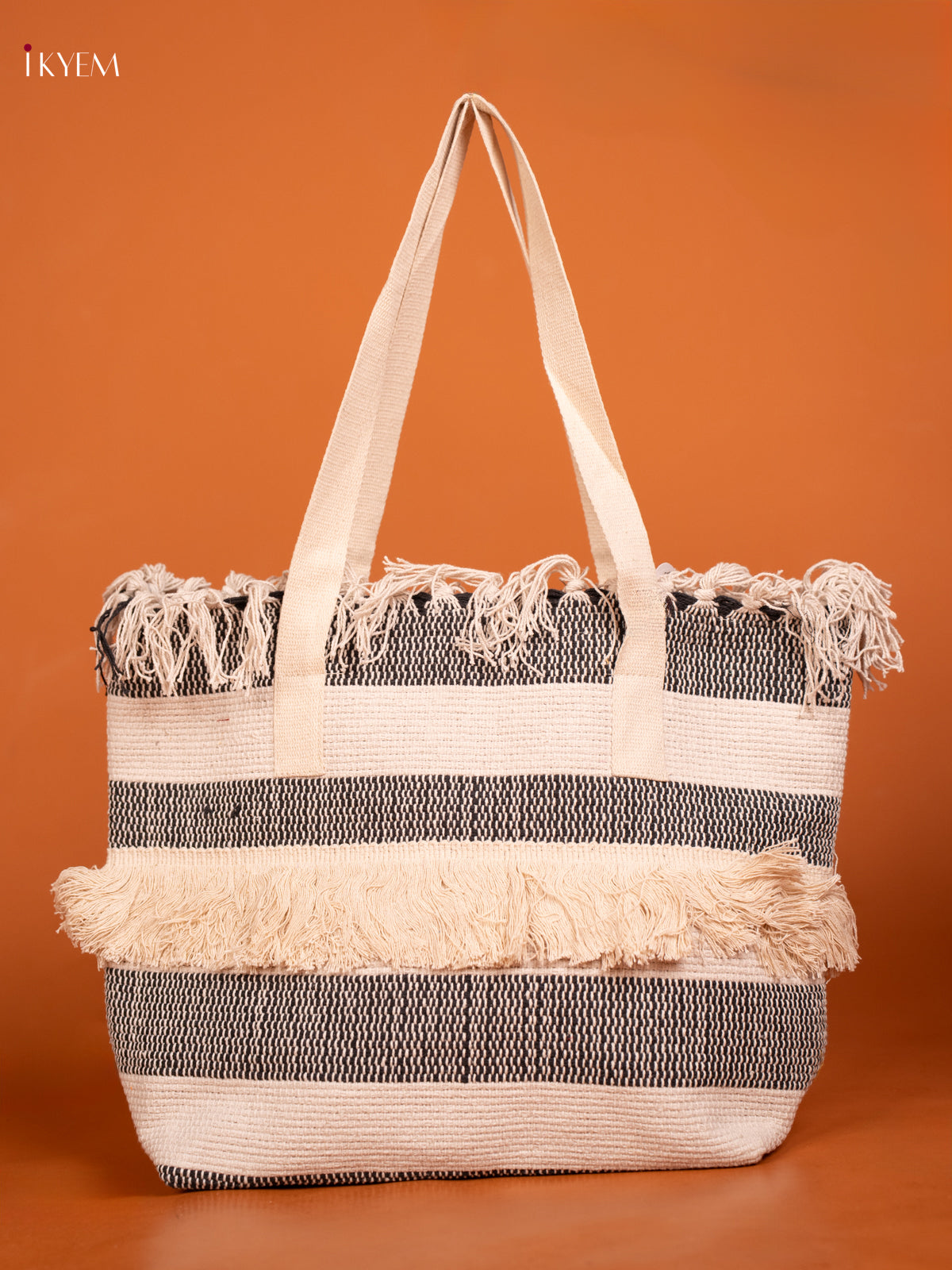 - This black and white cotton tote bag features a single compartment designed for easy organization and everyday convenience.
