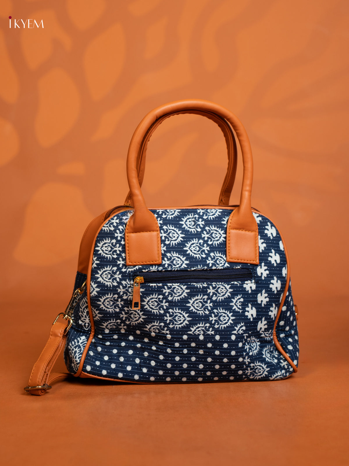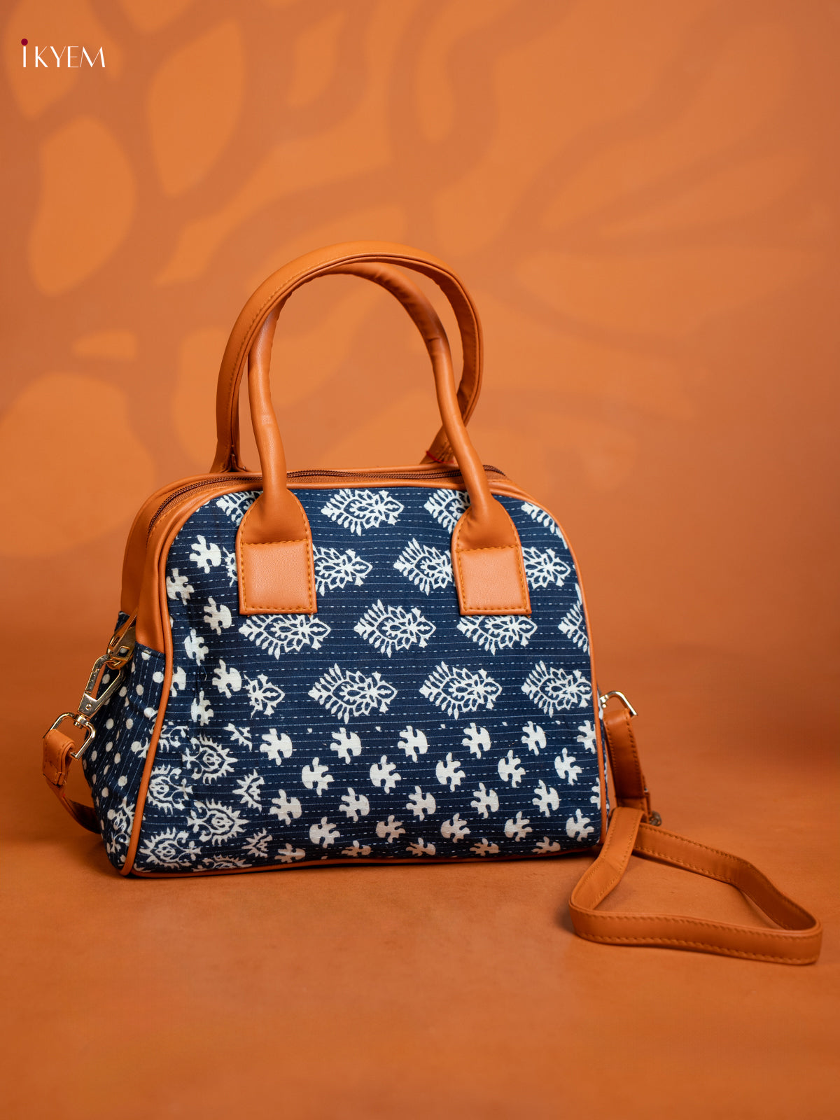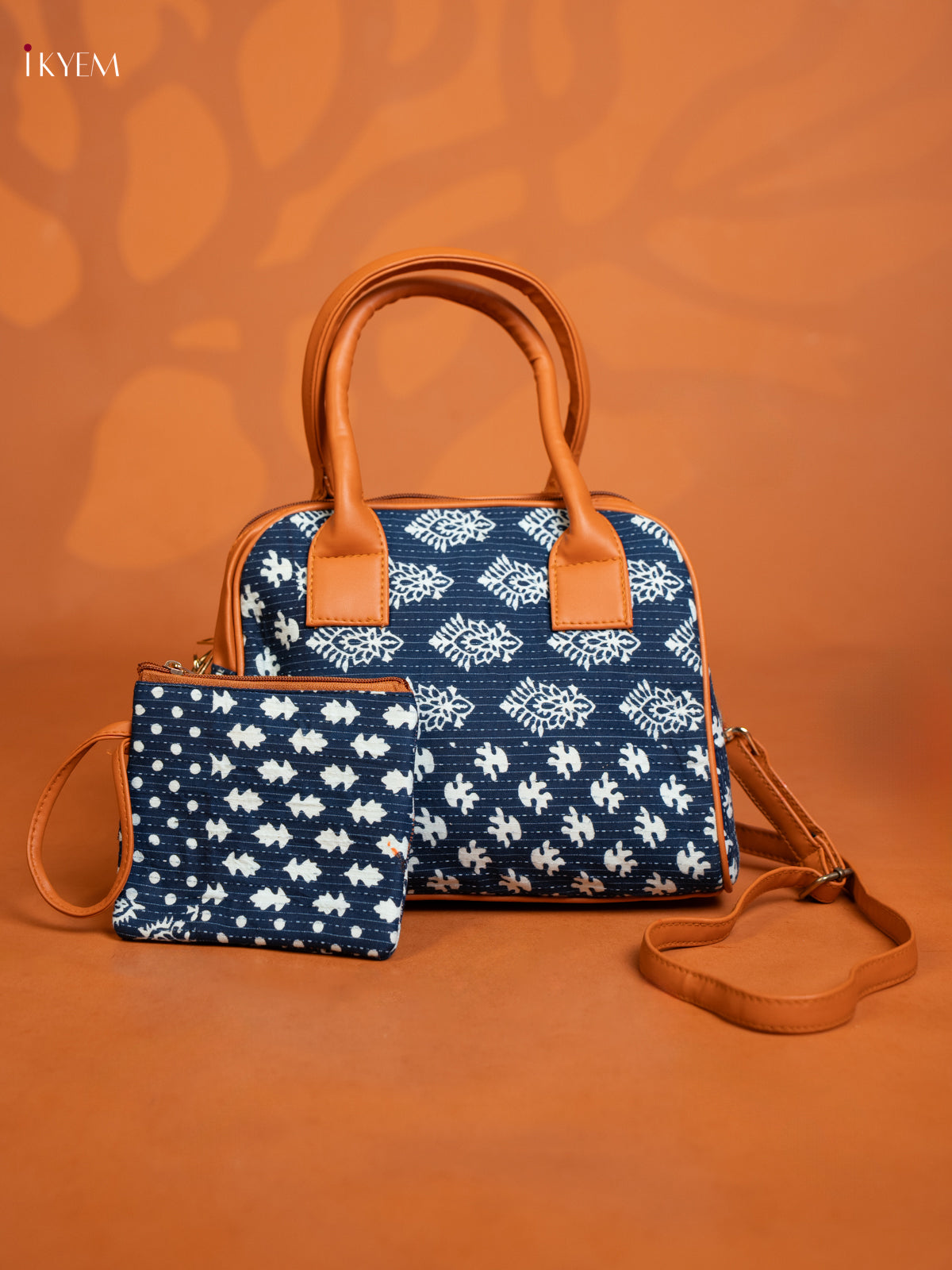 Cotton Ikat Printed handbag & Leather Sling with 2 Compartments 1 Pouch - Indigo blue - KE16368