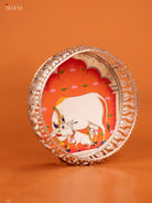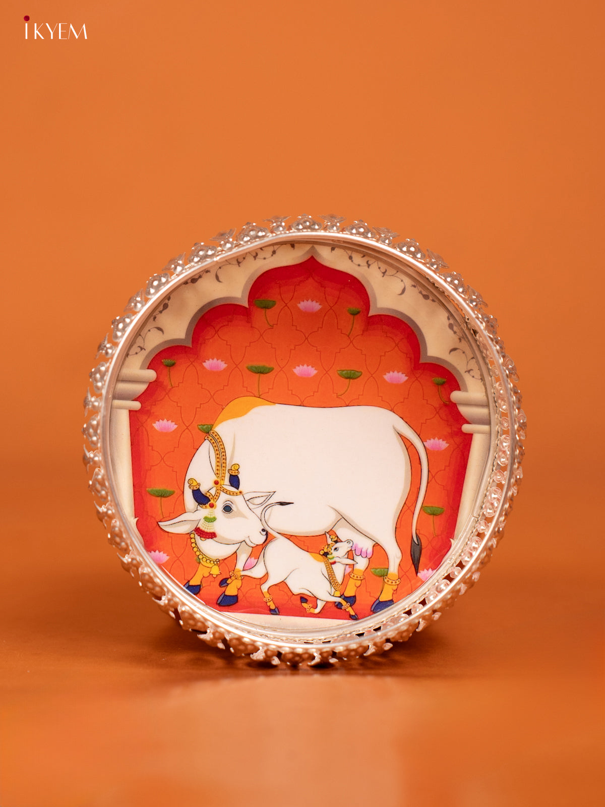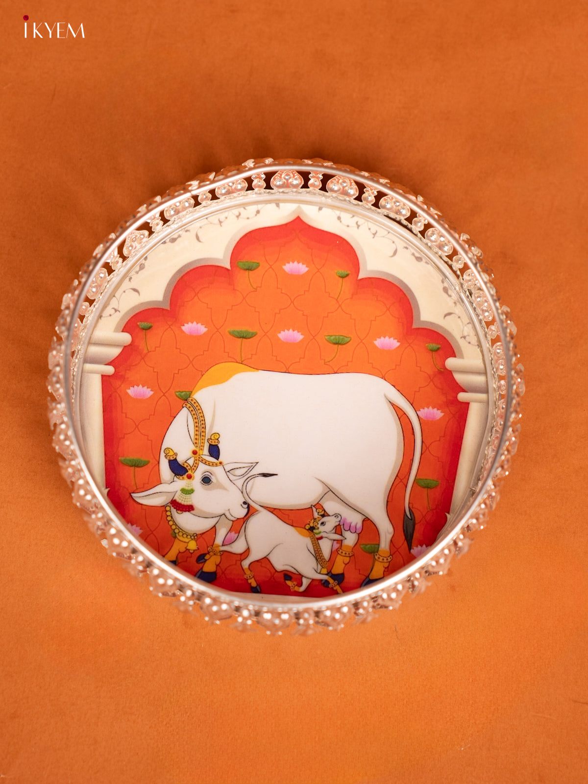 - Expertly crafted, this Digital Printed German Silver Tray boasts a stunning Cow & Calf design in vibrant Orange.