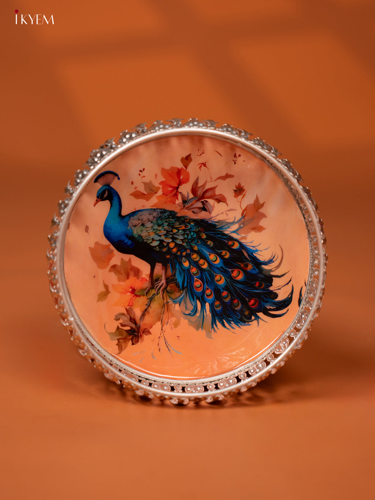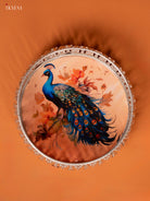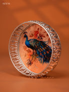 - This German silver Digital Pichwai tray features a beautiful depiction of a Peacock in peach cream base.