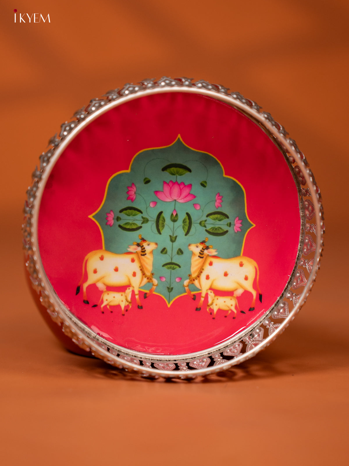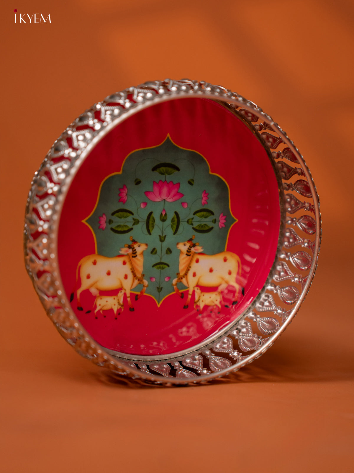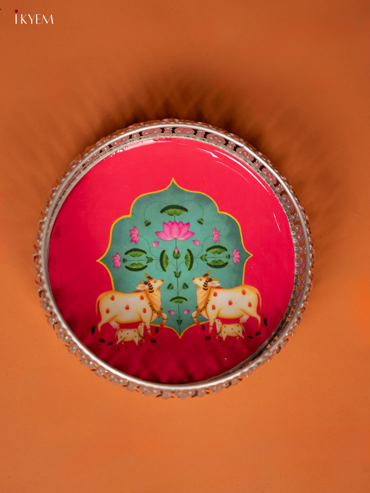 Digital Printed German Silver Pichwai Tray - Cow & Calf - Pink -(6 inch) - KE28121