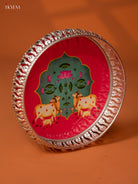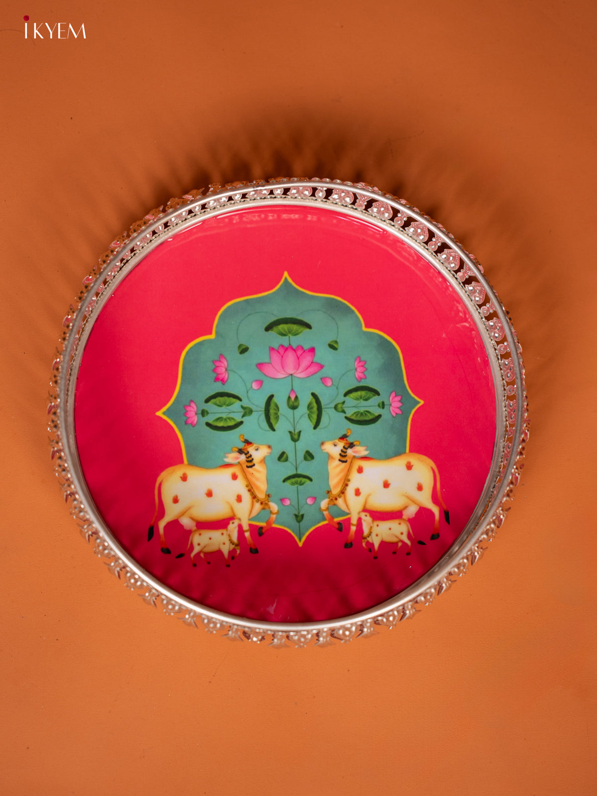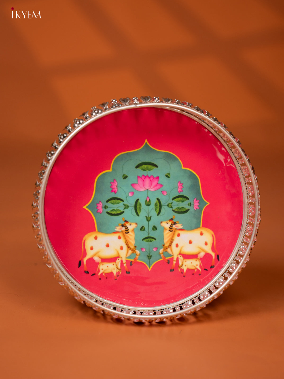 Digital Printed German Silver Pichwai Tray - Cow & Calf - PINK (8 inch) - KE28122