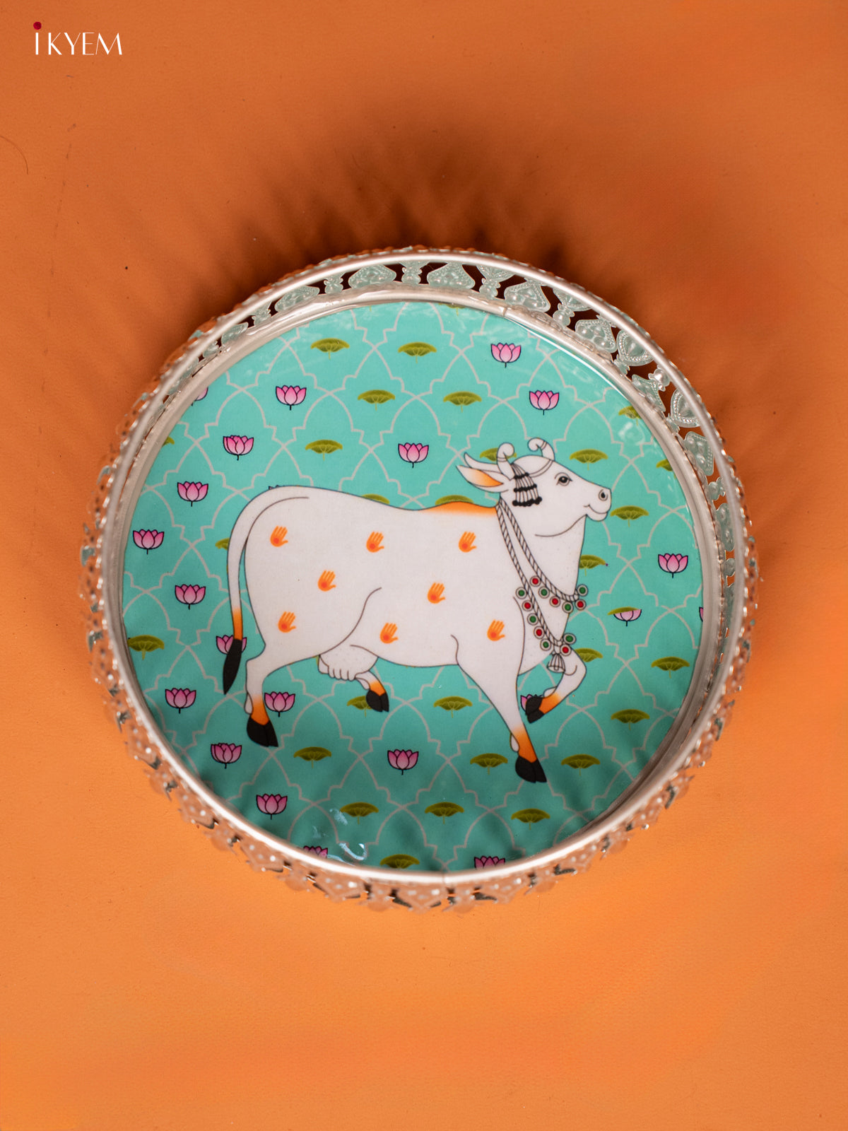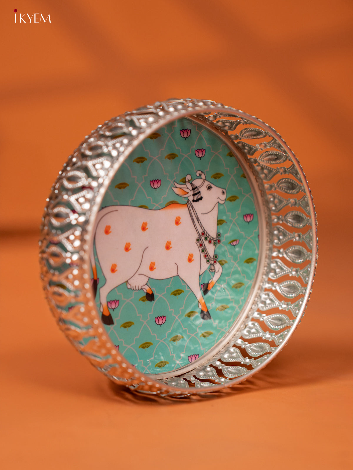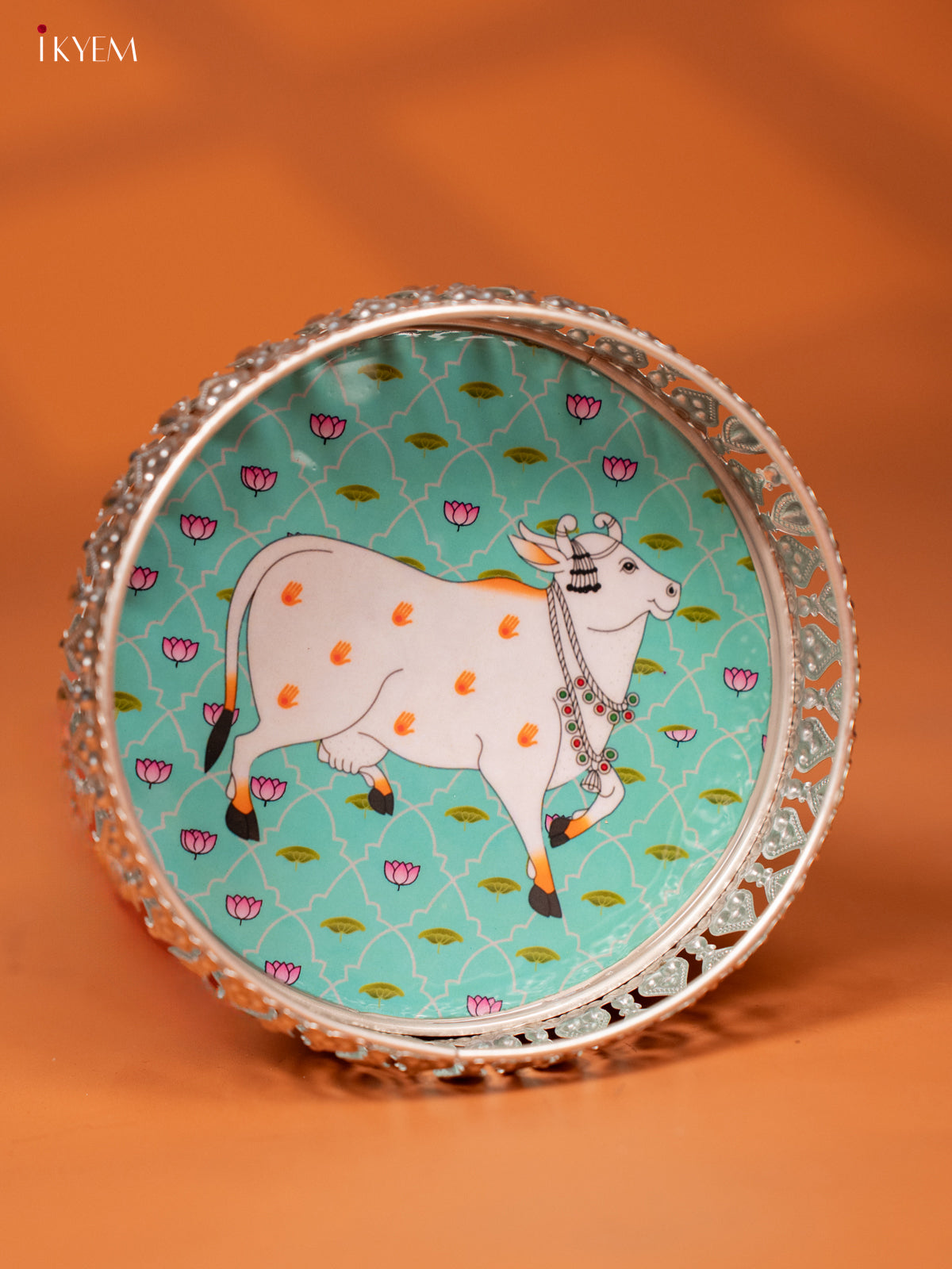 - This German silver Digital Pichwai tray features a beautiful depiction of a Pichwai cow in teal blue.