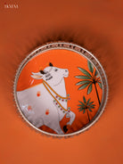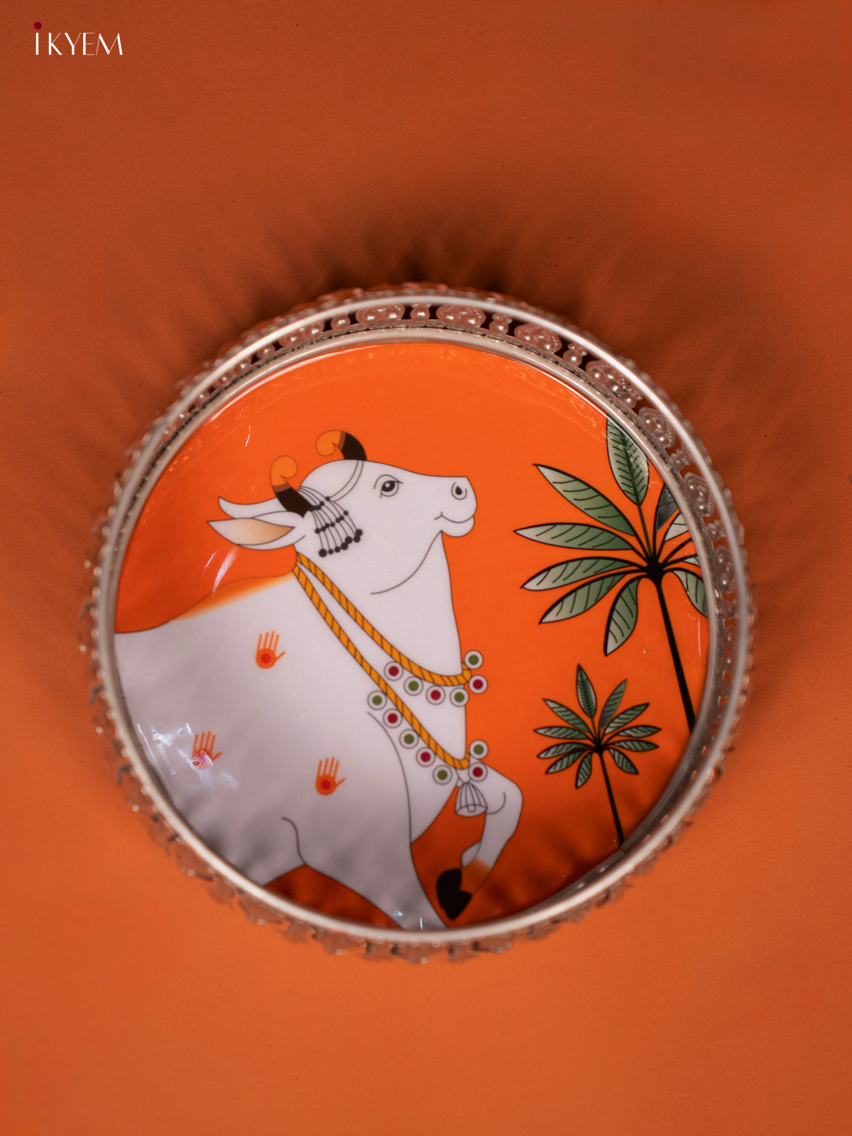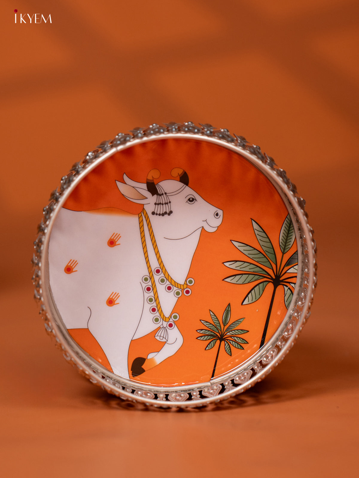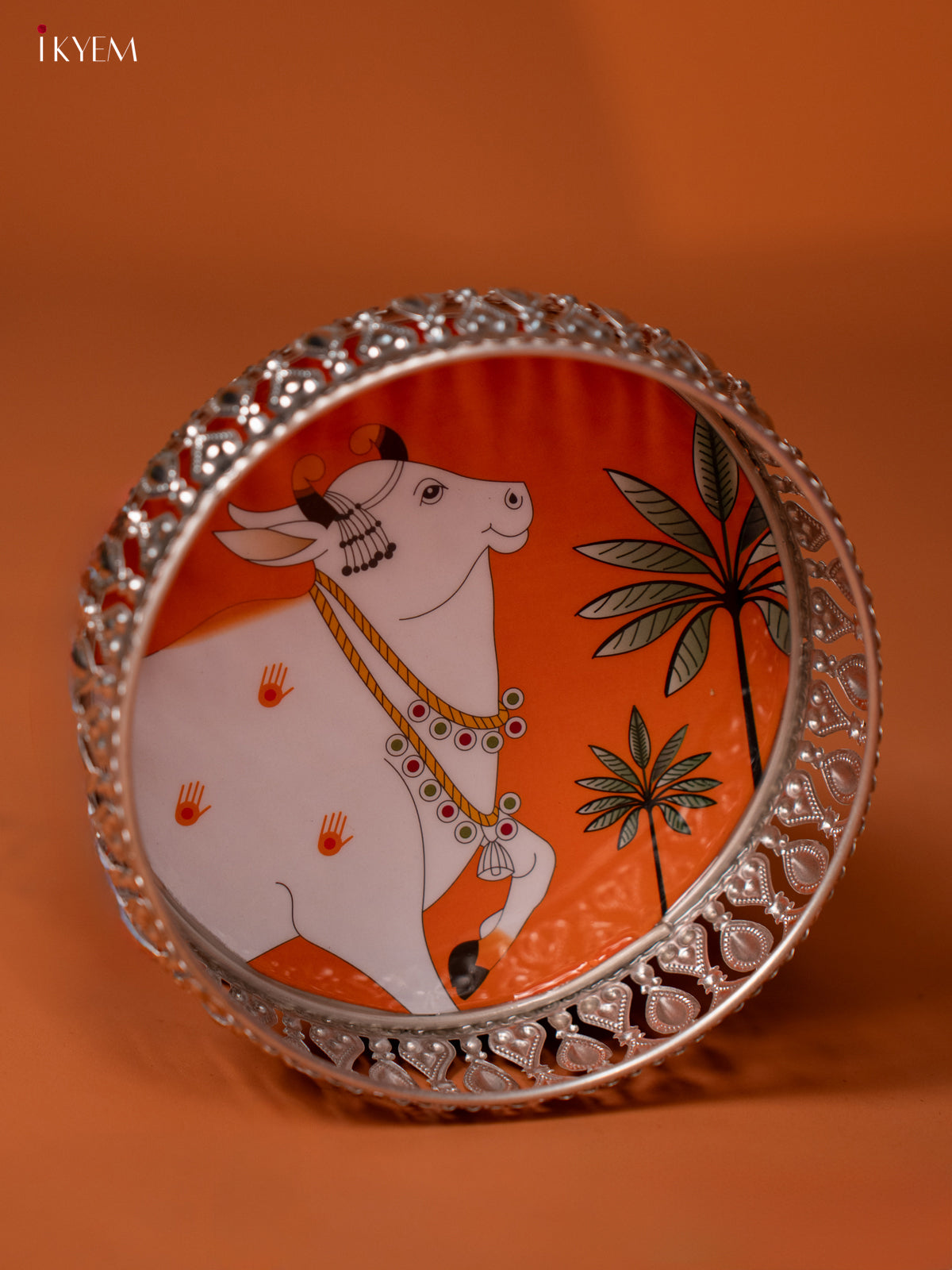 Digital Printed German Silver Pichwai Tray - Cow - Orange - (6 inch) - KE28126