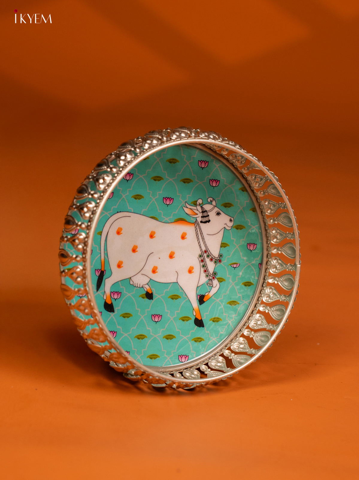 - Expertly crafted, this Digital Printed German Silver Tray boasts a stunning Cow design in vibrant Sky Blue.