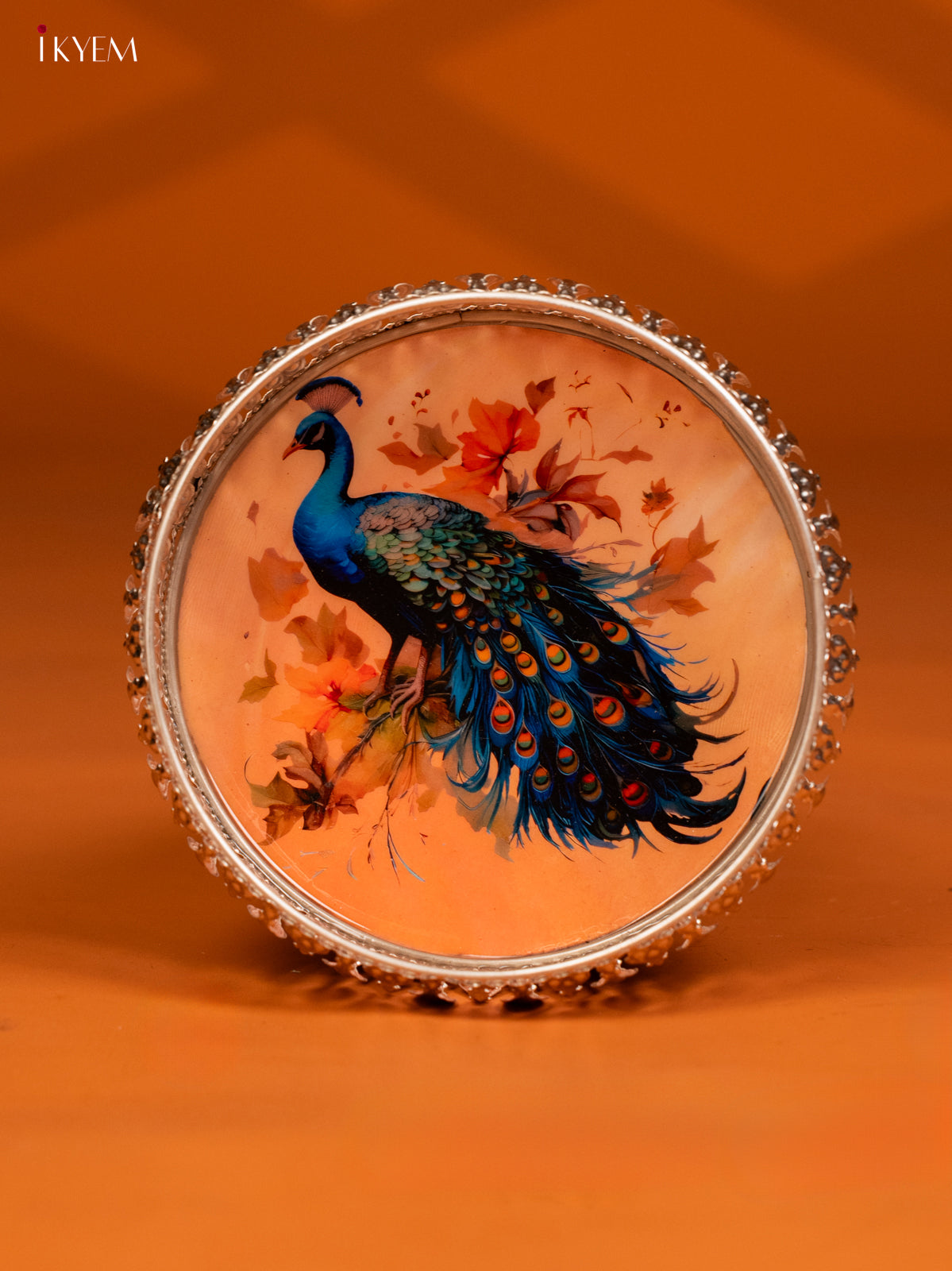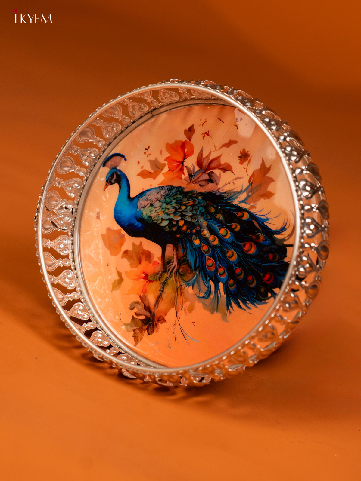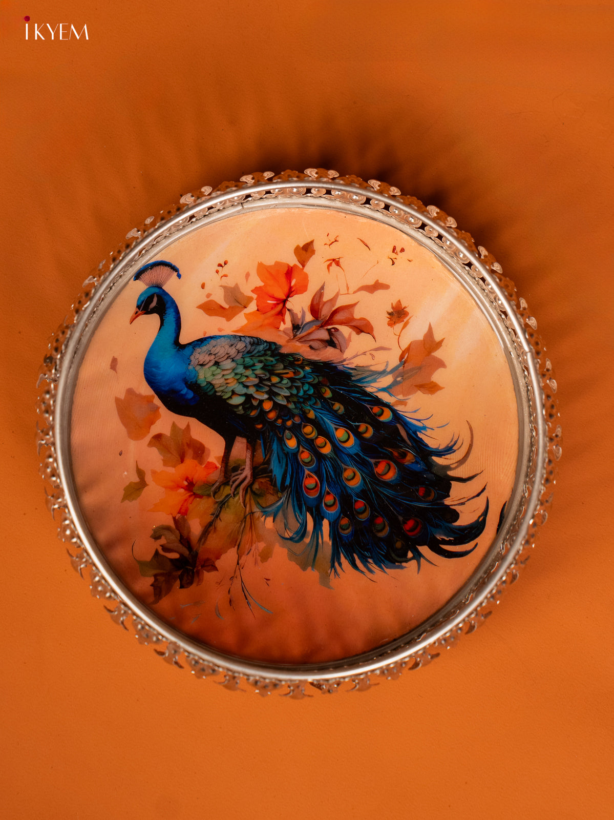 - Expertly crafted, this Digital Printed German Silver Tray boasts a stunning peacock design in vibrant peach.