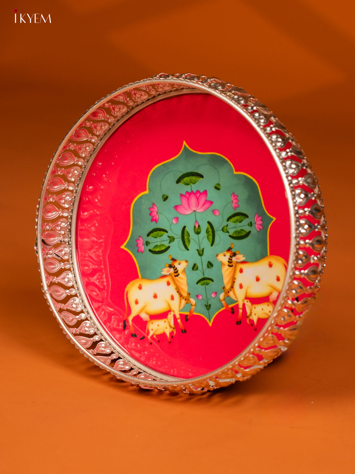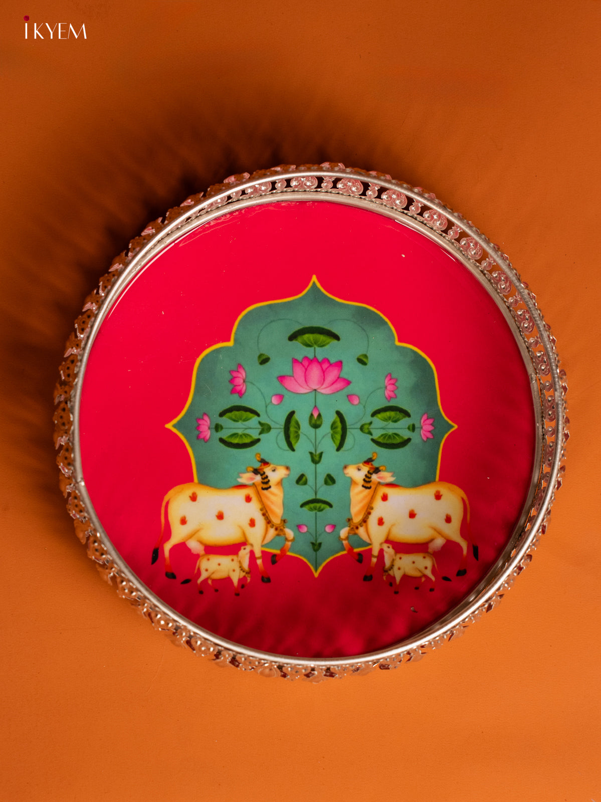 - Expertly crafted, this Digital Printed German Silver Tray boasts a stunning Cow & Calf design in vibrant pink.