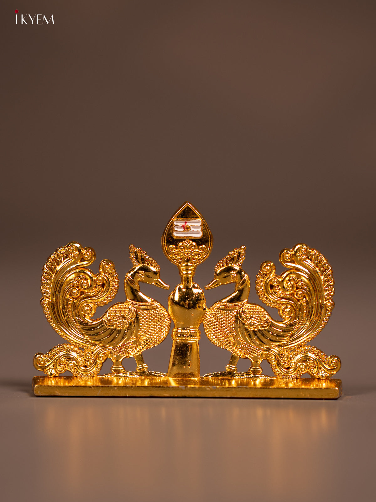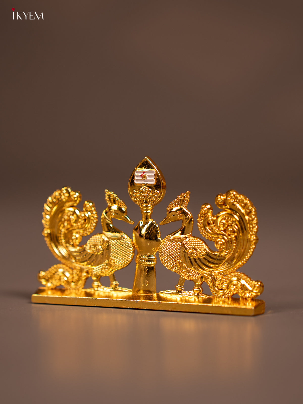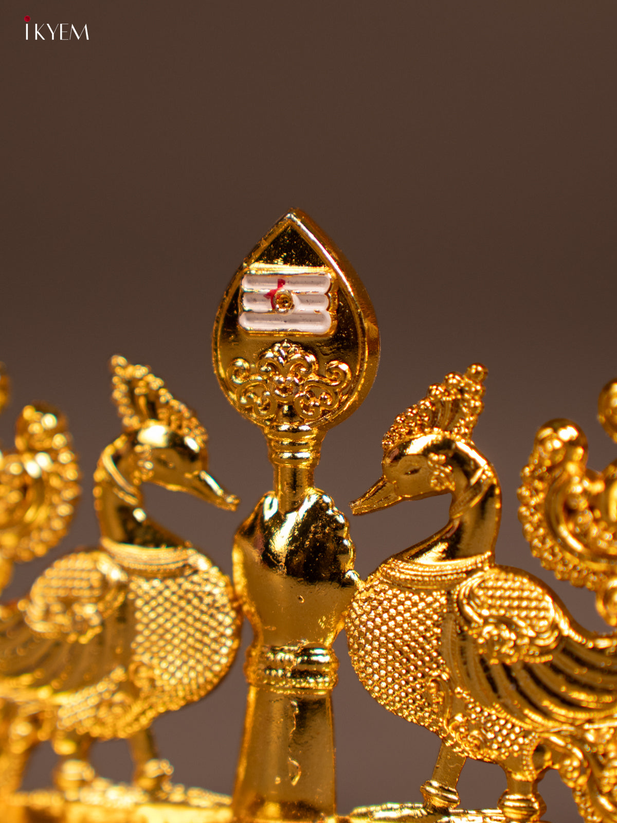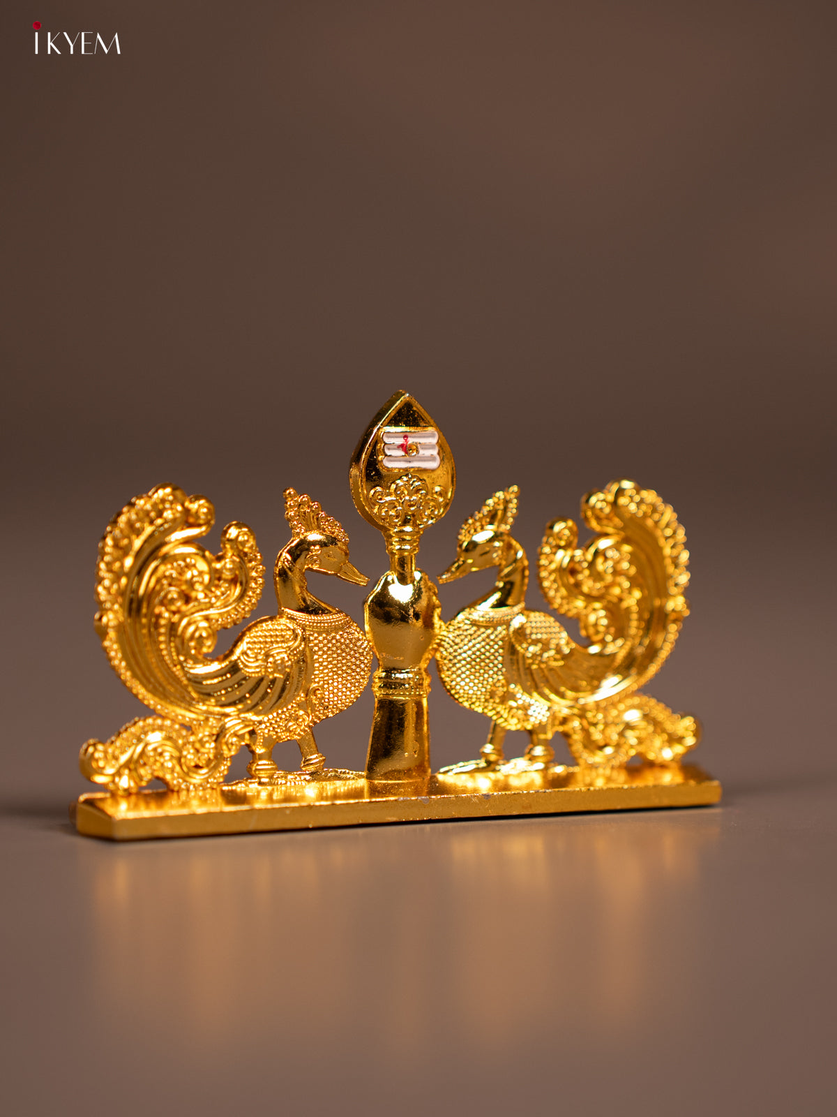 - This exquisite gold-plated Lord Murugan's OM Vel features an intricate peacock design, symbolizing divine protection.