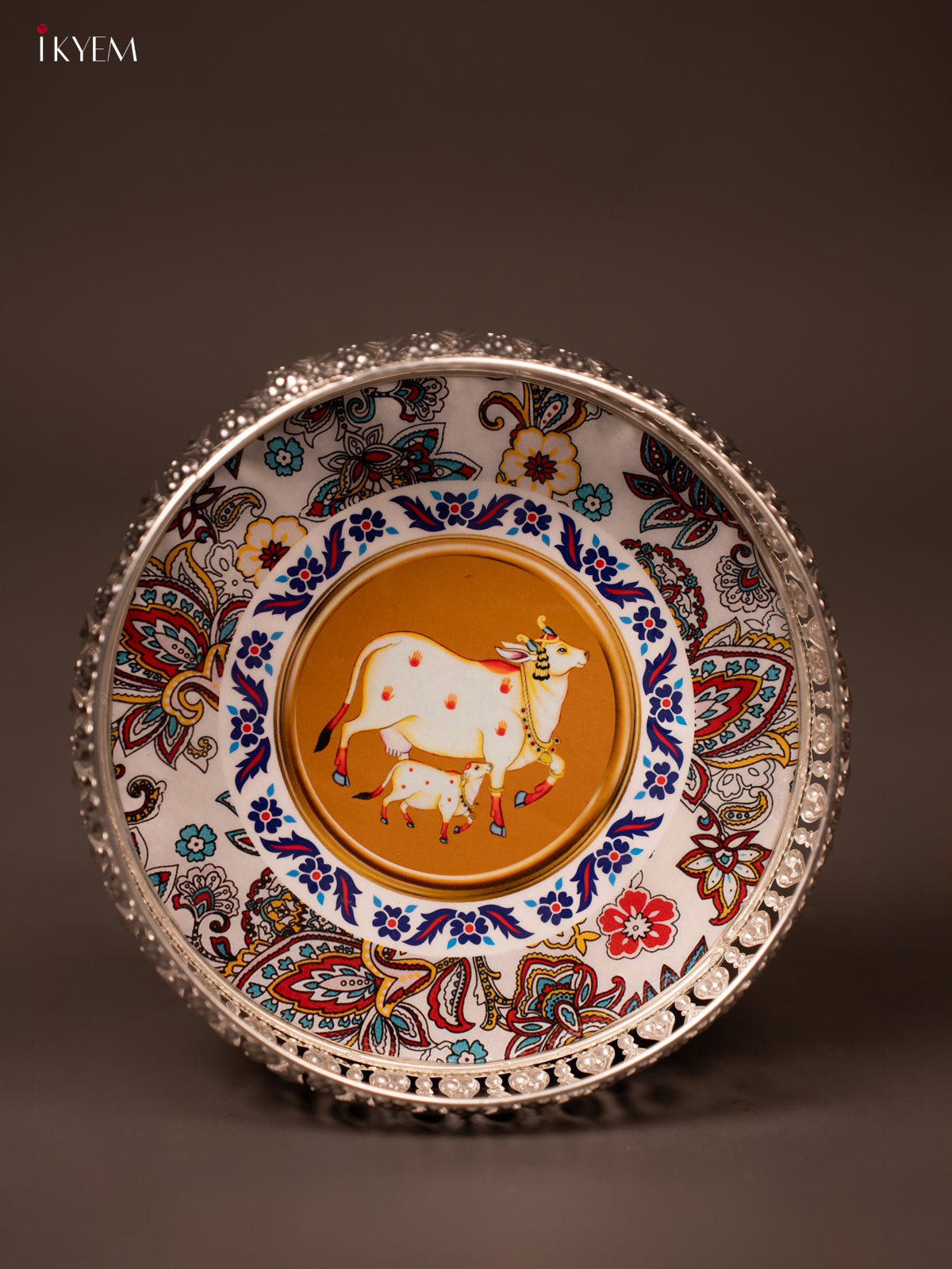 - This 8-inch German silver tray features a detailed digital print of Cow & Calf, perfect for enhancing pooja rituals and traditional ceremonies.