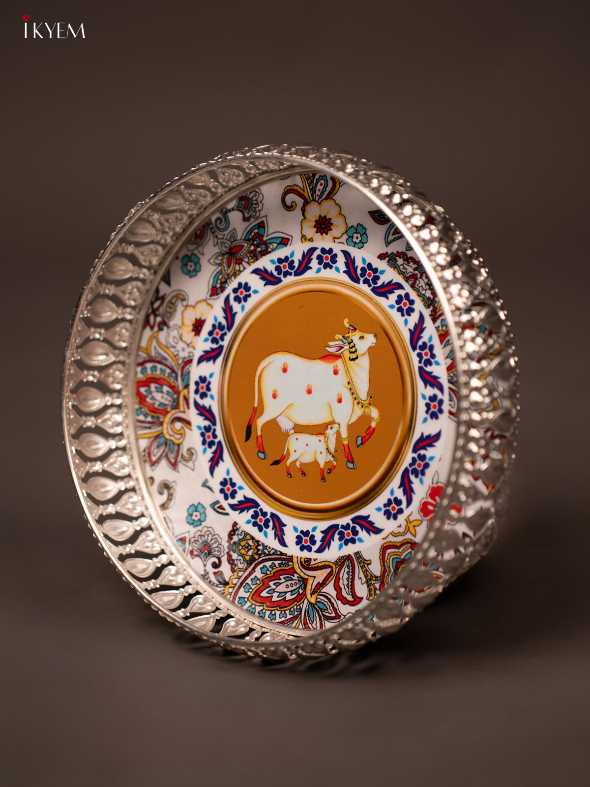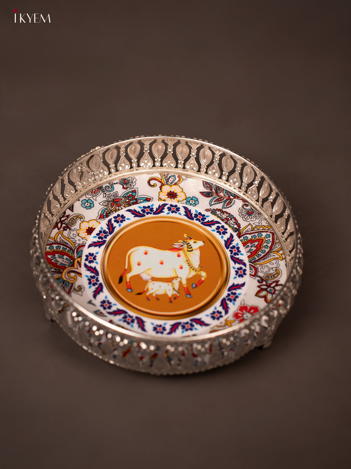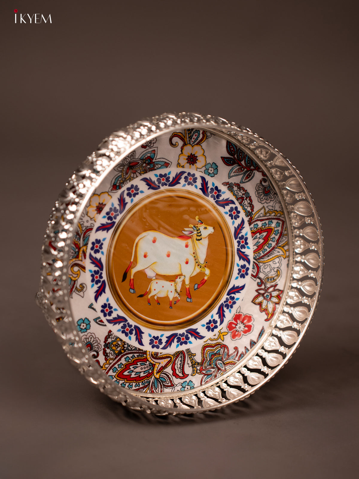 Cow & Calf Printed Multi Colour German Silver Tray - KF21154
