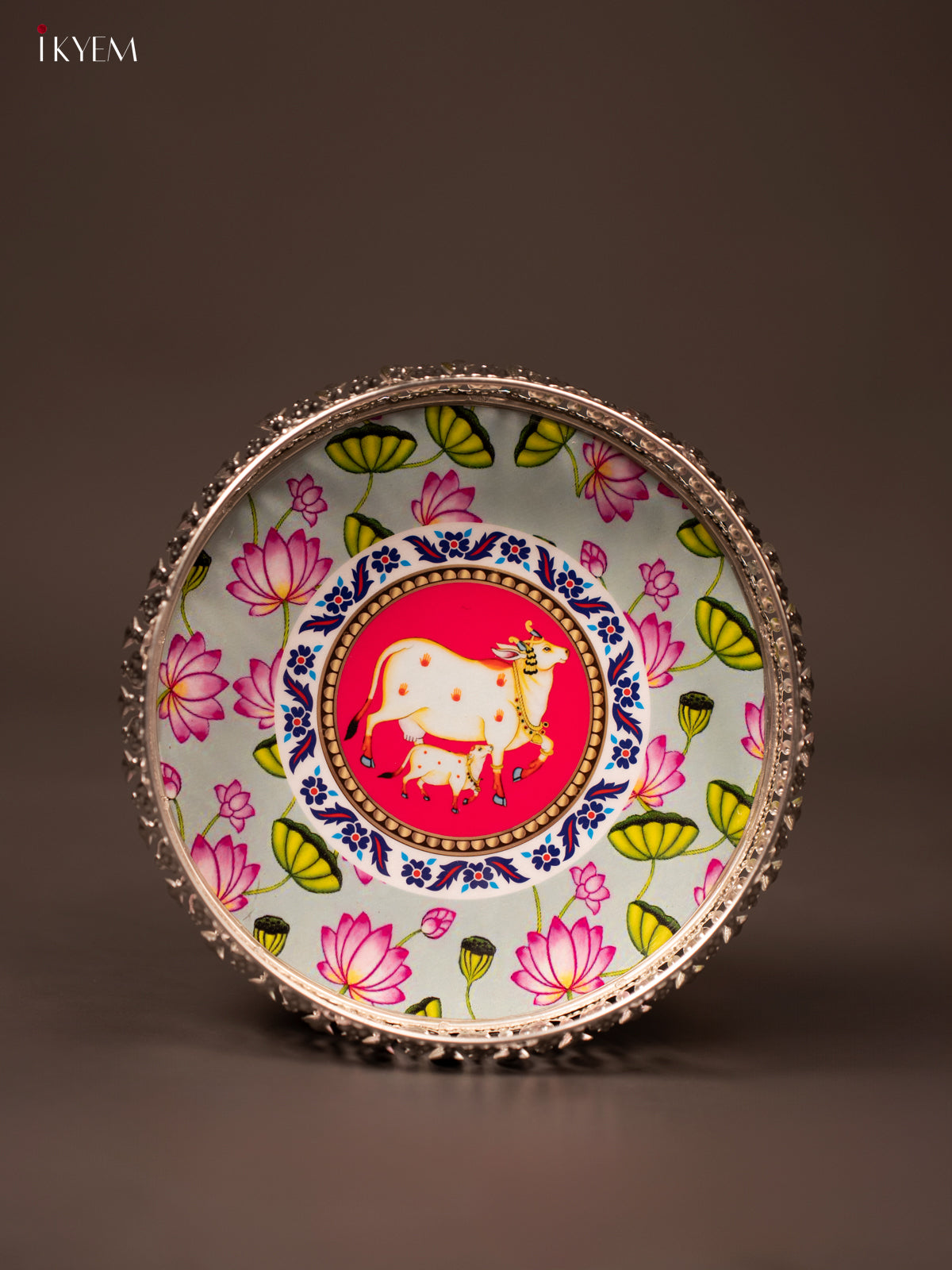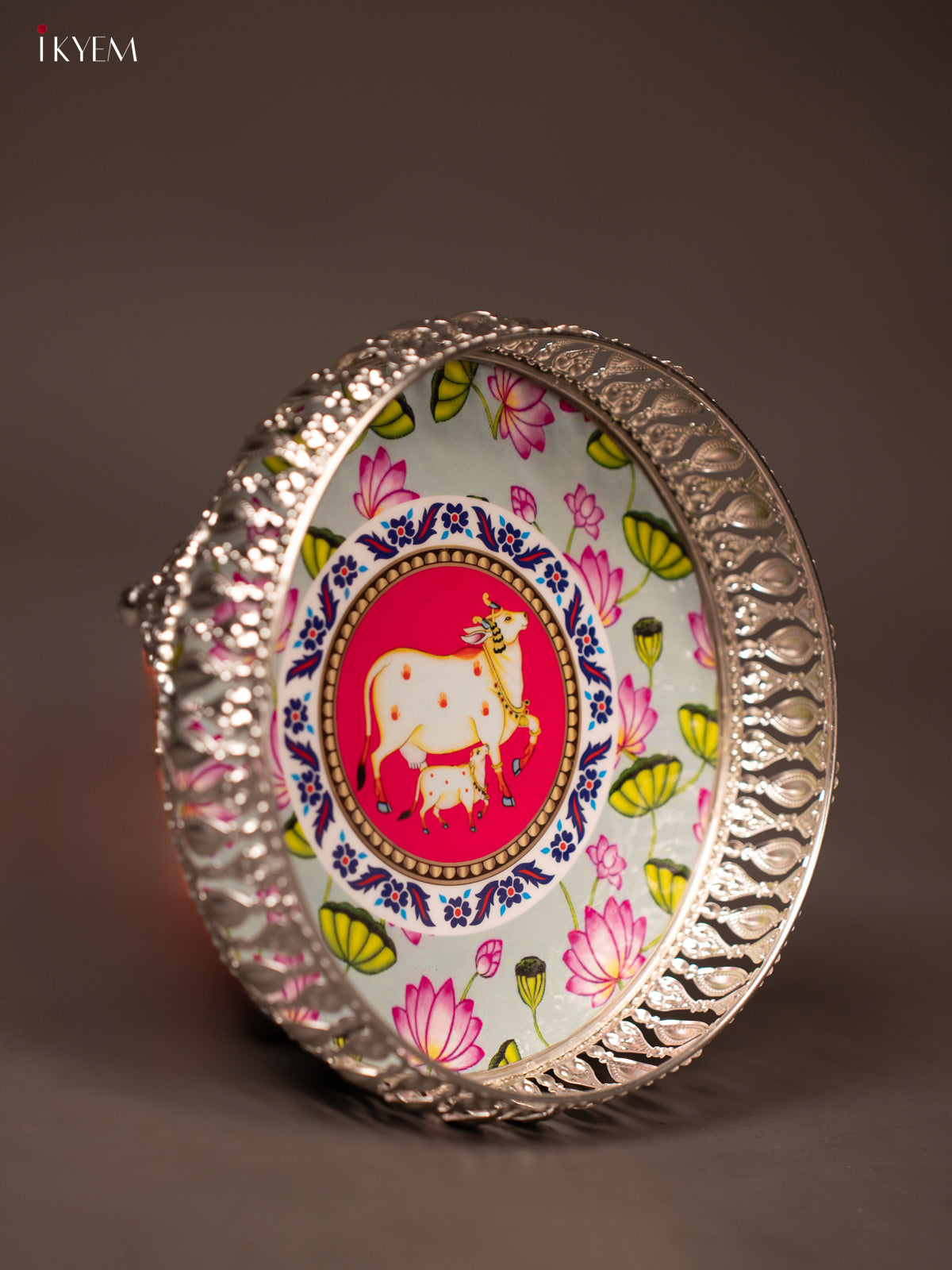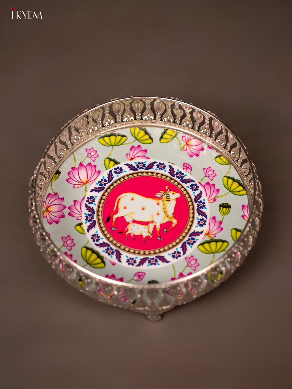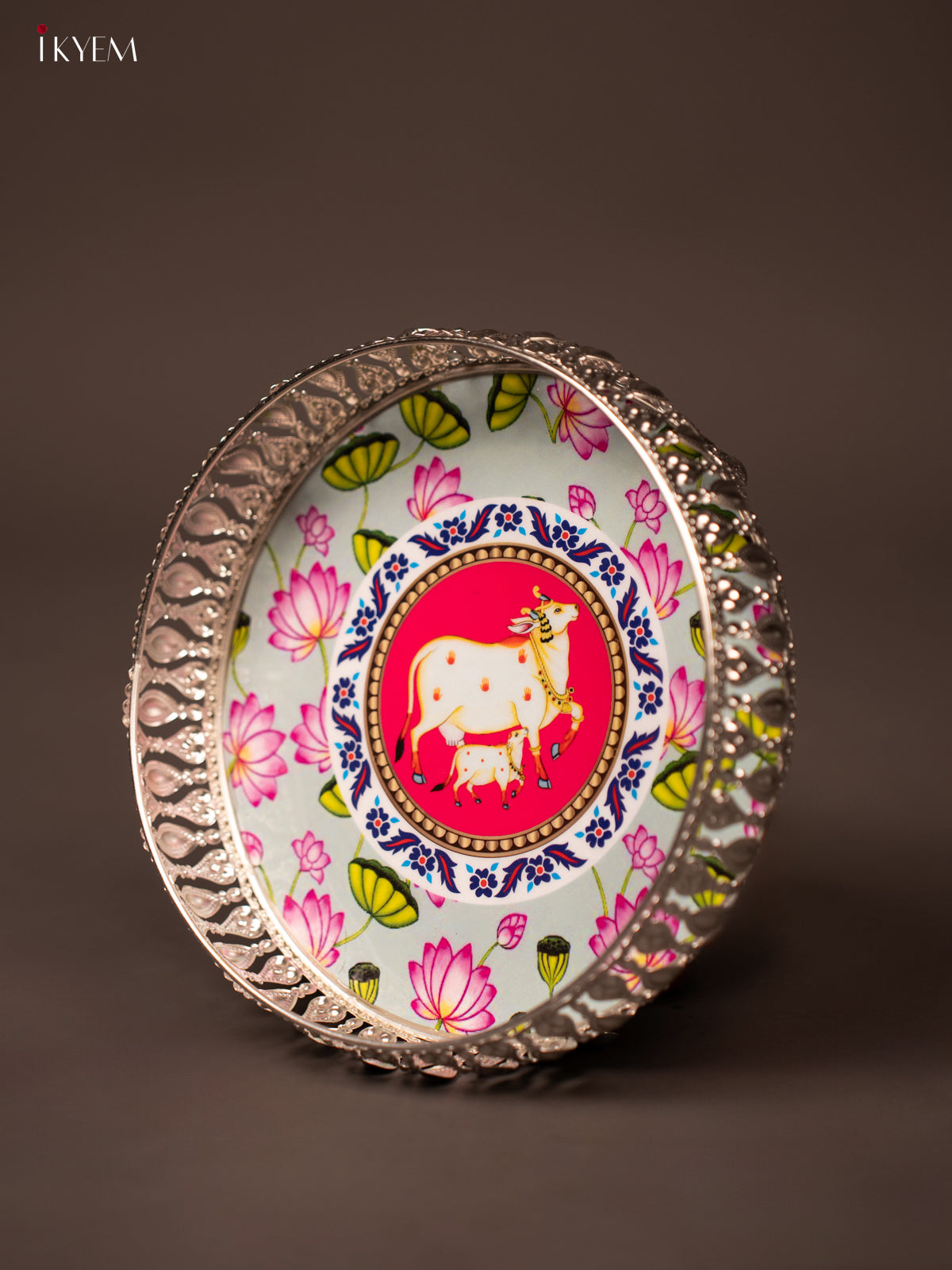 - This 8-inch German silver tray features a detailed digital print of Cow & Calf, perfect for enhancing pooja rituals and traditional ceremonies.