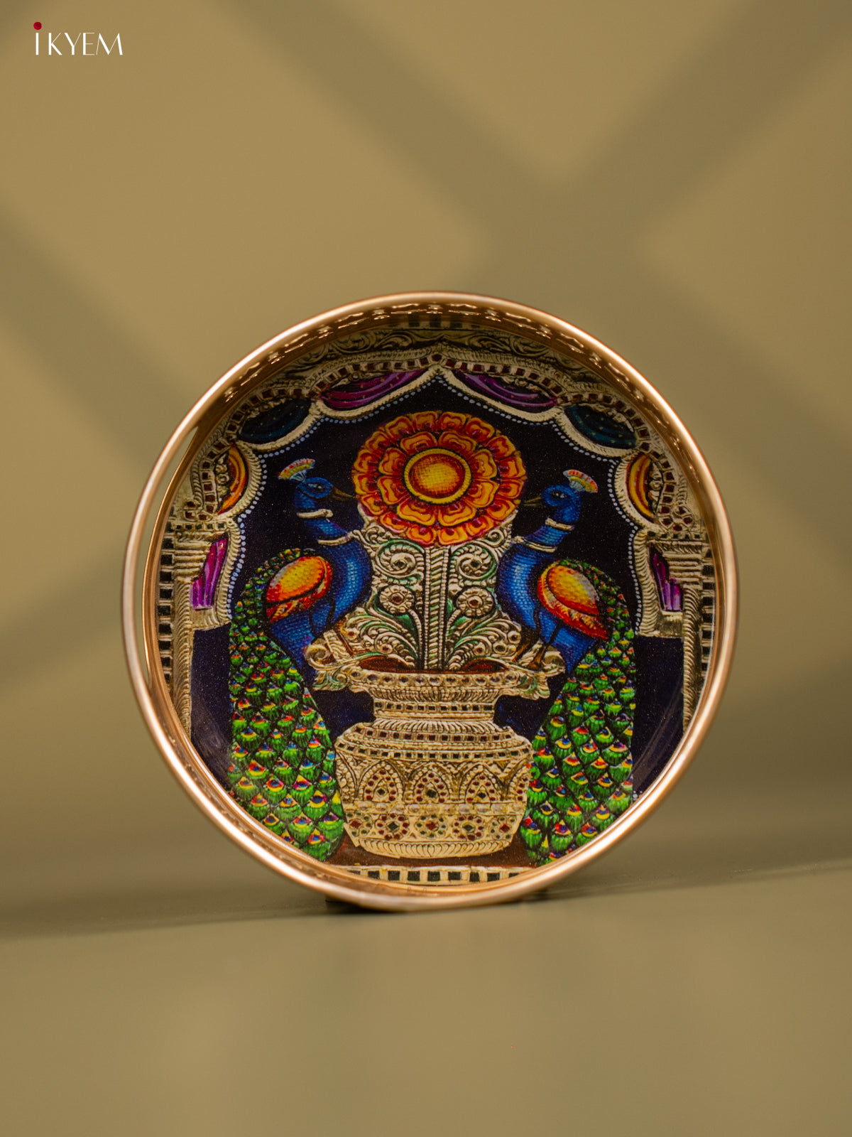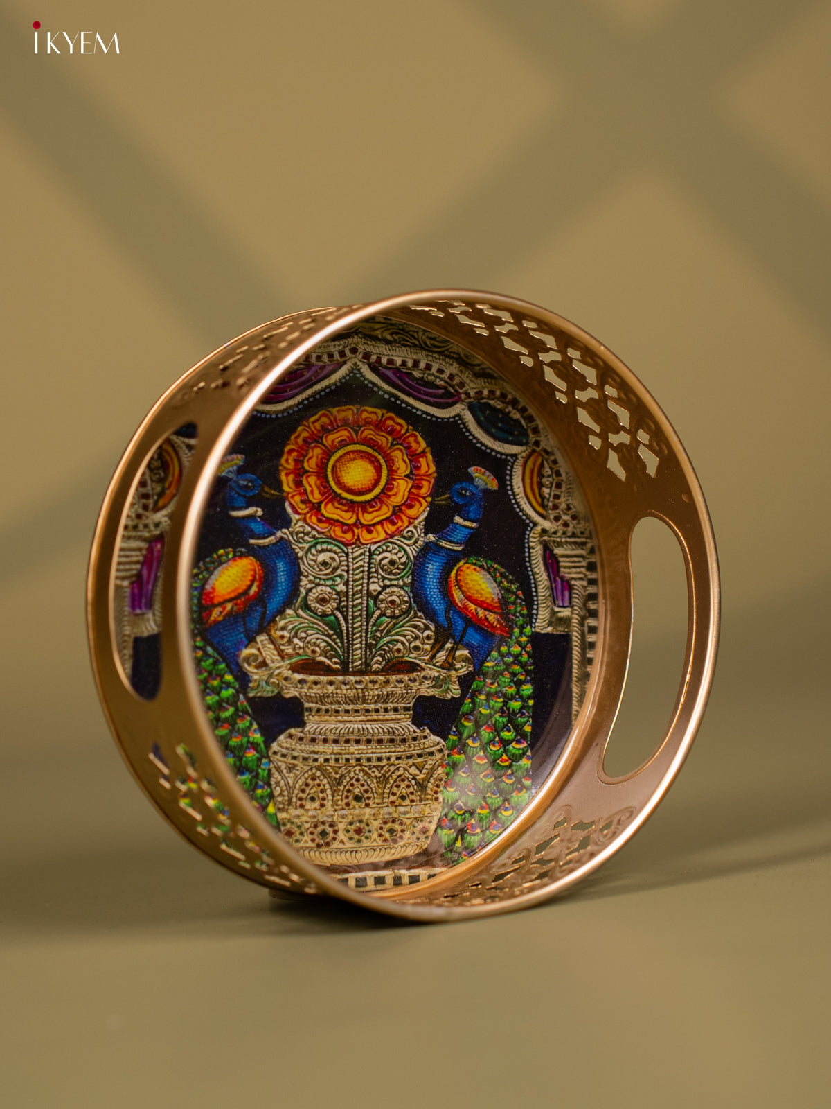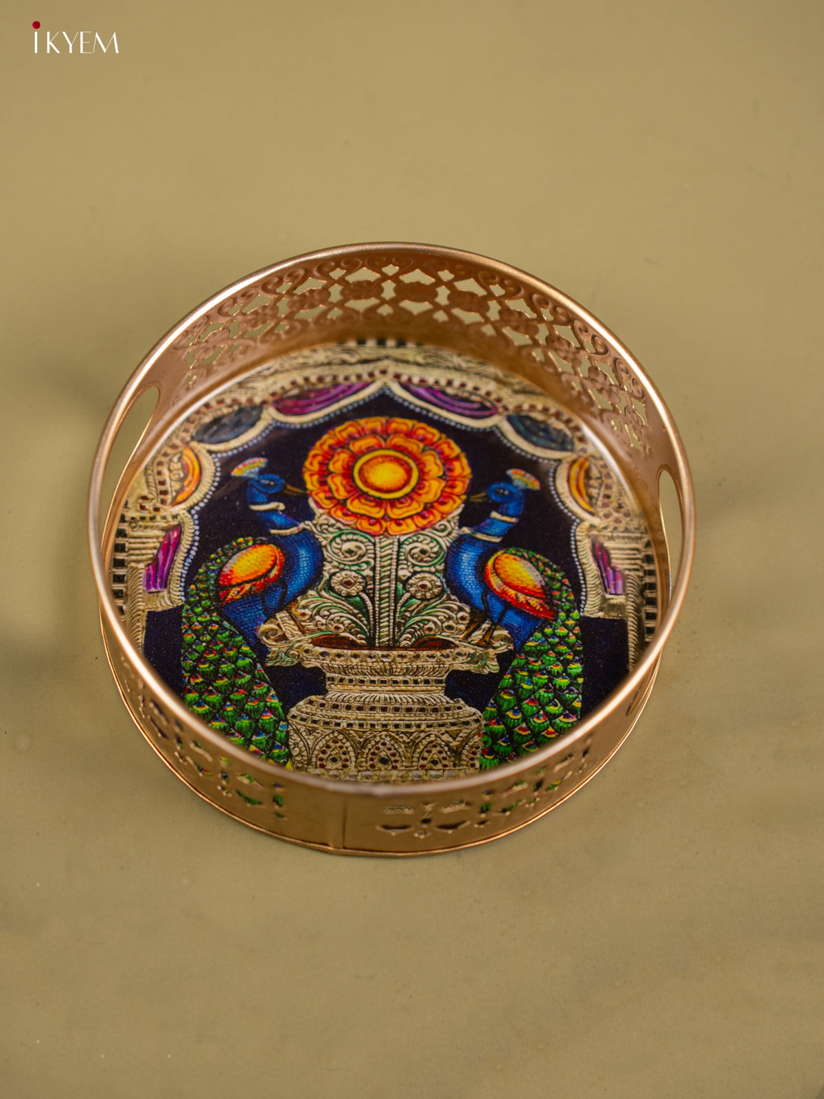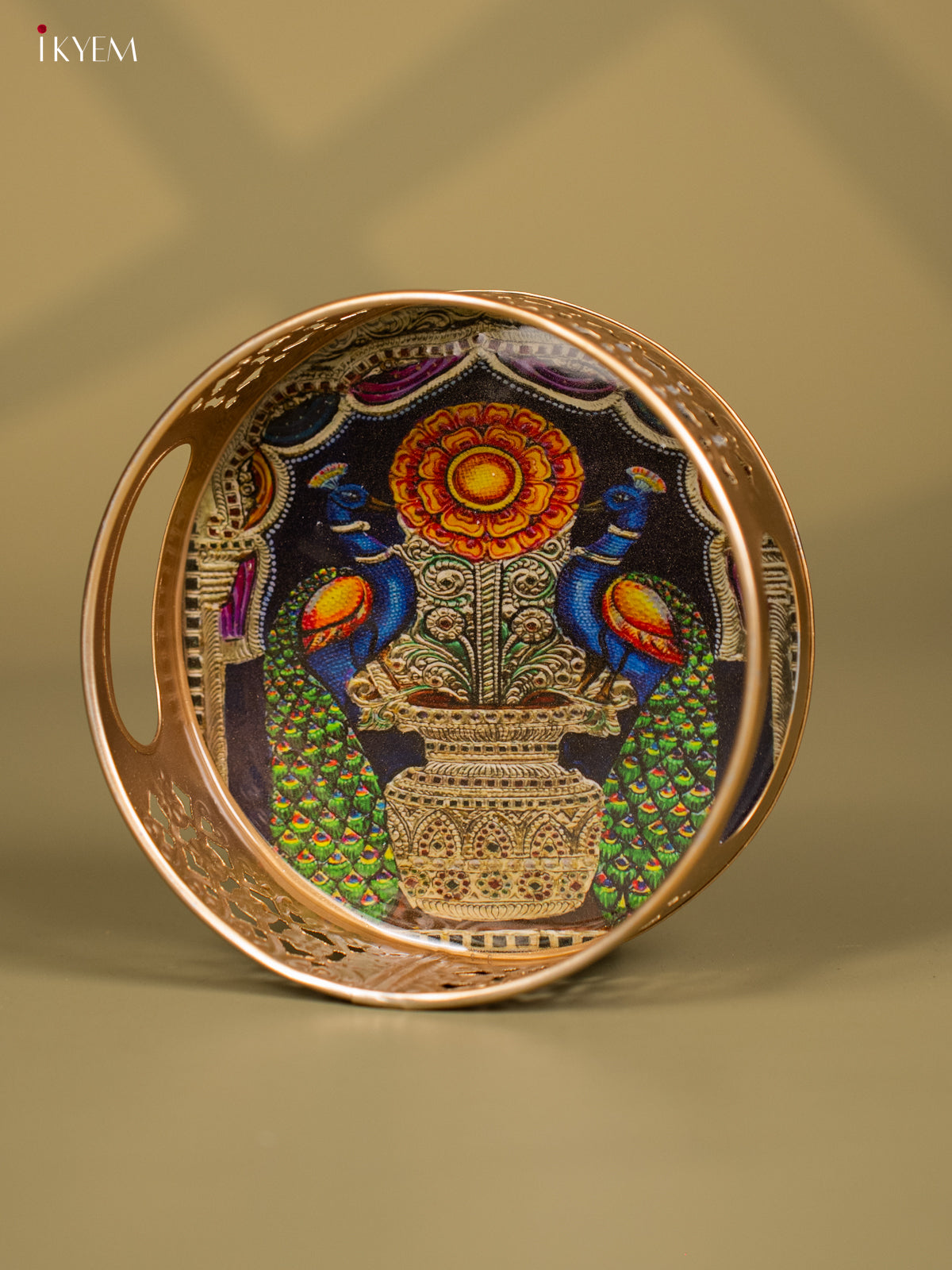- This 6-inch round metal tray features a stunning print of two majestic peacocks flanking a decorative vase with a blooming flower, symbolizing beauty, grace, and prosperity.