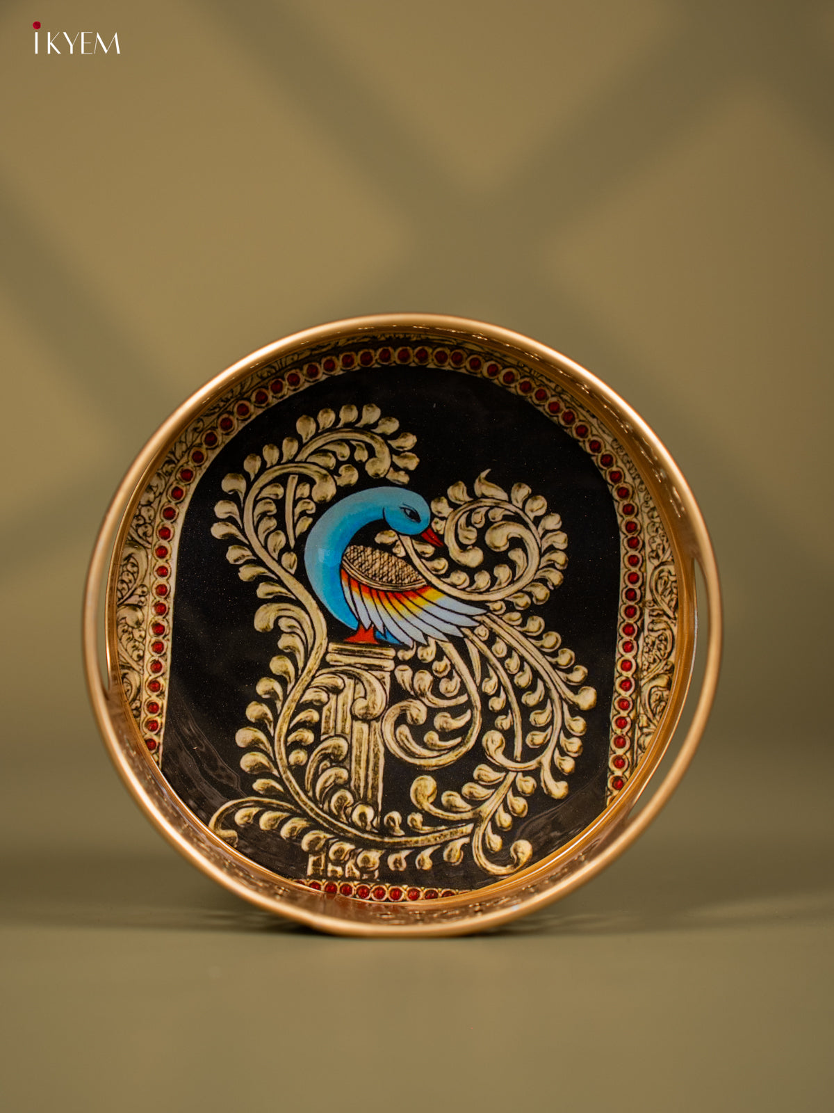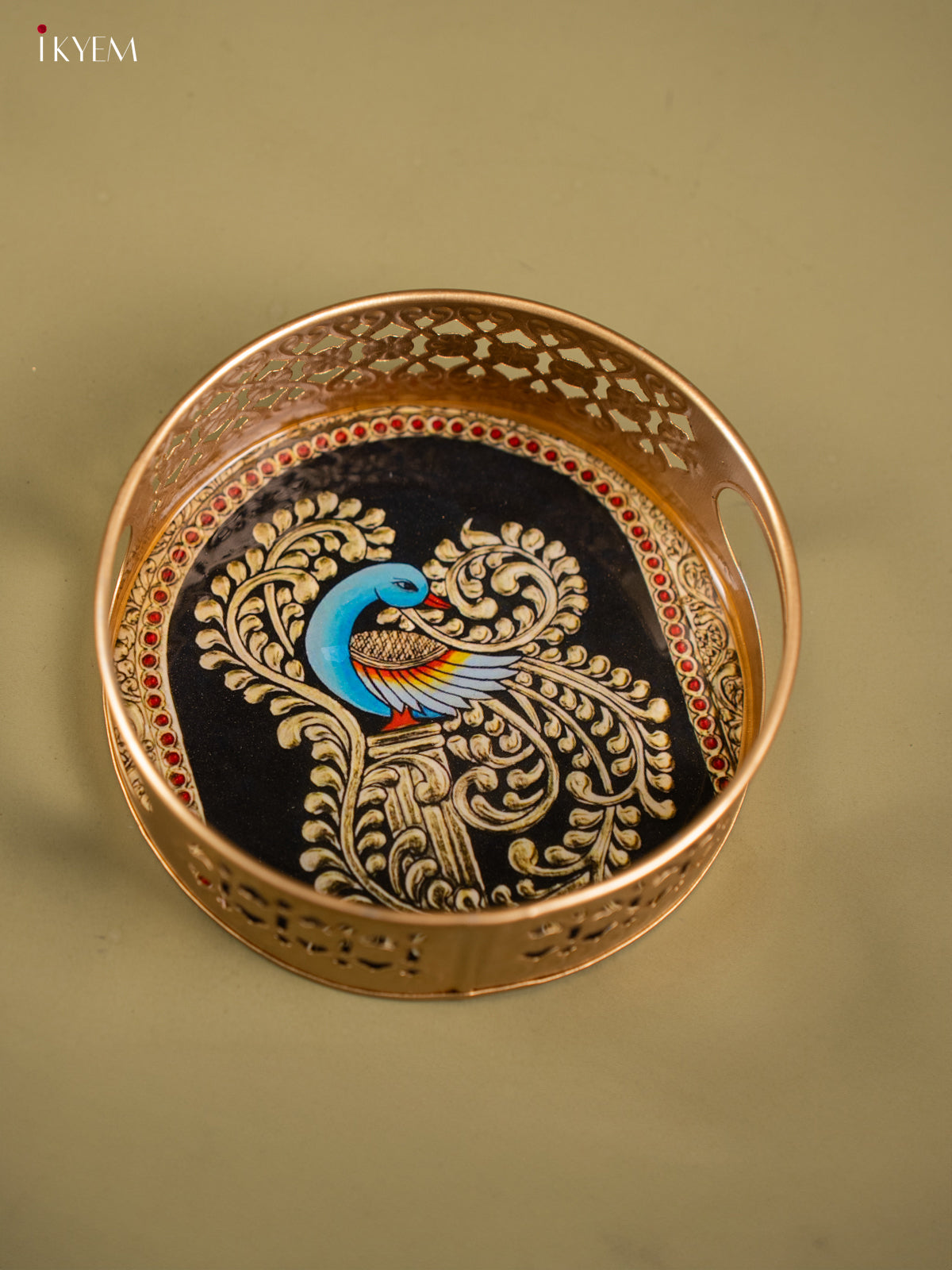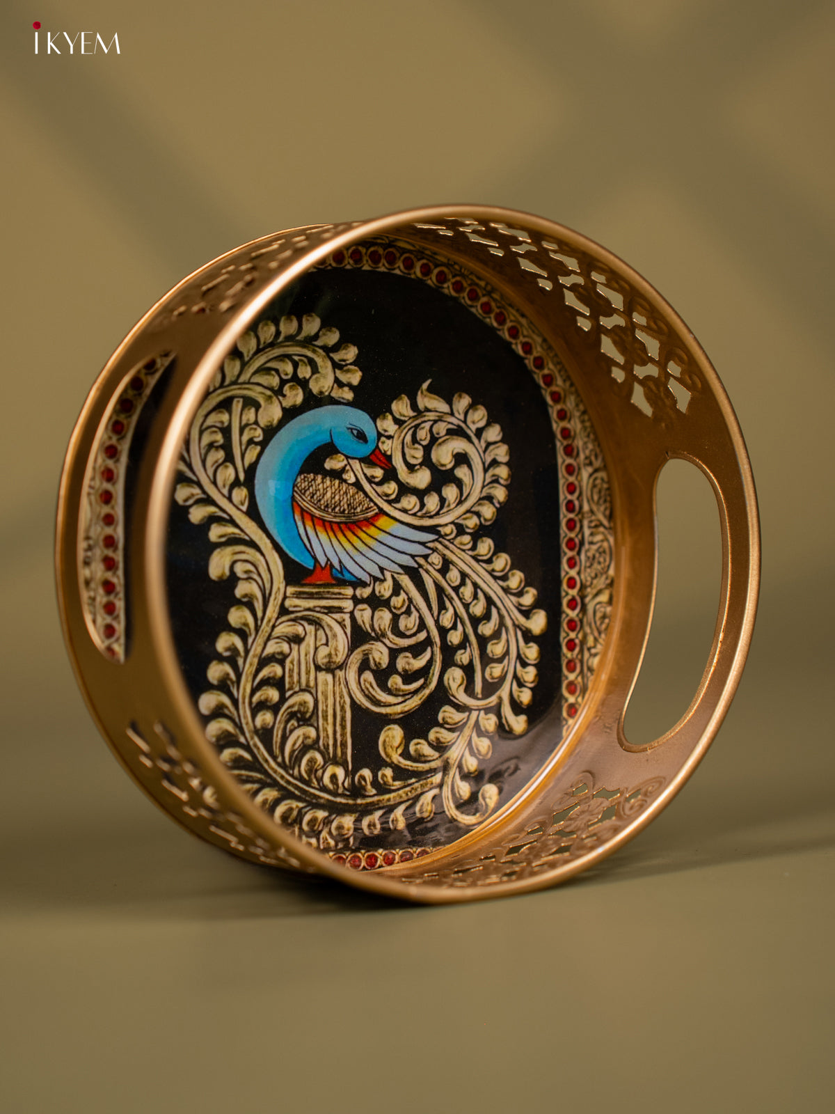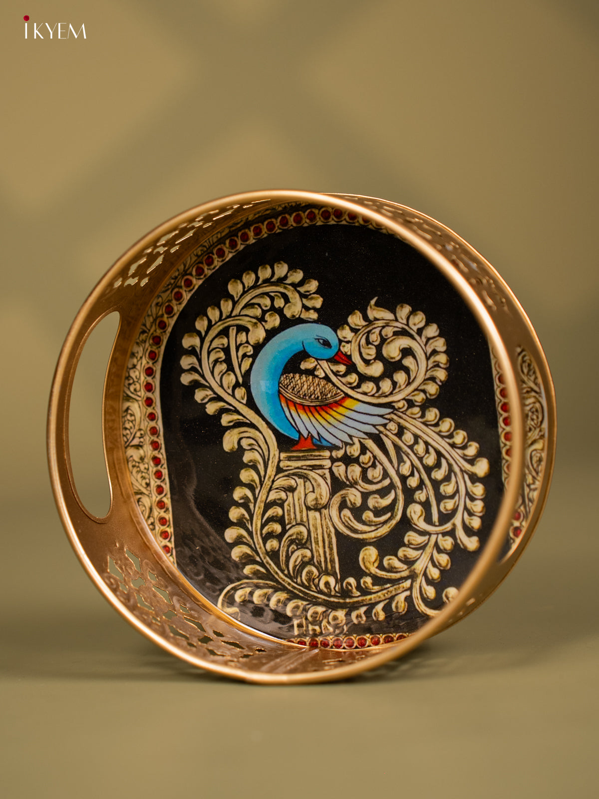 - This 6-inch round metal tray features a traditional Peacock design, perfect for pooja ceremonies and religious offerings.