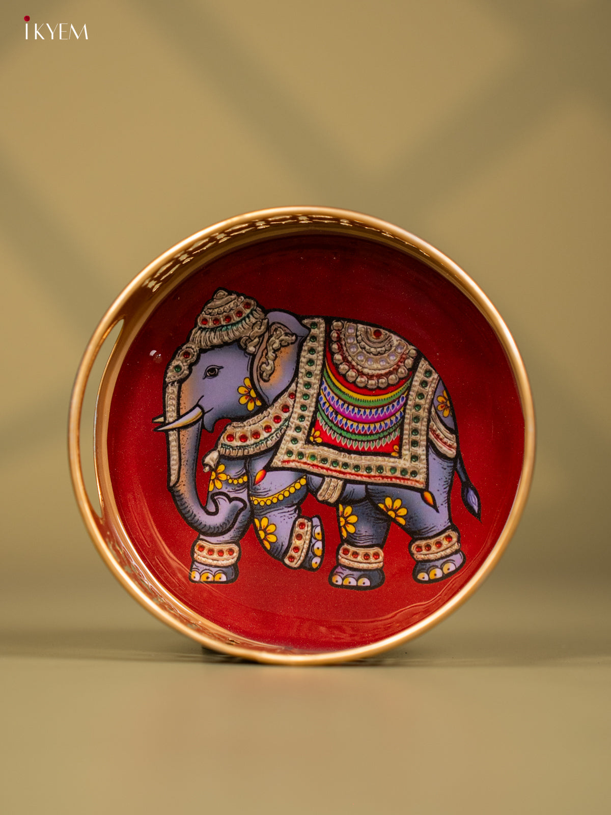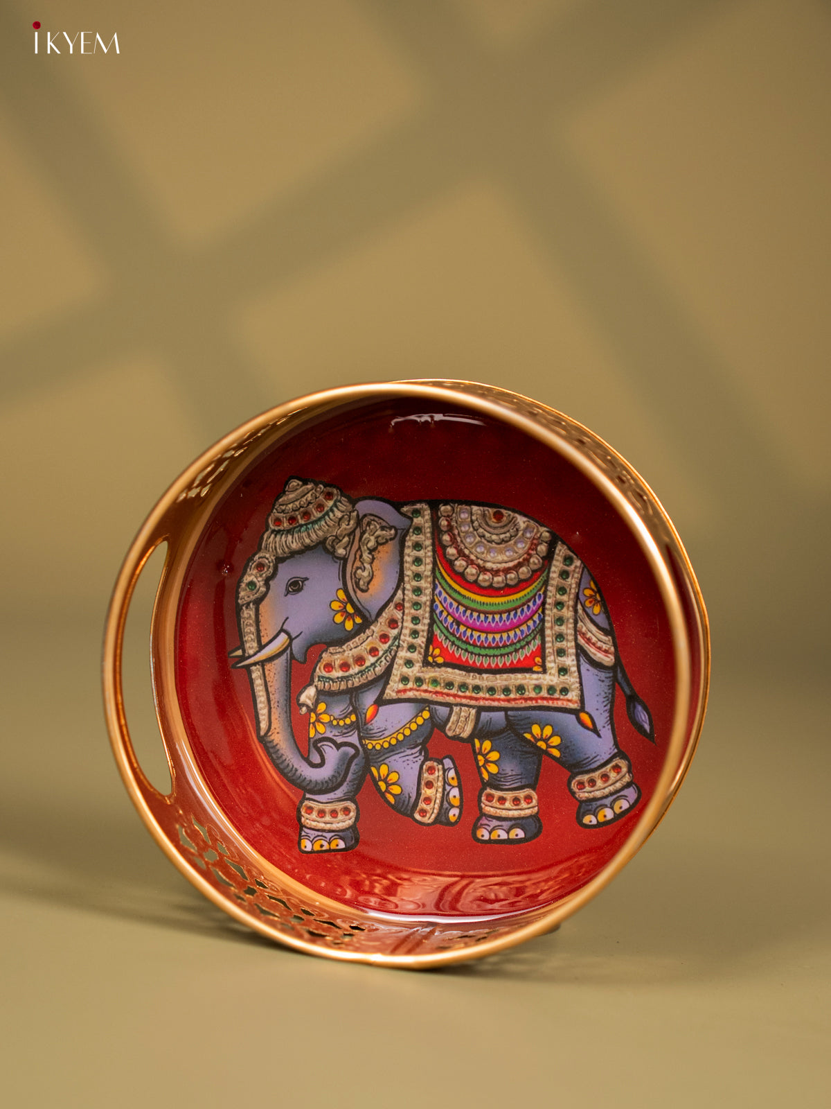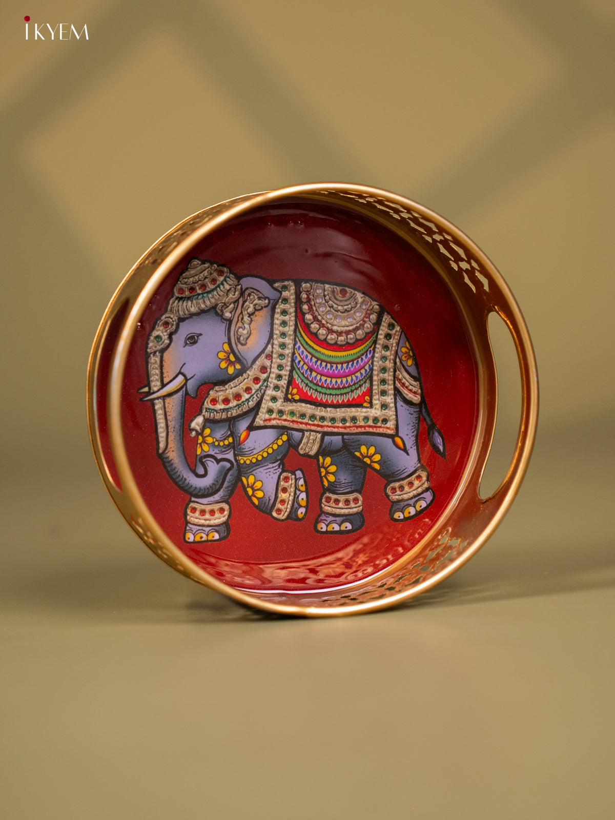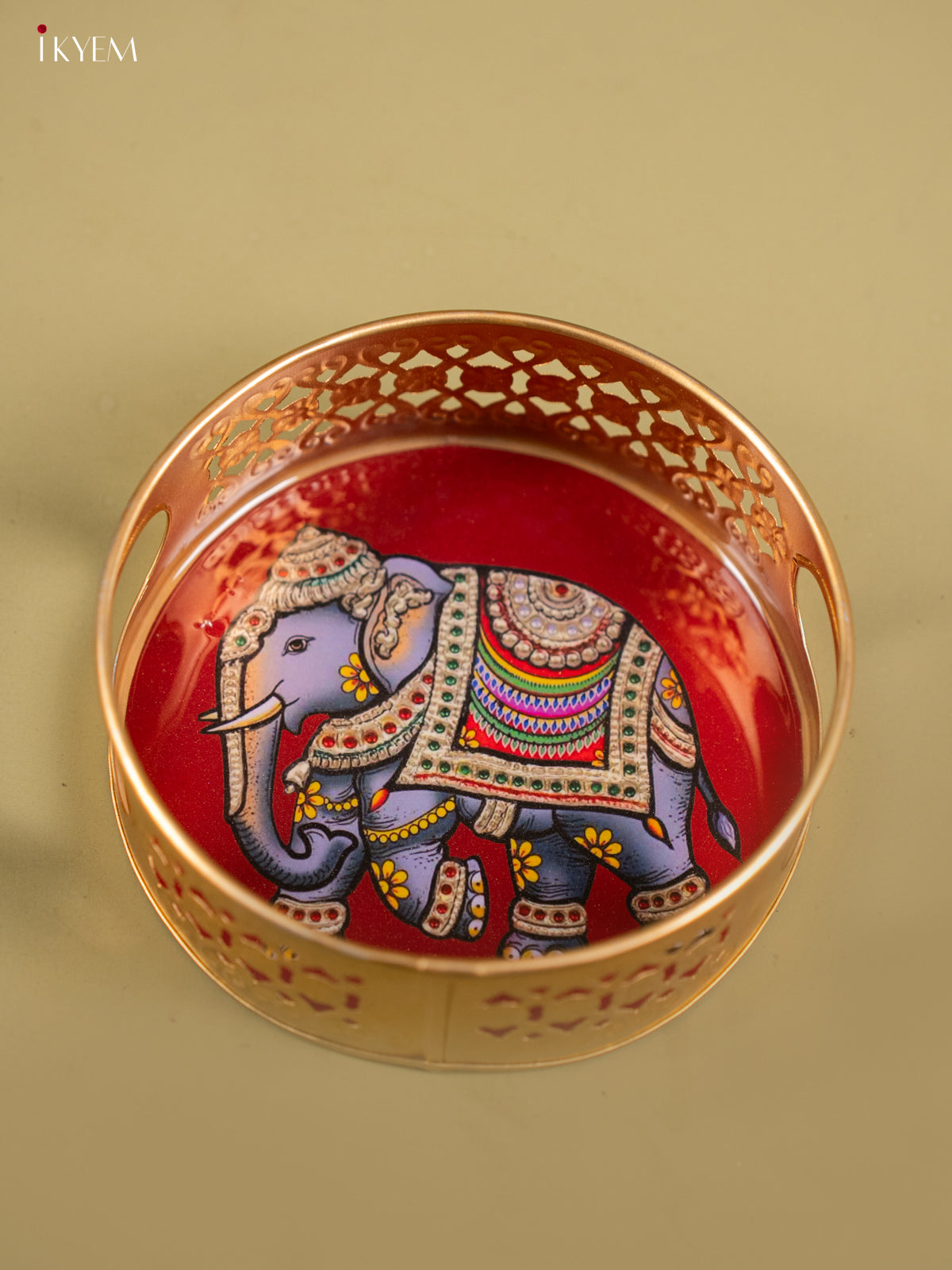 - This 6-inch round metal tray features a traditional Elephant design, perfect for pooja ceremonies and religious offerings.