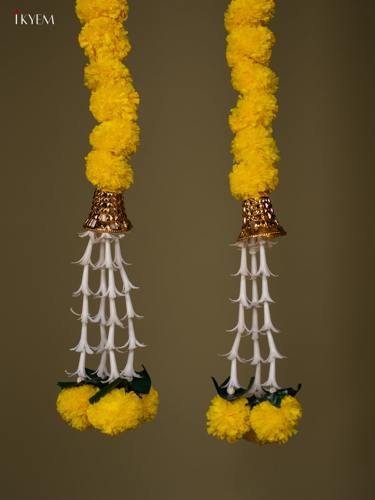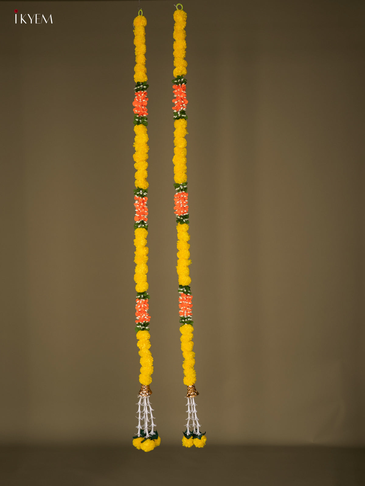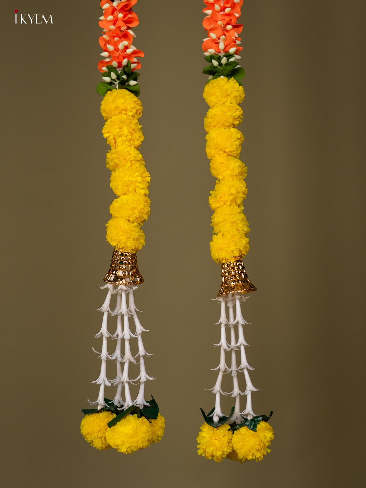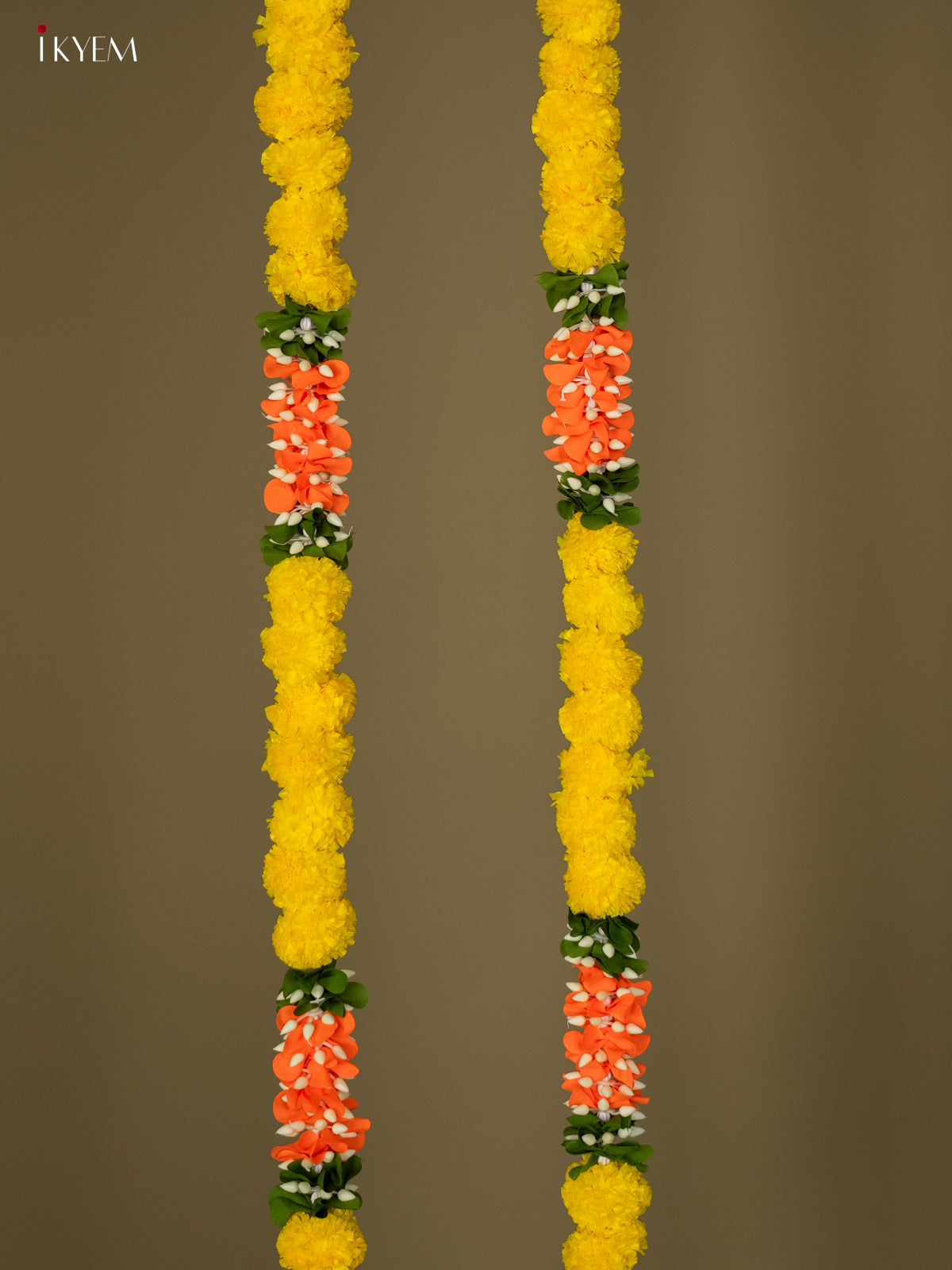 - Enhance your festive and ceremonial spaces with this Artificial Flowers Toran in orange and yellow.