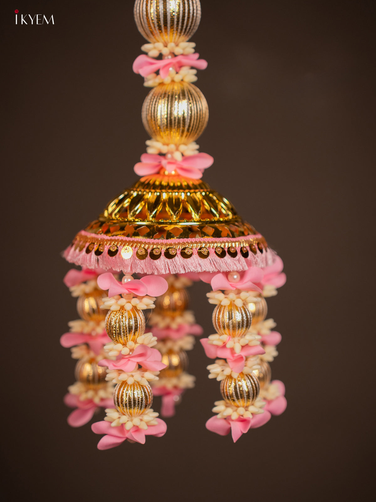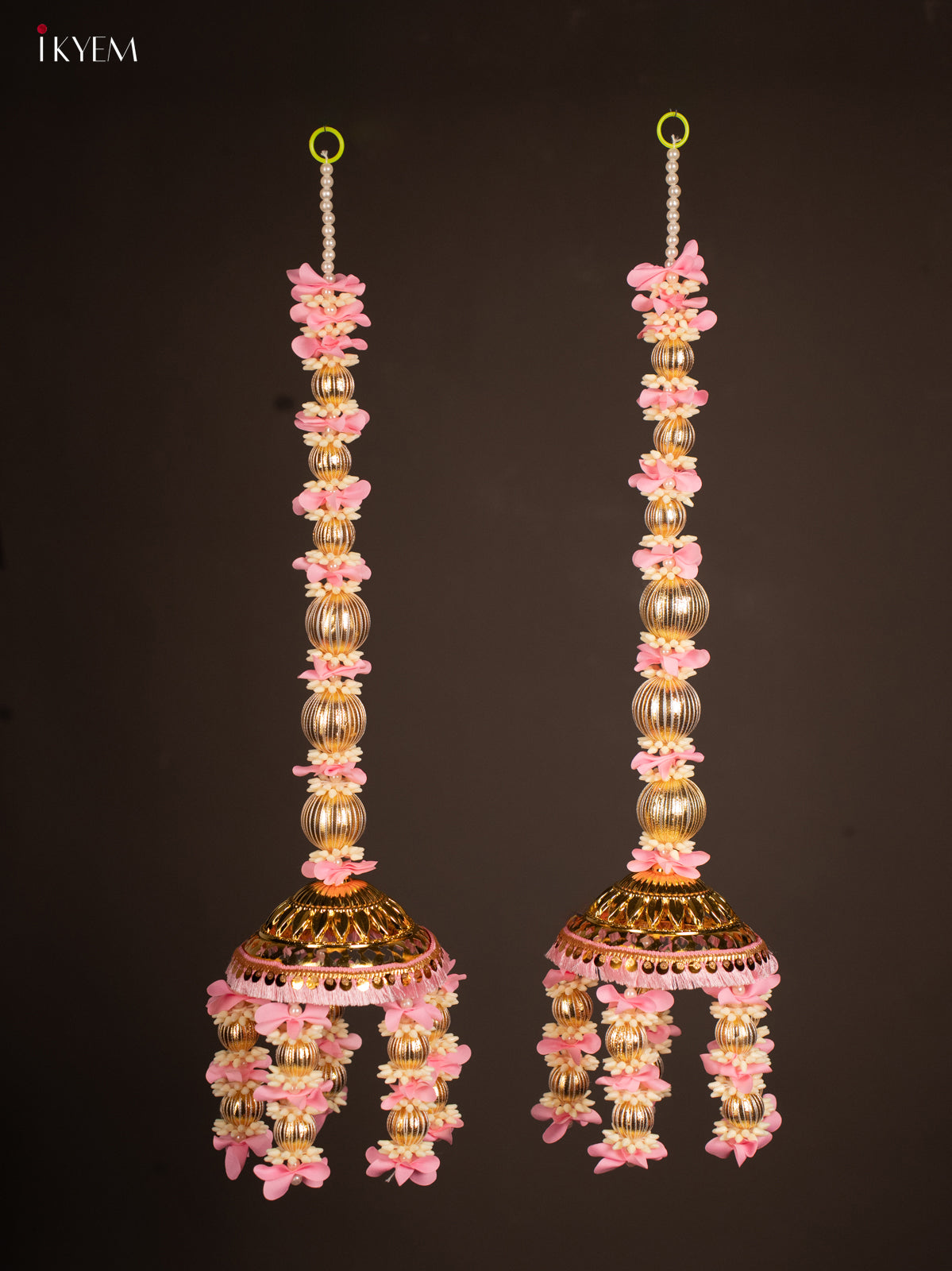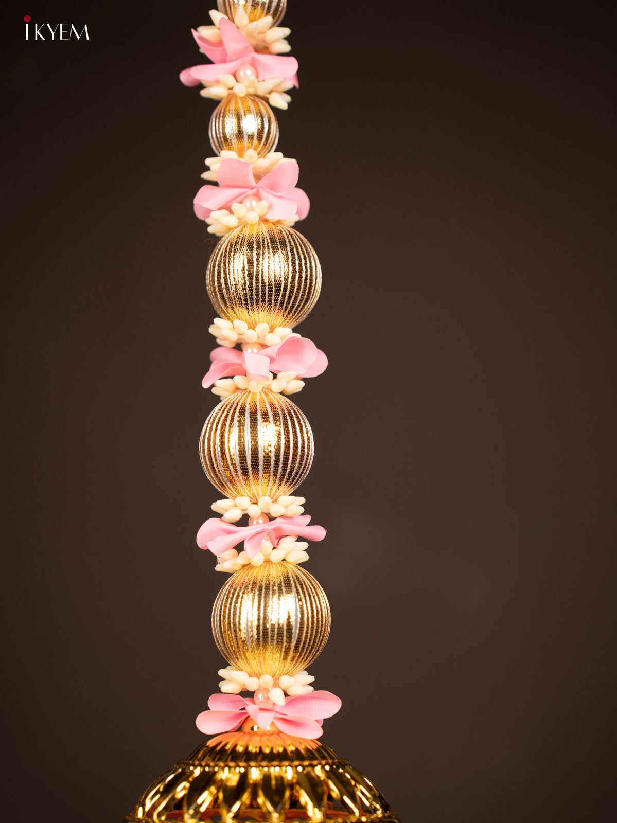 - Enhance your festive and ceremonial spaces with this Artificial Flowers Toran in gold and light Pink.
