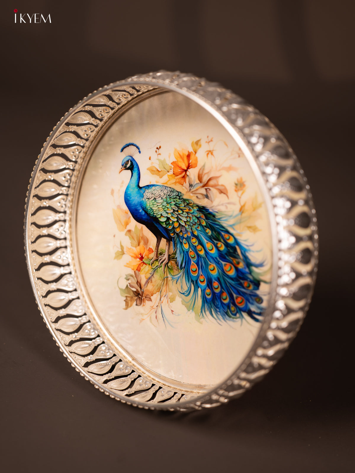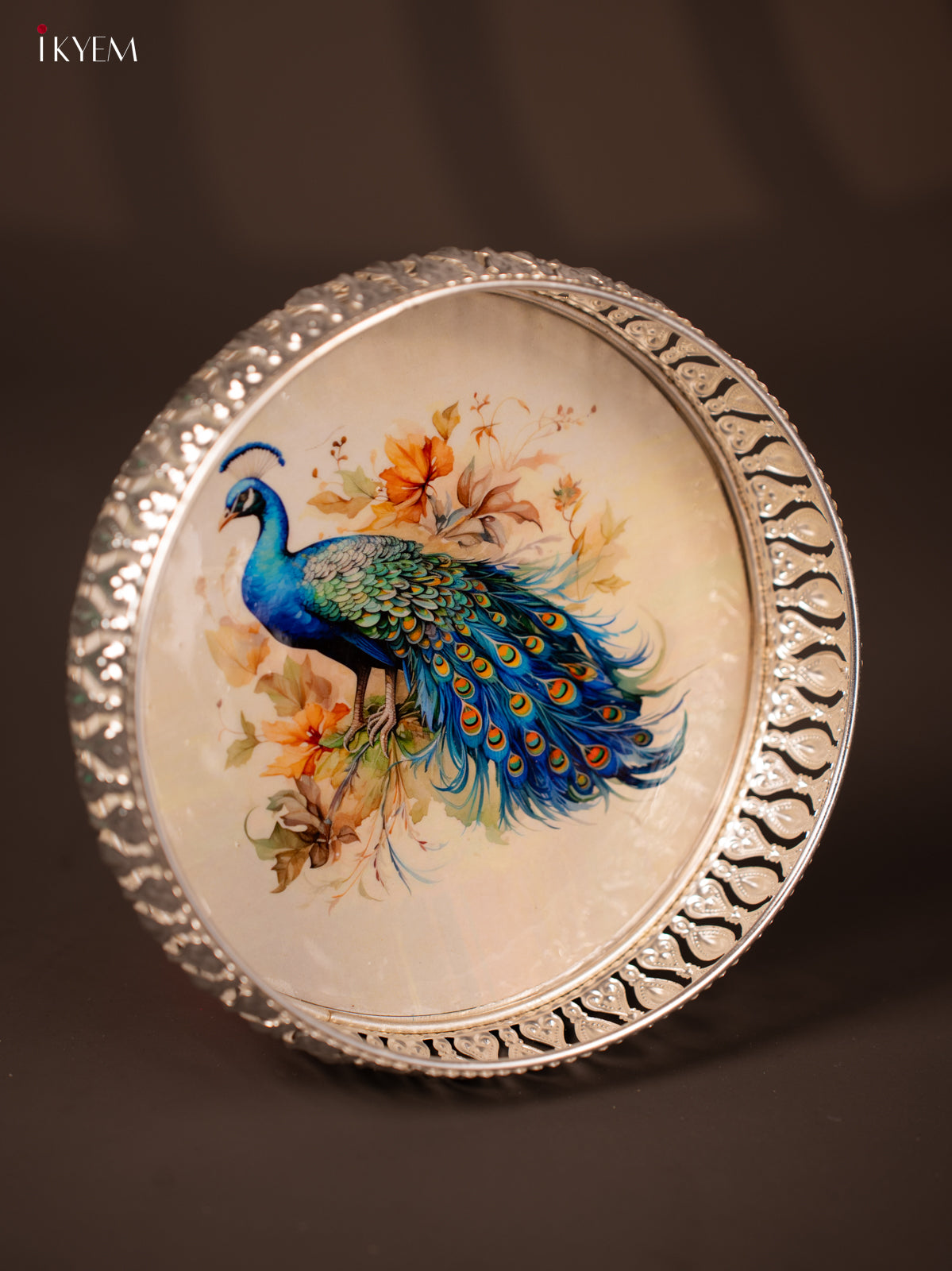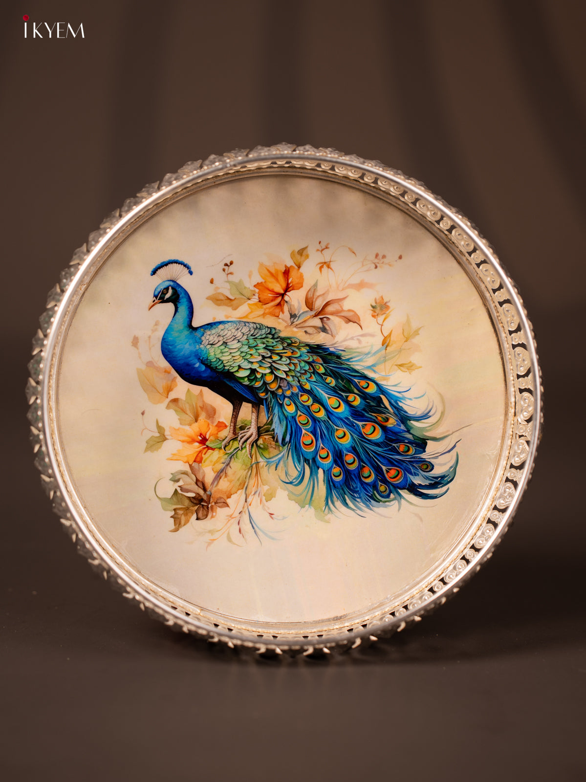 - This 8-inch German silver tray features a vibrant digital print of a peacock, blending traditional artistry with modern design.