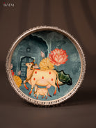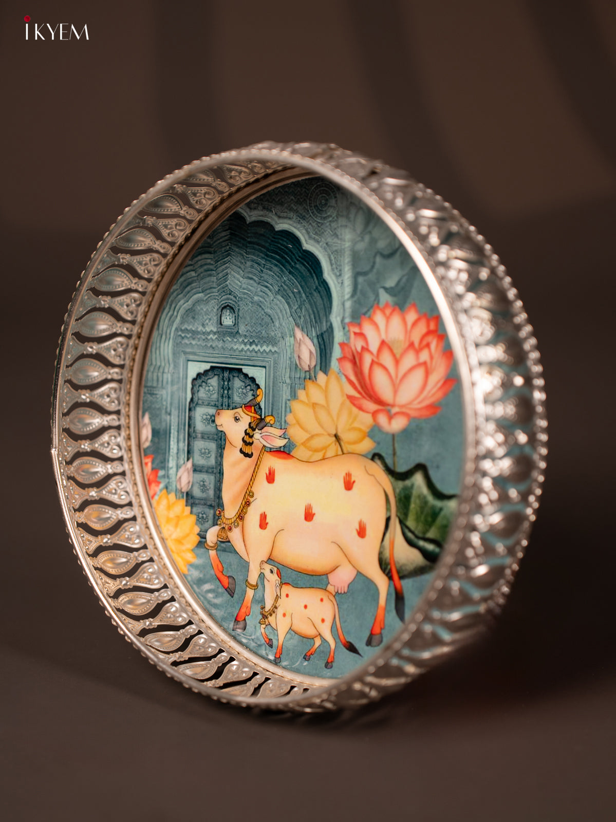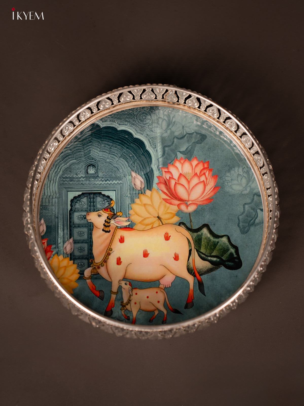 - This 8-inch German silver tray features a digitally printed design of a cow and calf in teal, blending traditional motifs with modern craftsmanship.