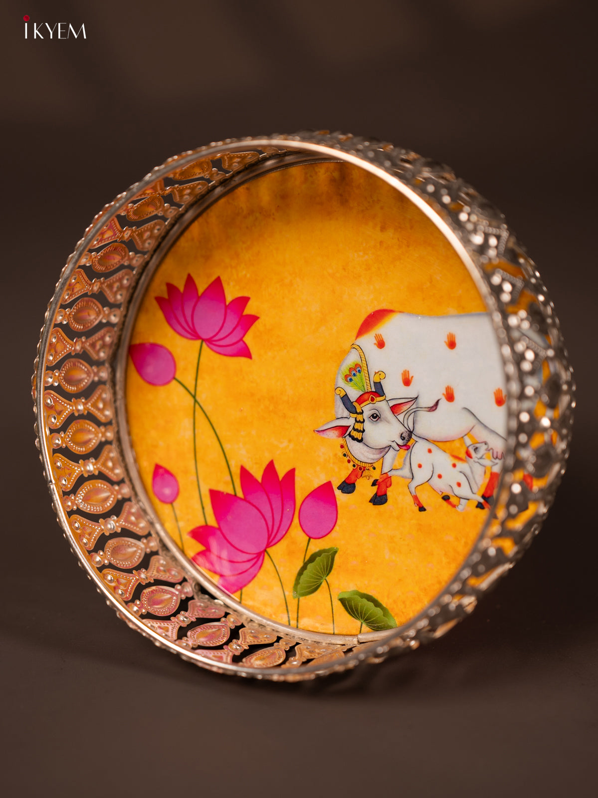 - This 6-inch German silver tray features a vibrant digital print of a cow and calf in yellow, blending traditional motifs with modern craftsmanship.