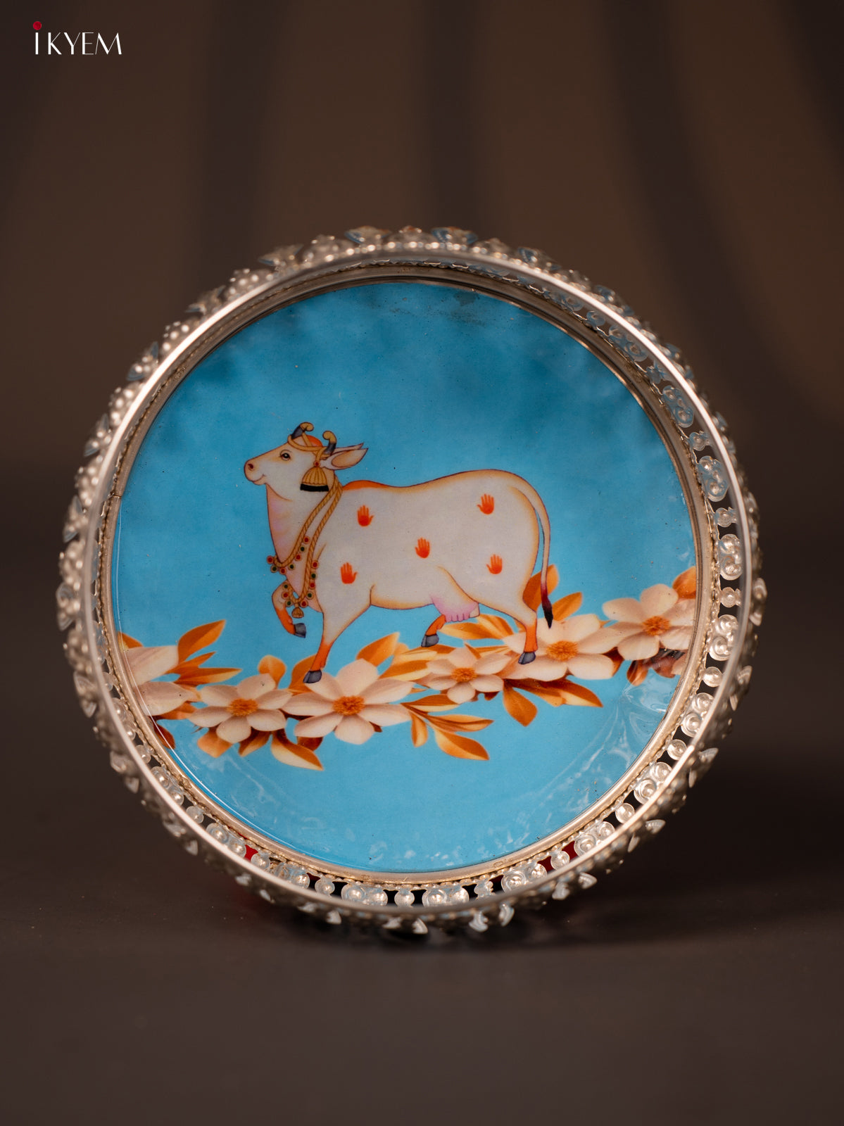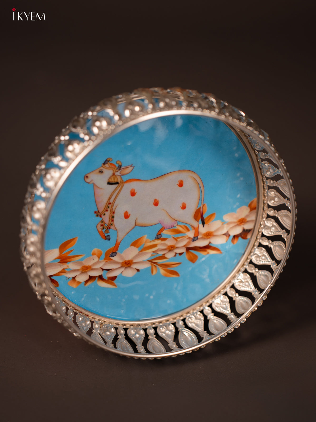 - This 6-inch German silver tray features a unique digital print of a cow in sky blue, blending traditional craftsmanship with modern design.