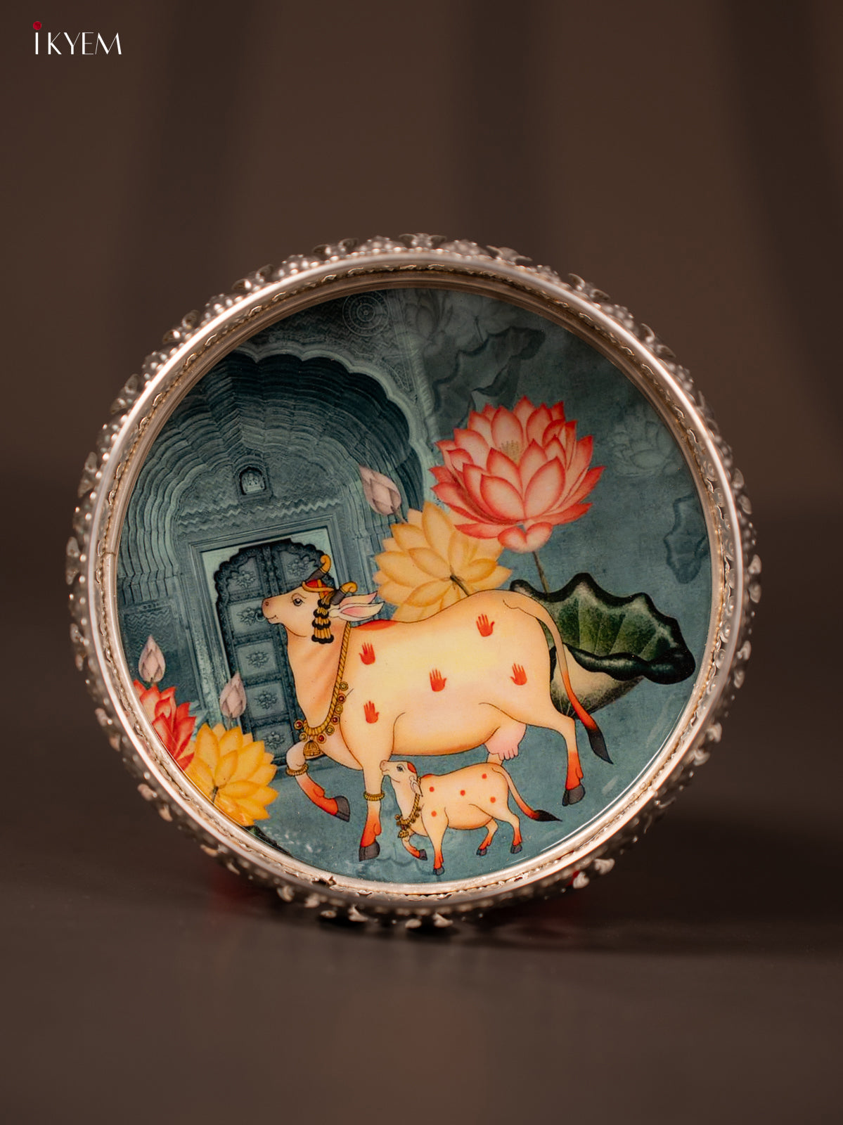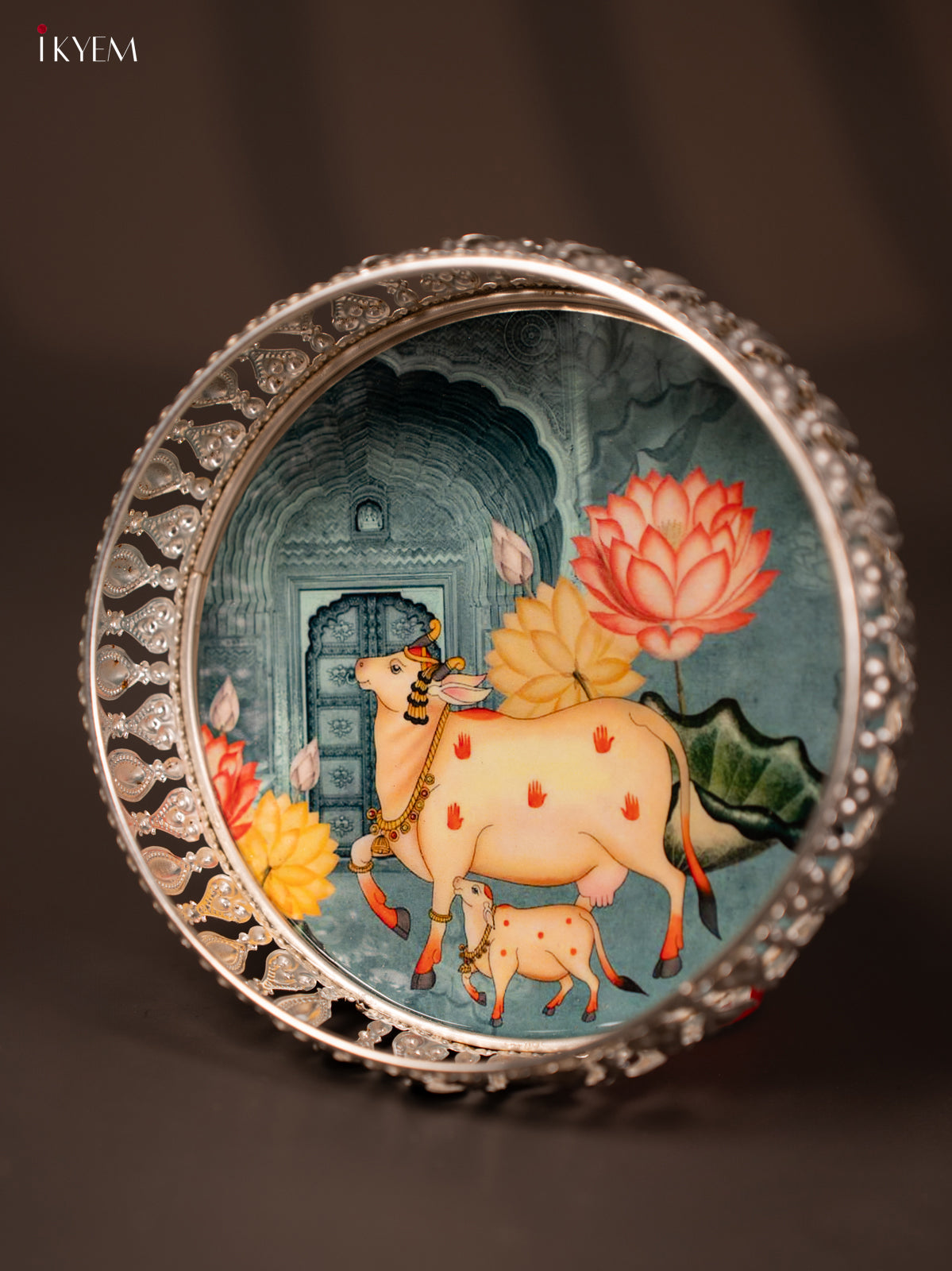 - This 6-inch German silver tray features a unique digital print of a cow and calf in teal, blending traditional motifs with modern design.