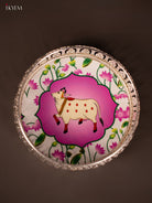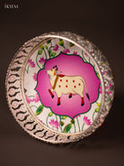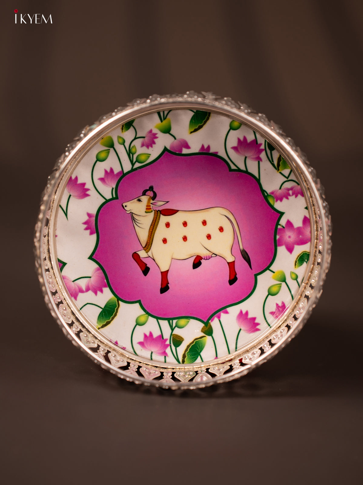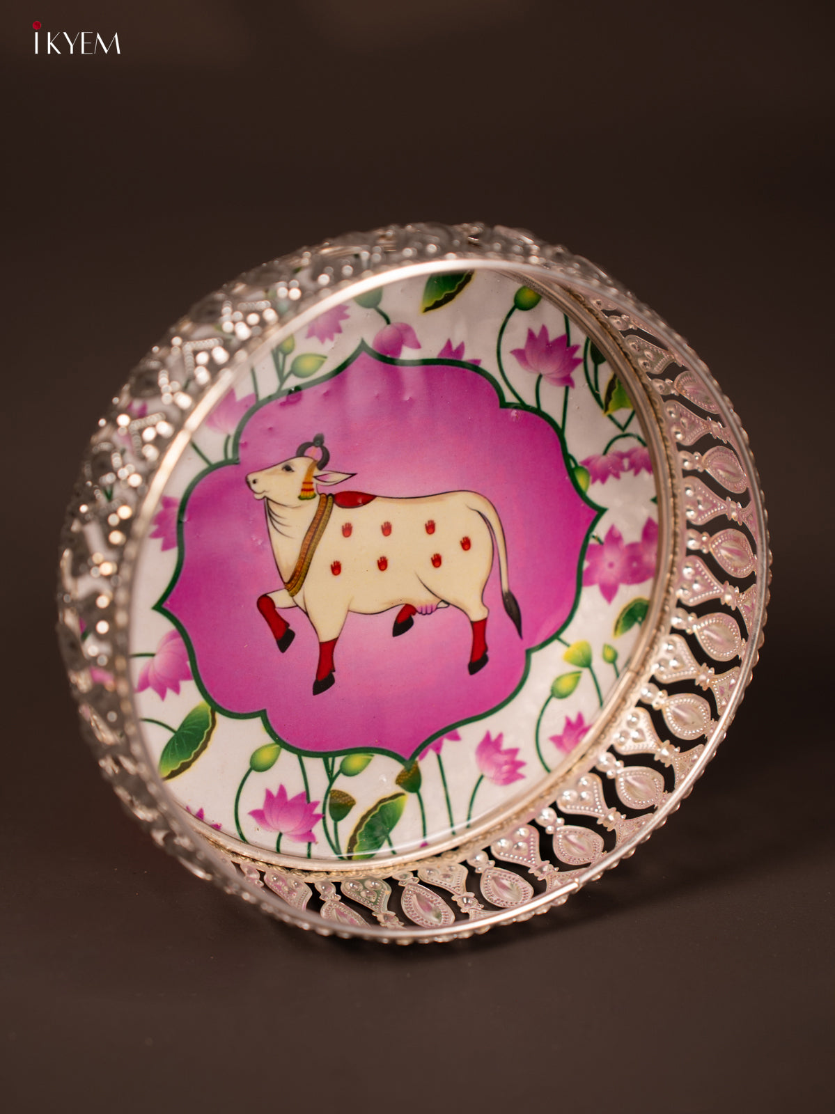 - This 6-inch German silver tray showcases a digitally printed cow design in elegant white and pink tones.