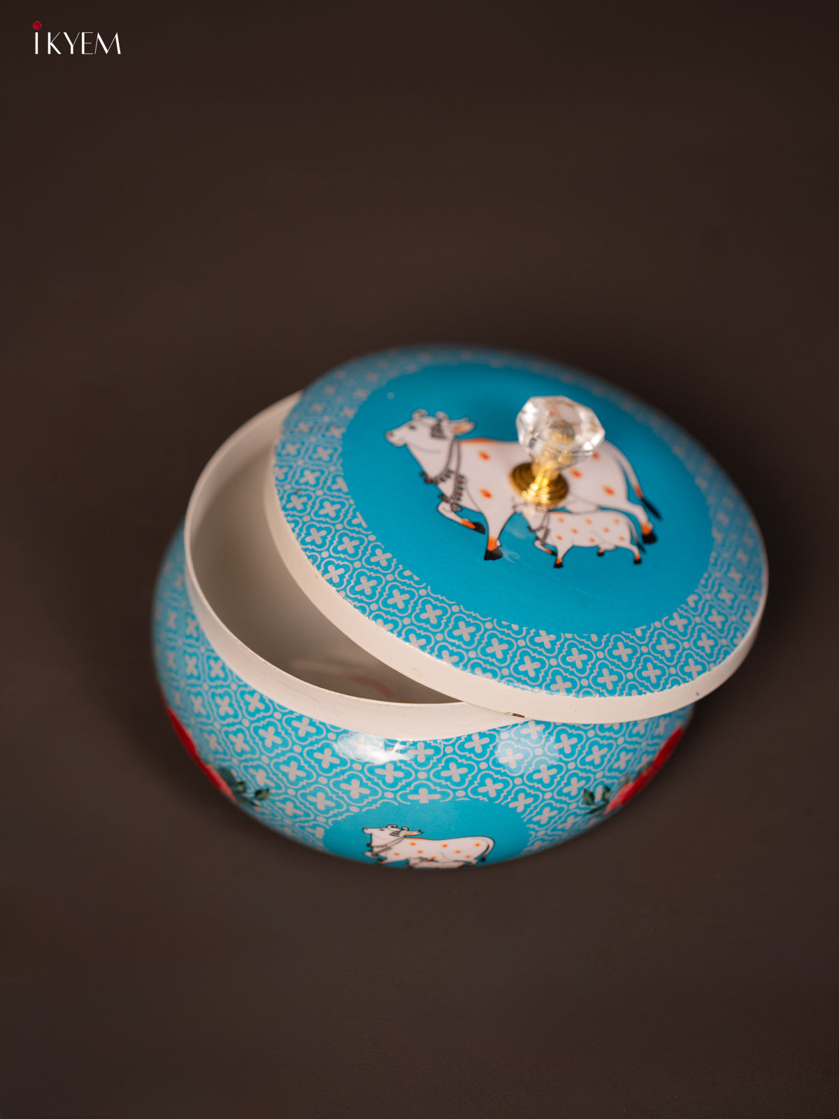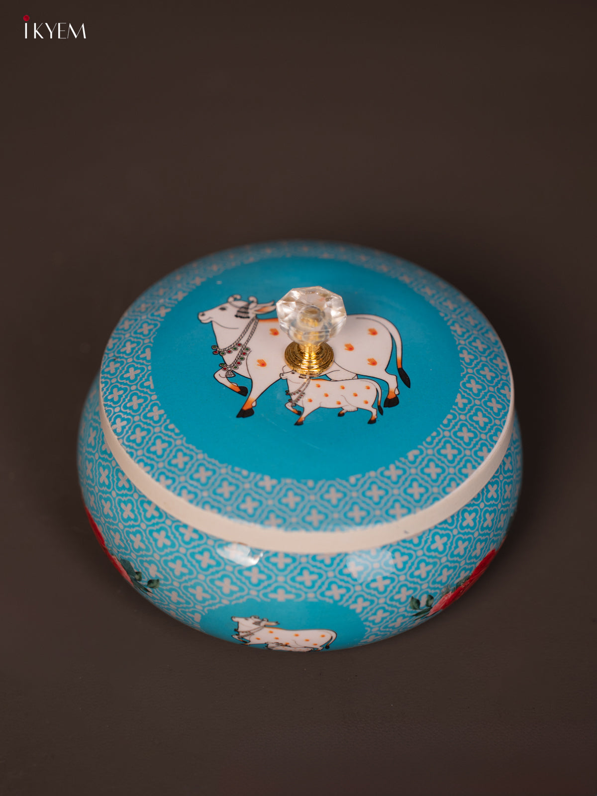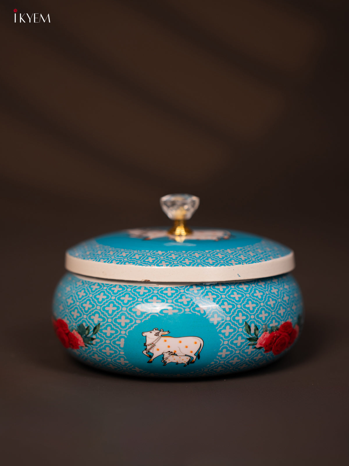 - This sky-blue round dry fruits jar features an elegant cow and calf print, blending traditional charm with practical storage.