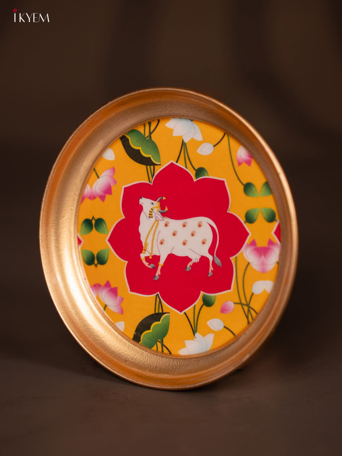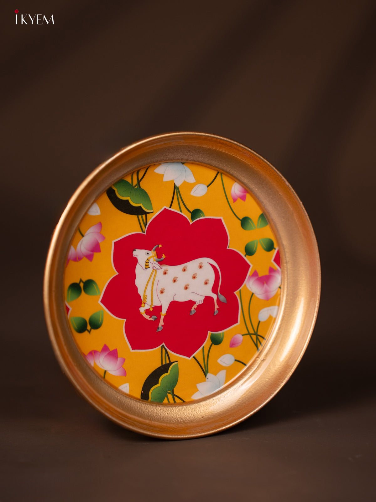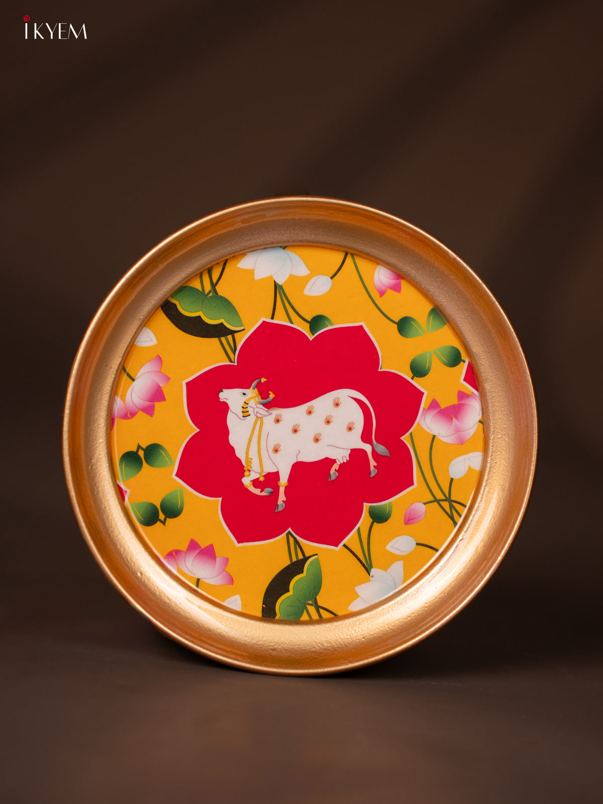 - This 6-inch brass plate features an elegant cow print in pink and yellow, making it an ideal choice for pooja celebrations and traditional return gifts.