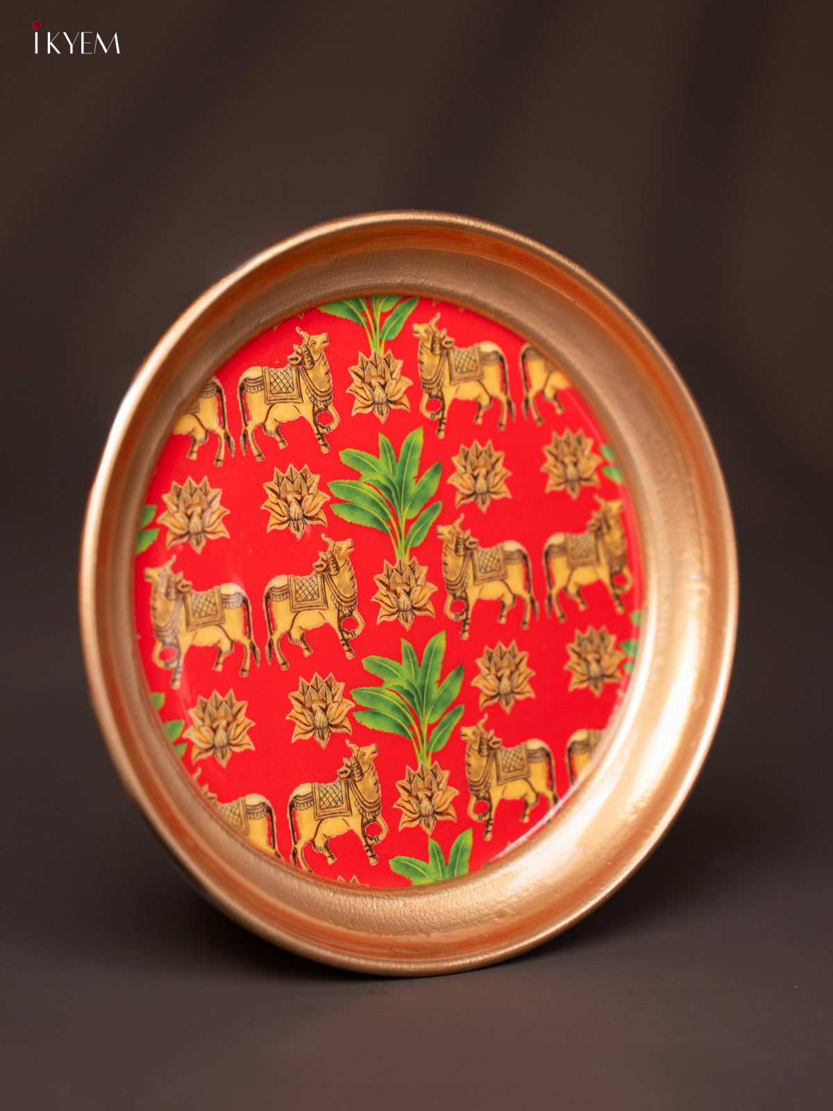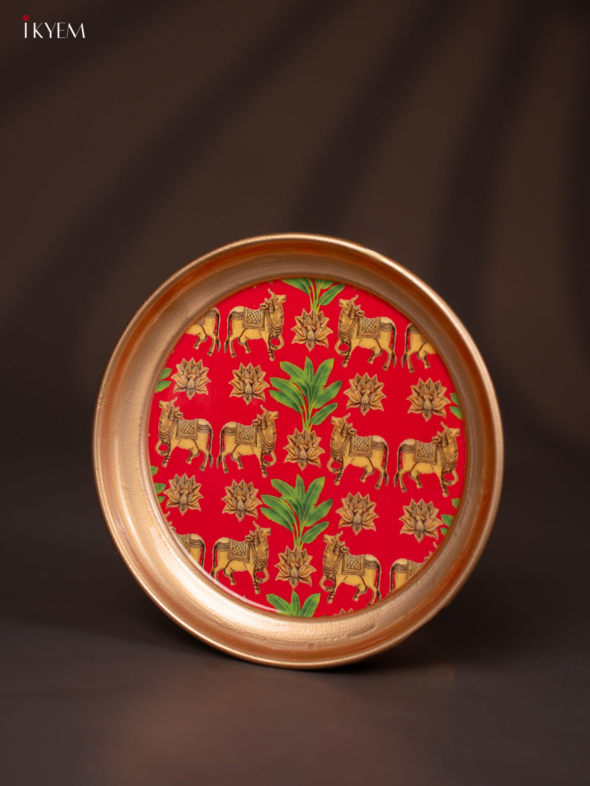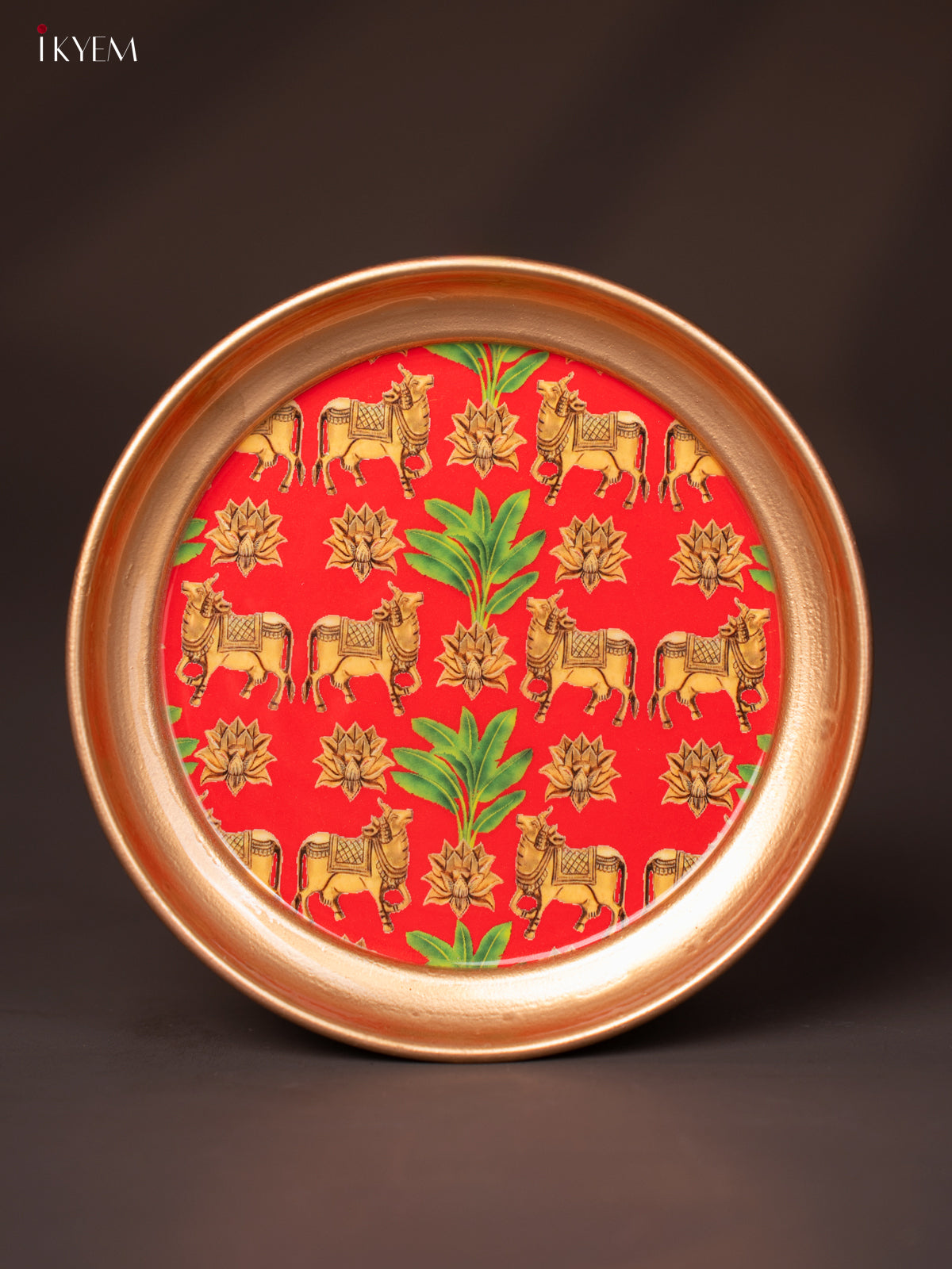 - This 6-inch red brass plate features an elegant cow print, making it ideal for pooja celebrations and traditional ceremonies.
