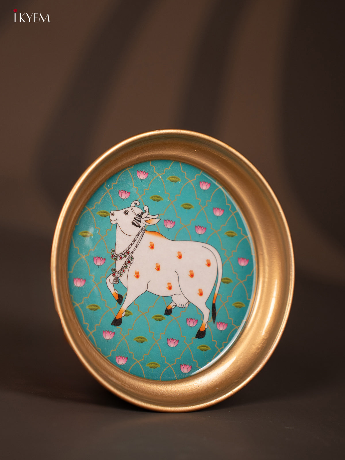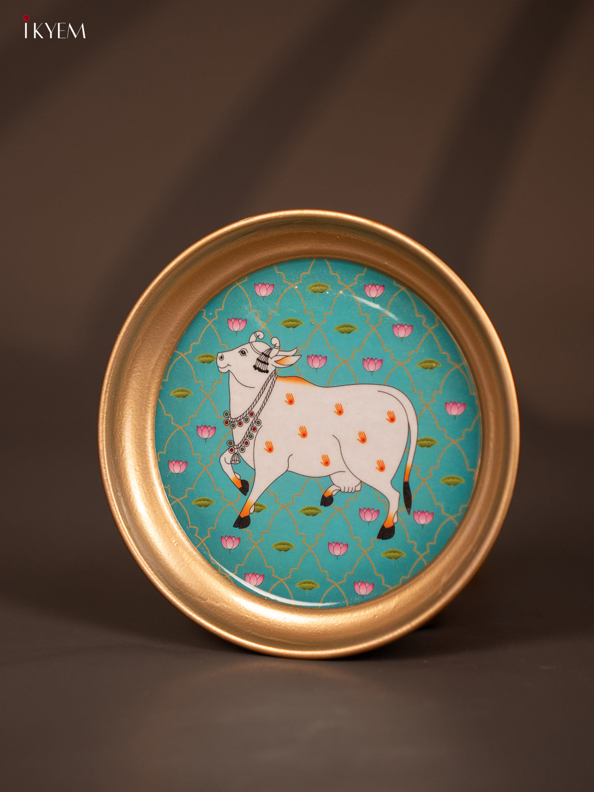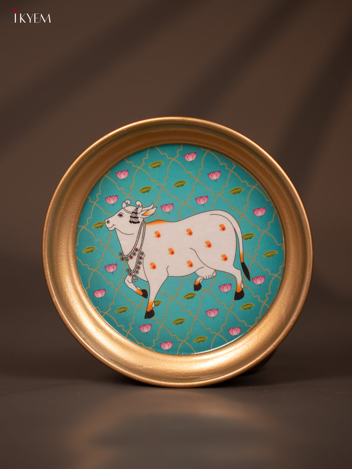 Cow & Lotus Printed Sky Blue Brass Coated Plate - 6 Inches - KG25146