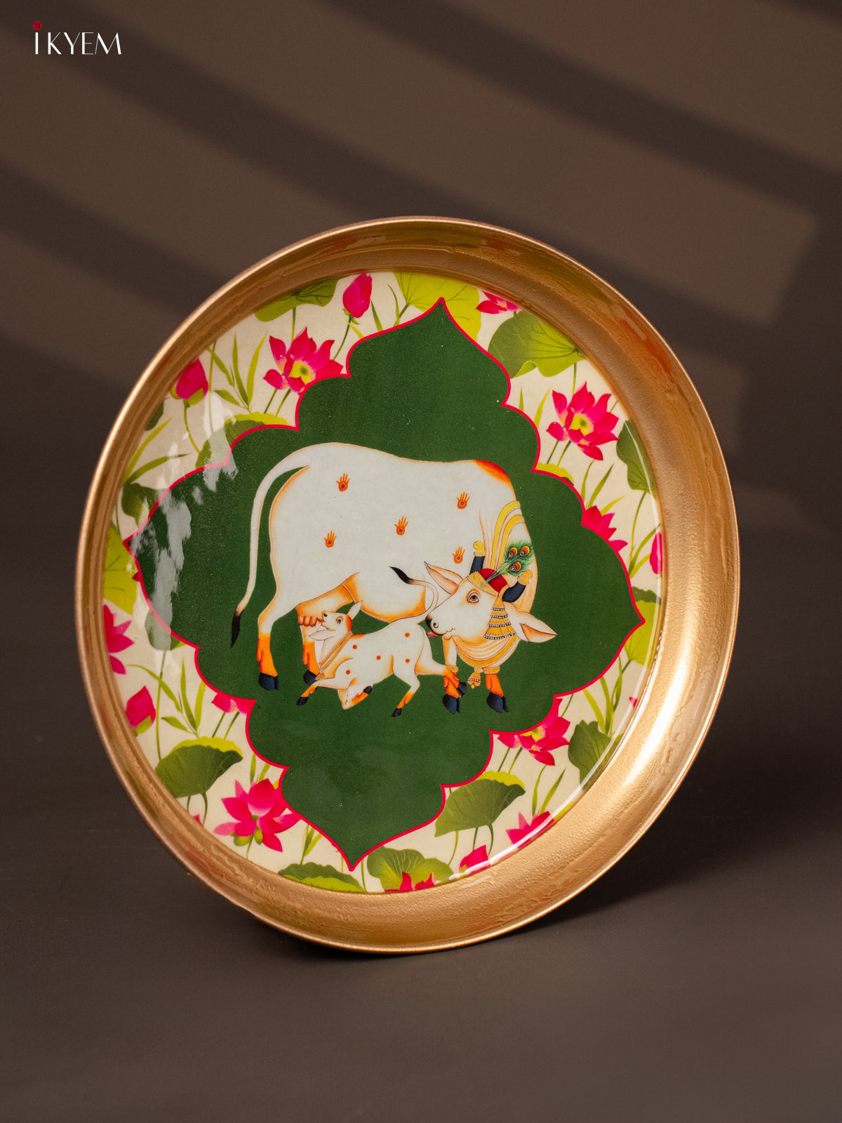 - This 8-inch green brass plate features an elegant cow and calf print, making it ideal for pooja celebrations and traditional ceremonies like Varamahalakshmi and Navaratri.