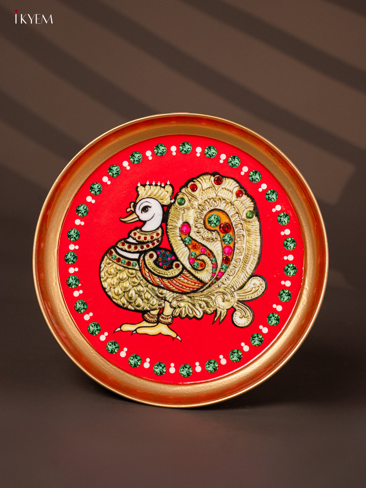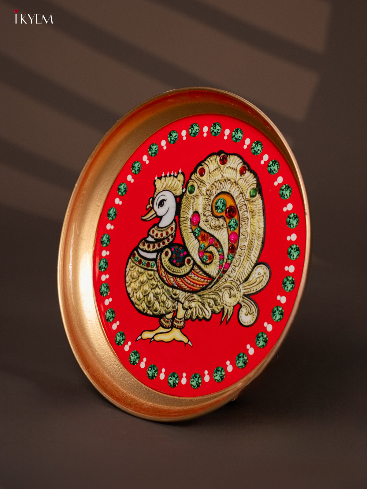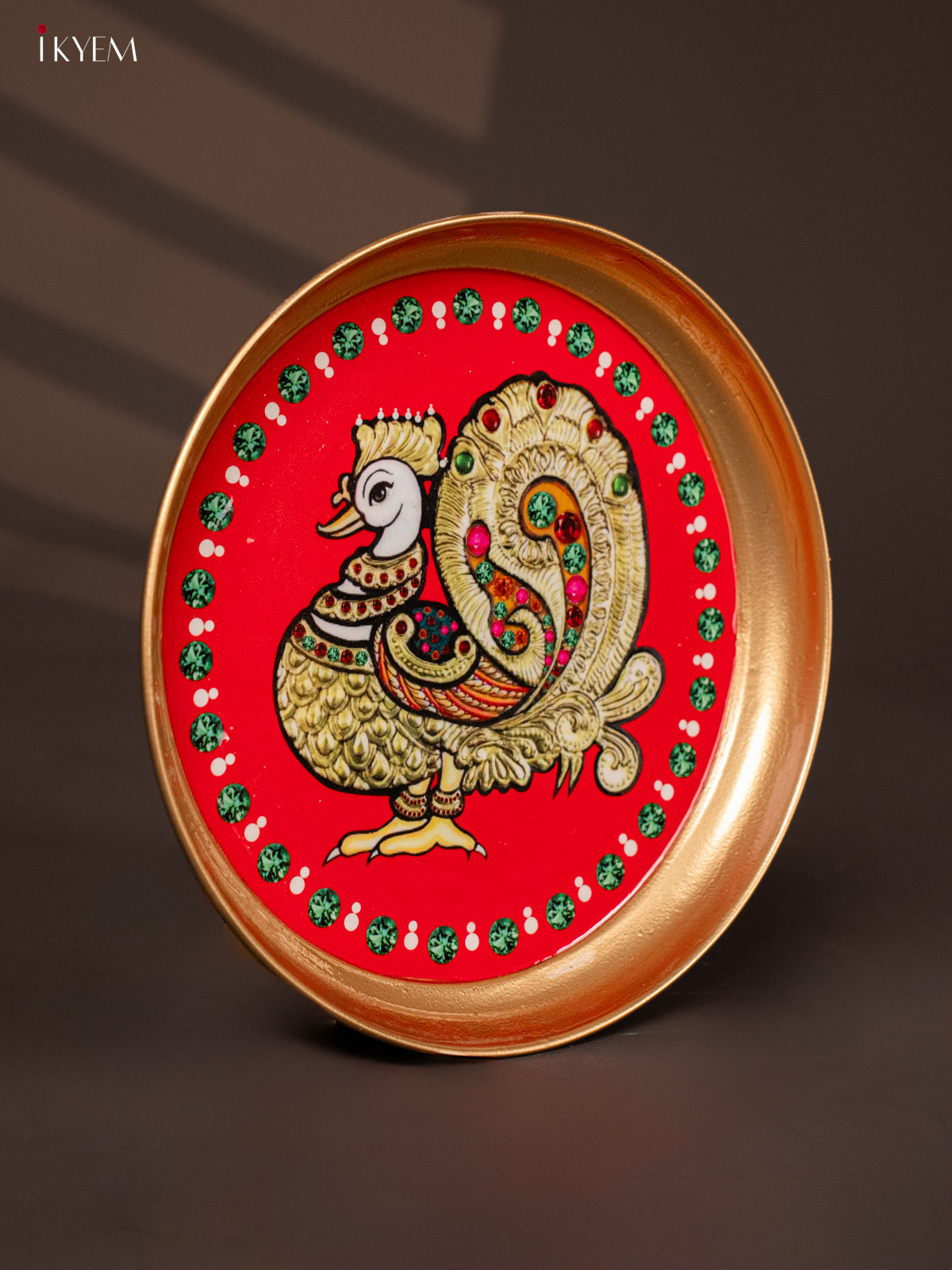 - The Annapakshi Printed Red Brass Plate, 8 inches in size, is designed for pooja celebrations and festive events such as Navaratri and Varamahalakshmi.