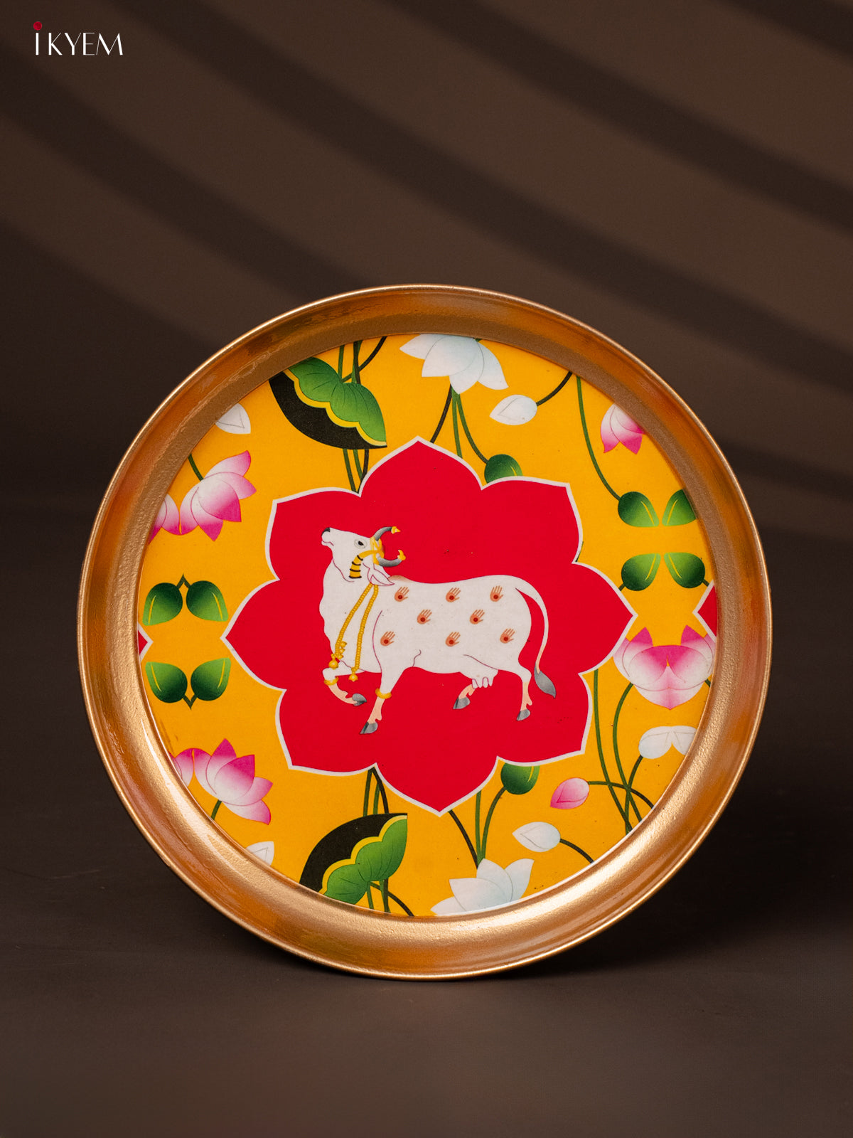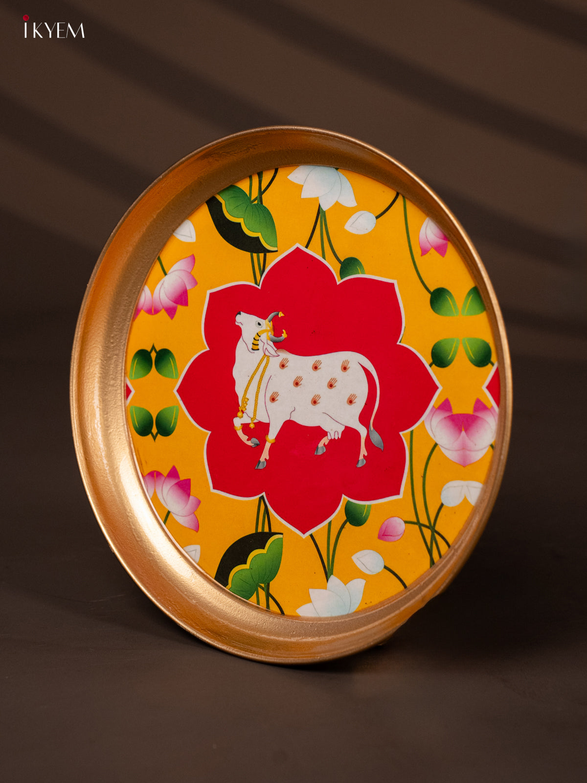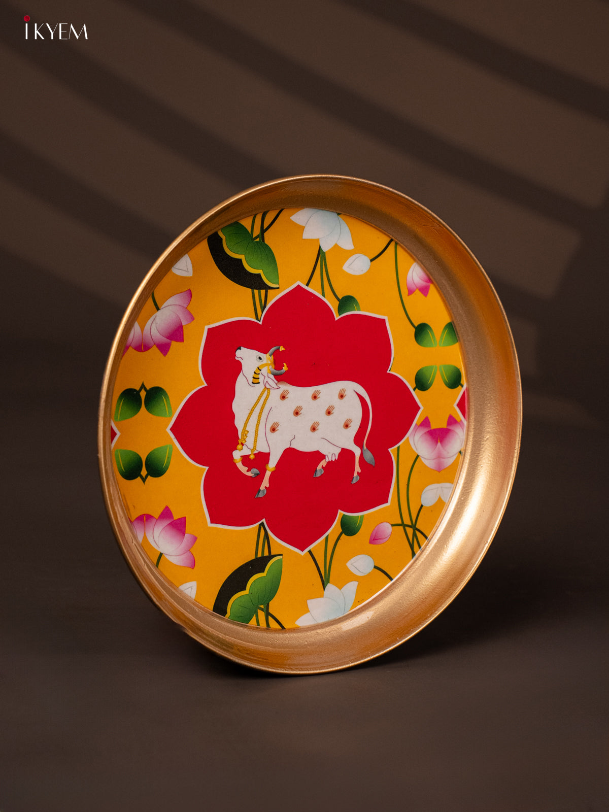 - This 8-inch brass plate features a distinctive cow print in pink and yellow, making it an ideal choice for pooja celebrations and festivals like Navaratri and Varamahalakshmi.