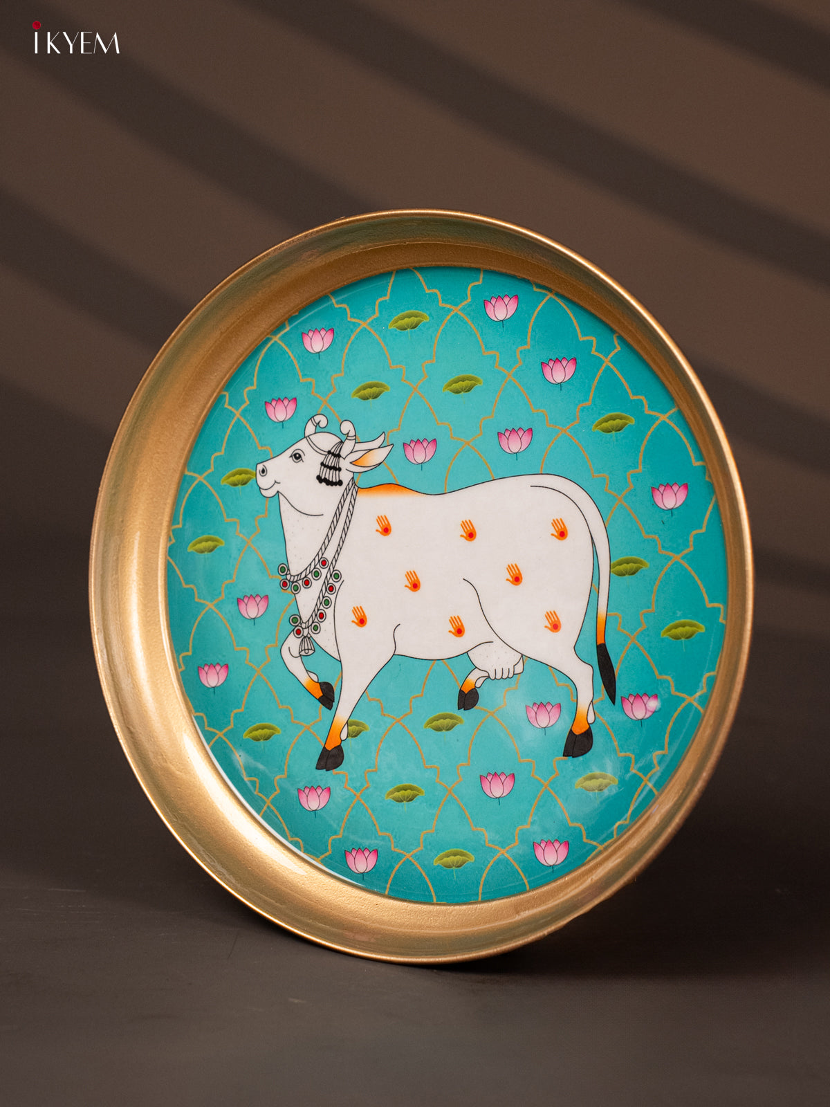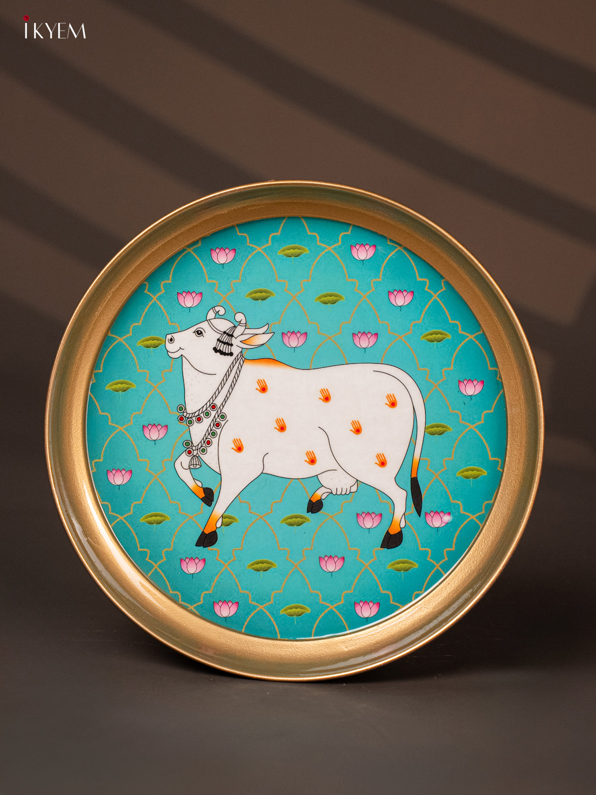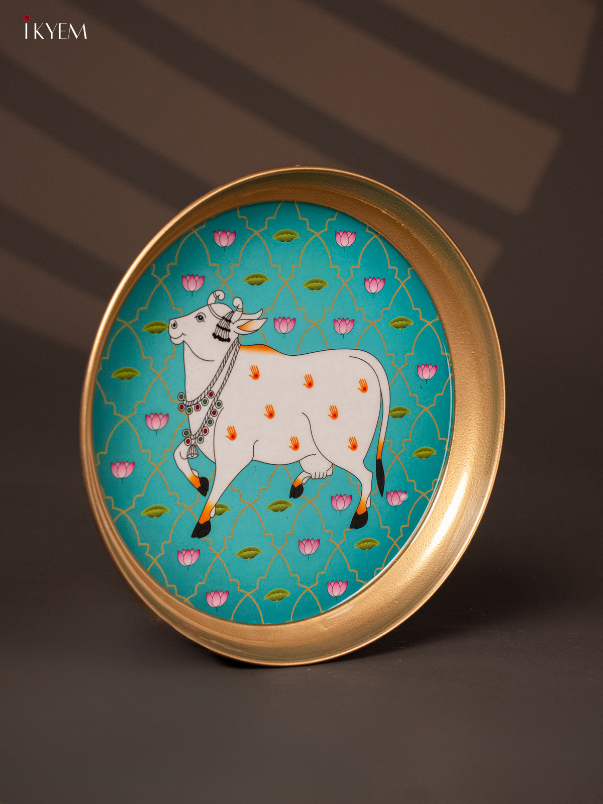 Cow & Lotus Printed Sky Blue Brass Coated Plate - 8 Inches - KG25165