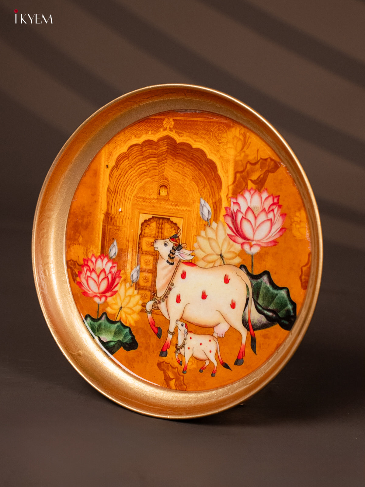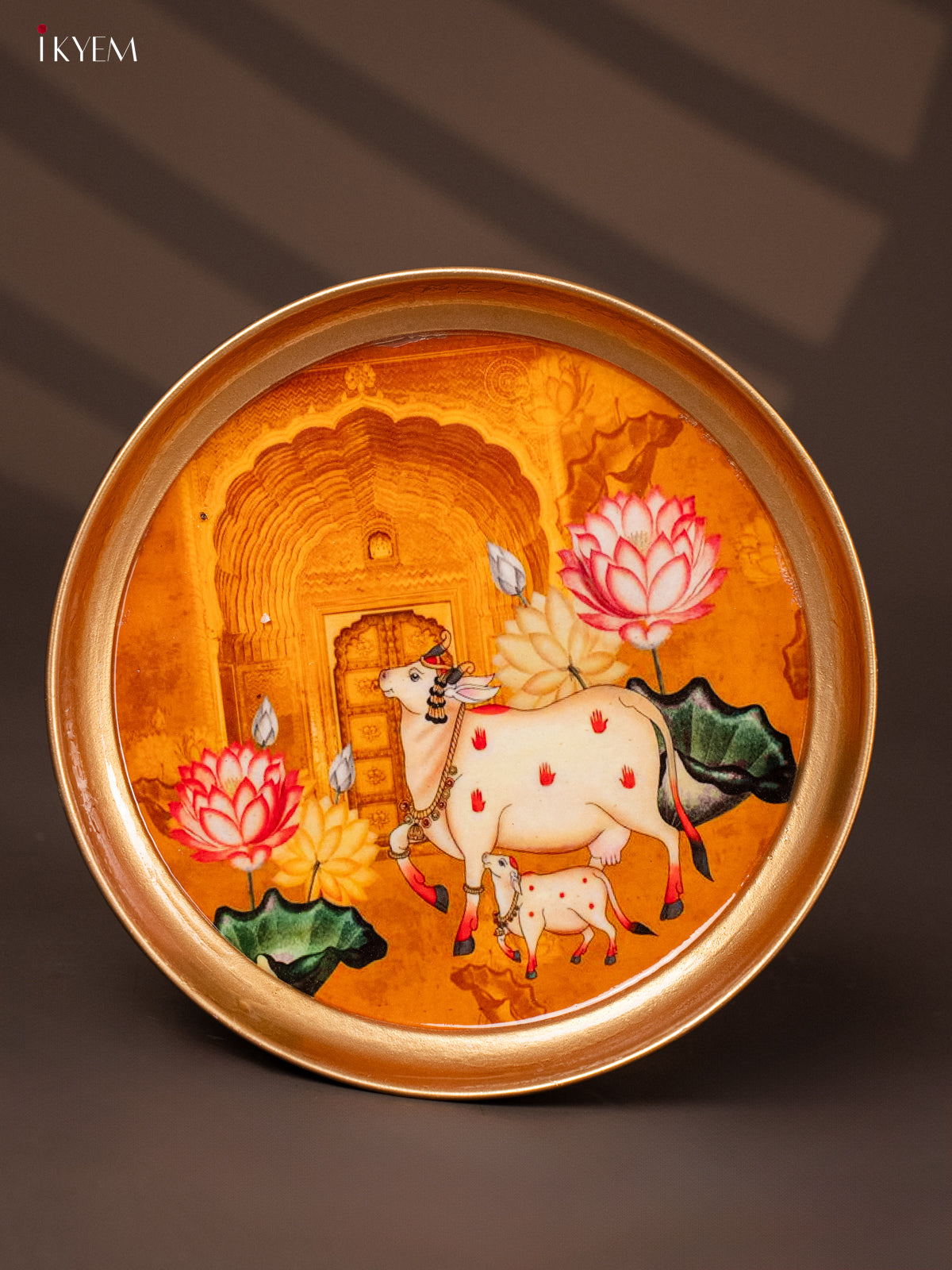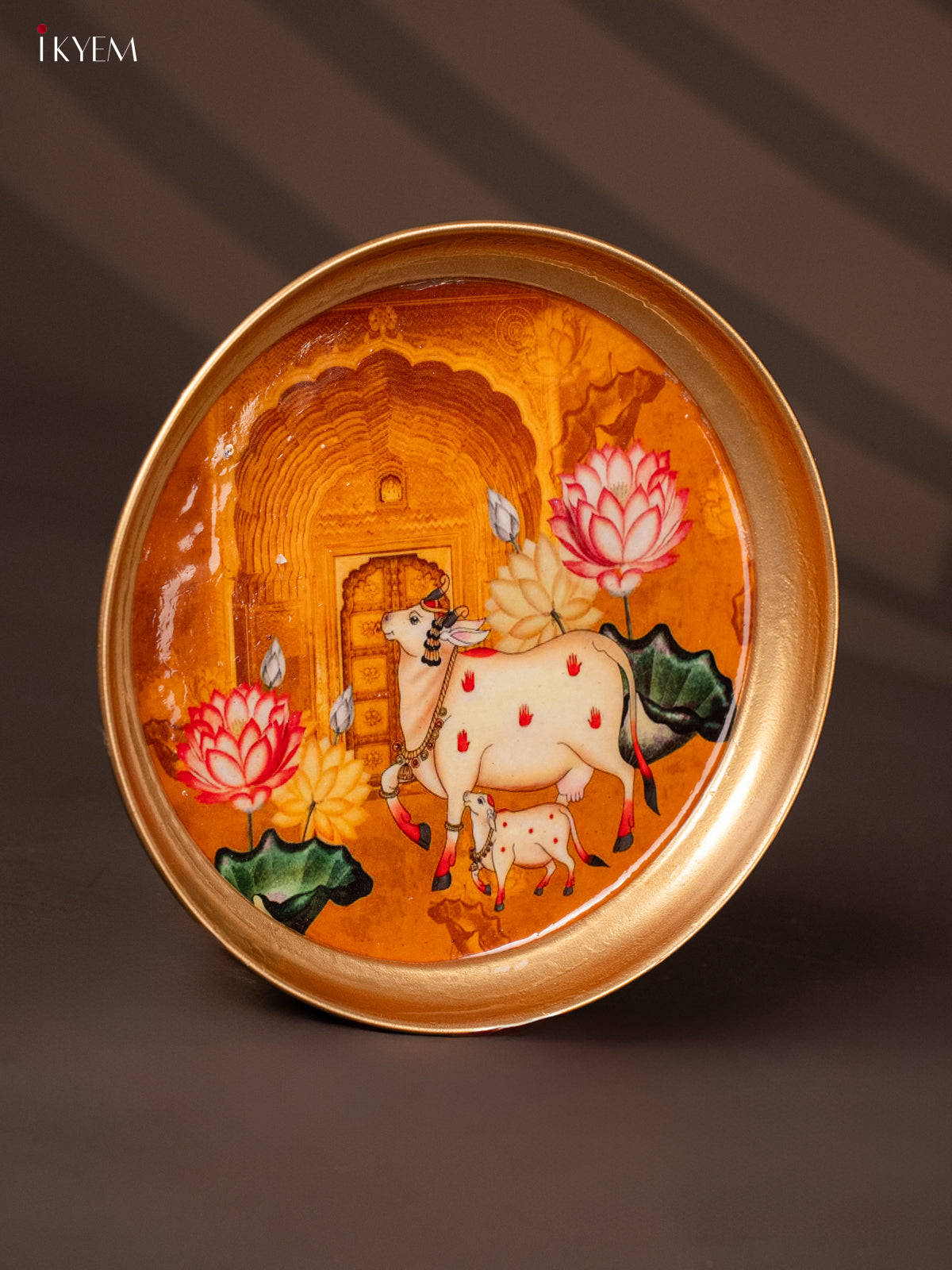 Cow & Calf Printed Yellow Brass Coated Plate - 8 inches - KG25169