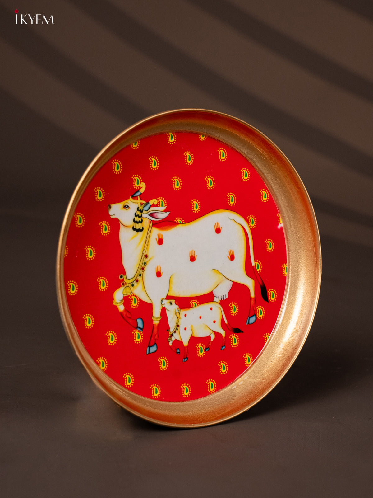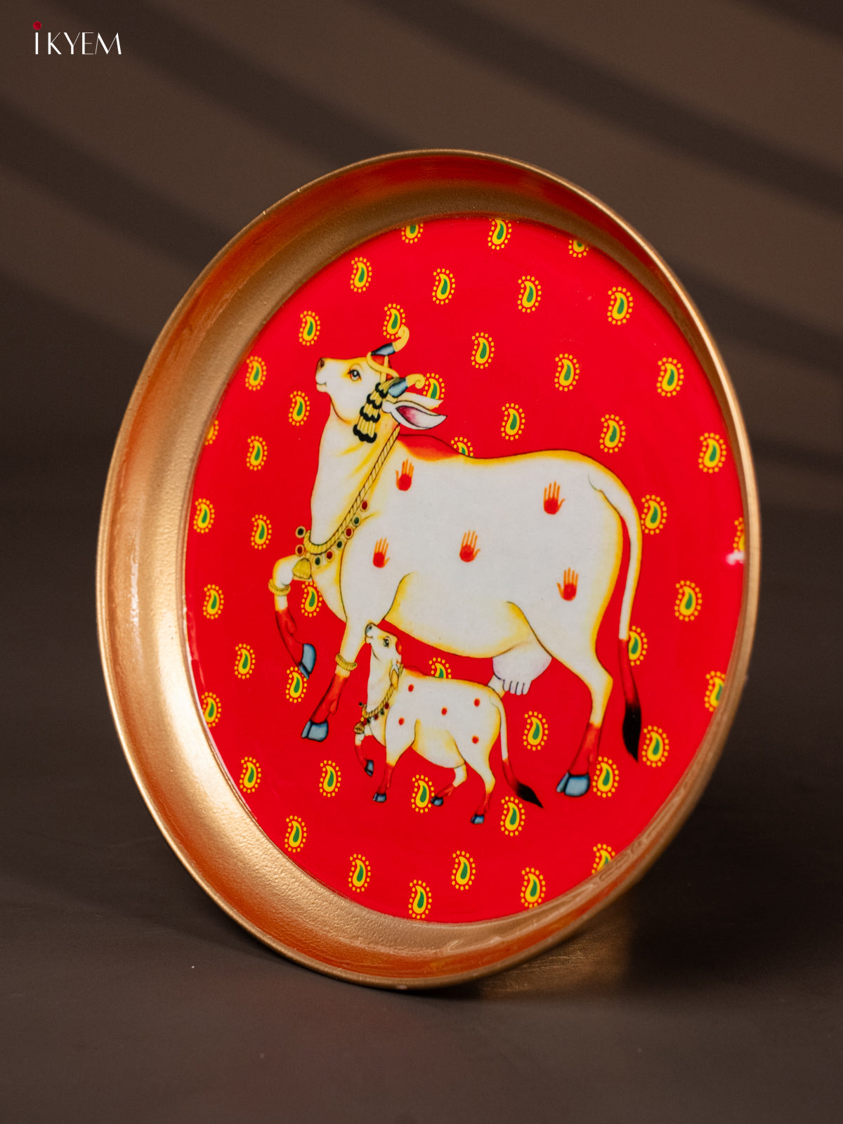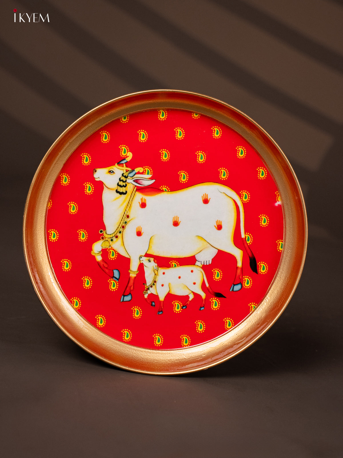- This 8-inch red brass plate features an elegant cow and calf design, making it ideal for pooja celebrations and traditional ceremonies.