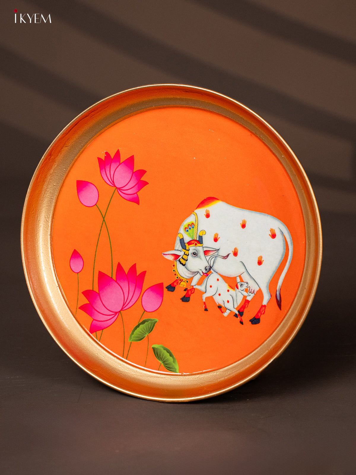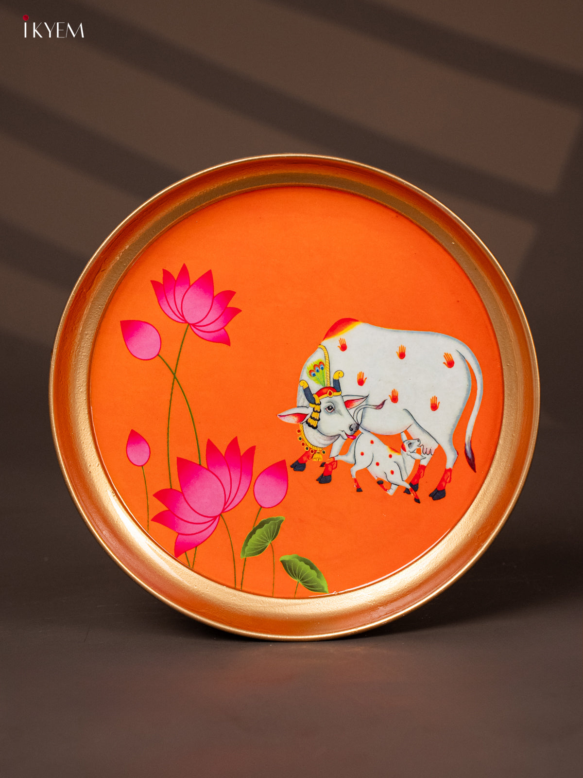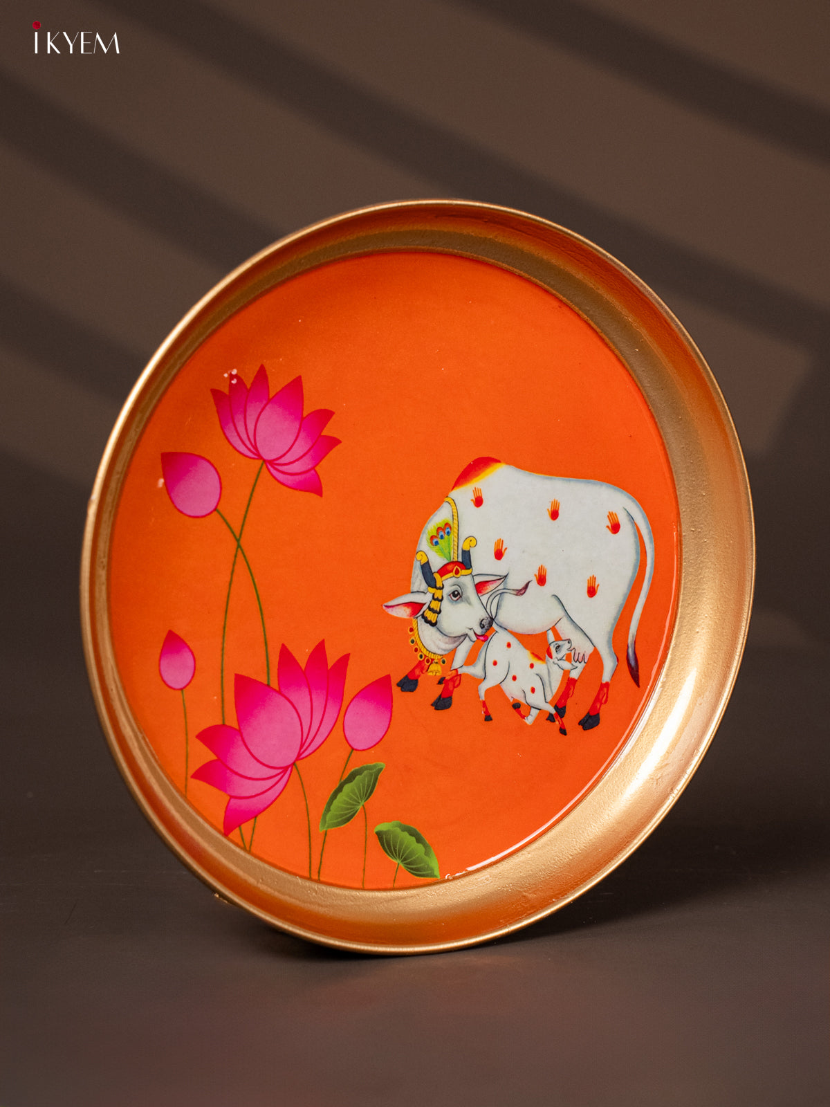- This 8-inch orange brass plate features a detailed cow and calf print, making it an ideal choice for pooja celebrations, Varamahalakshmi, and Navratri festivities.