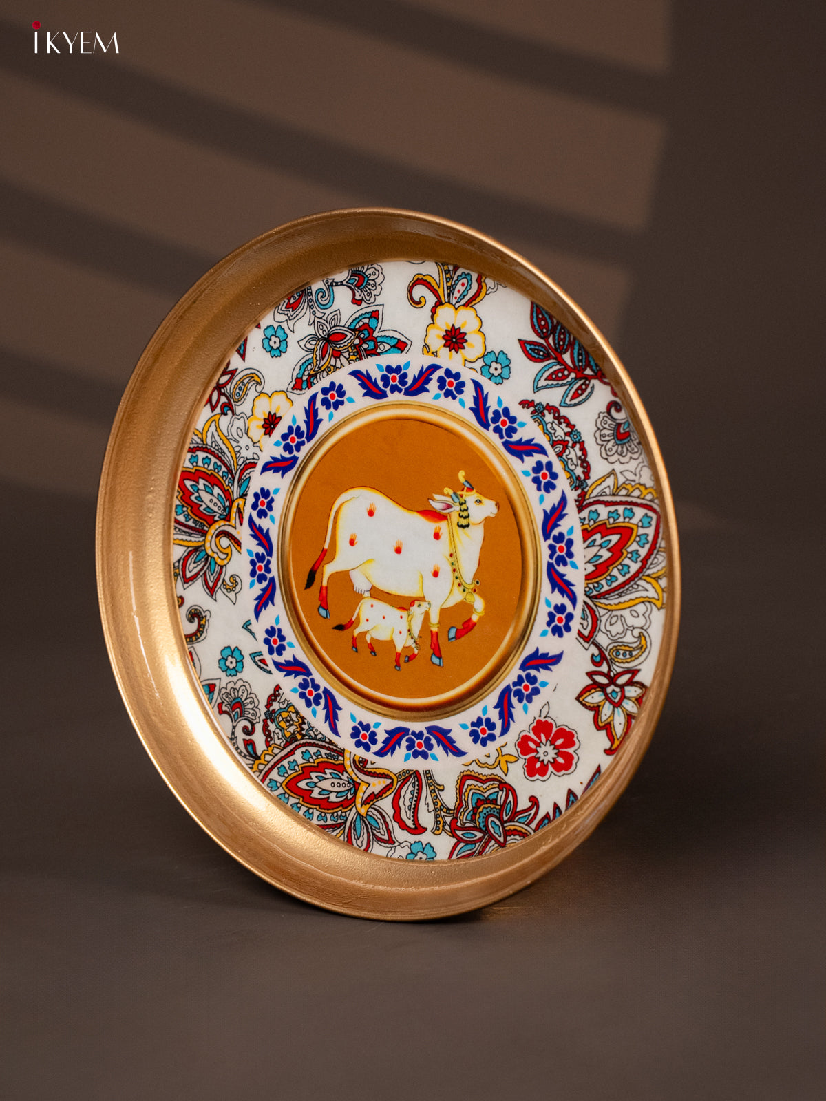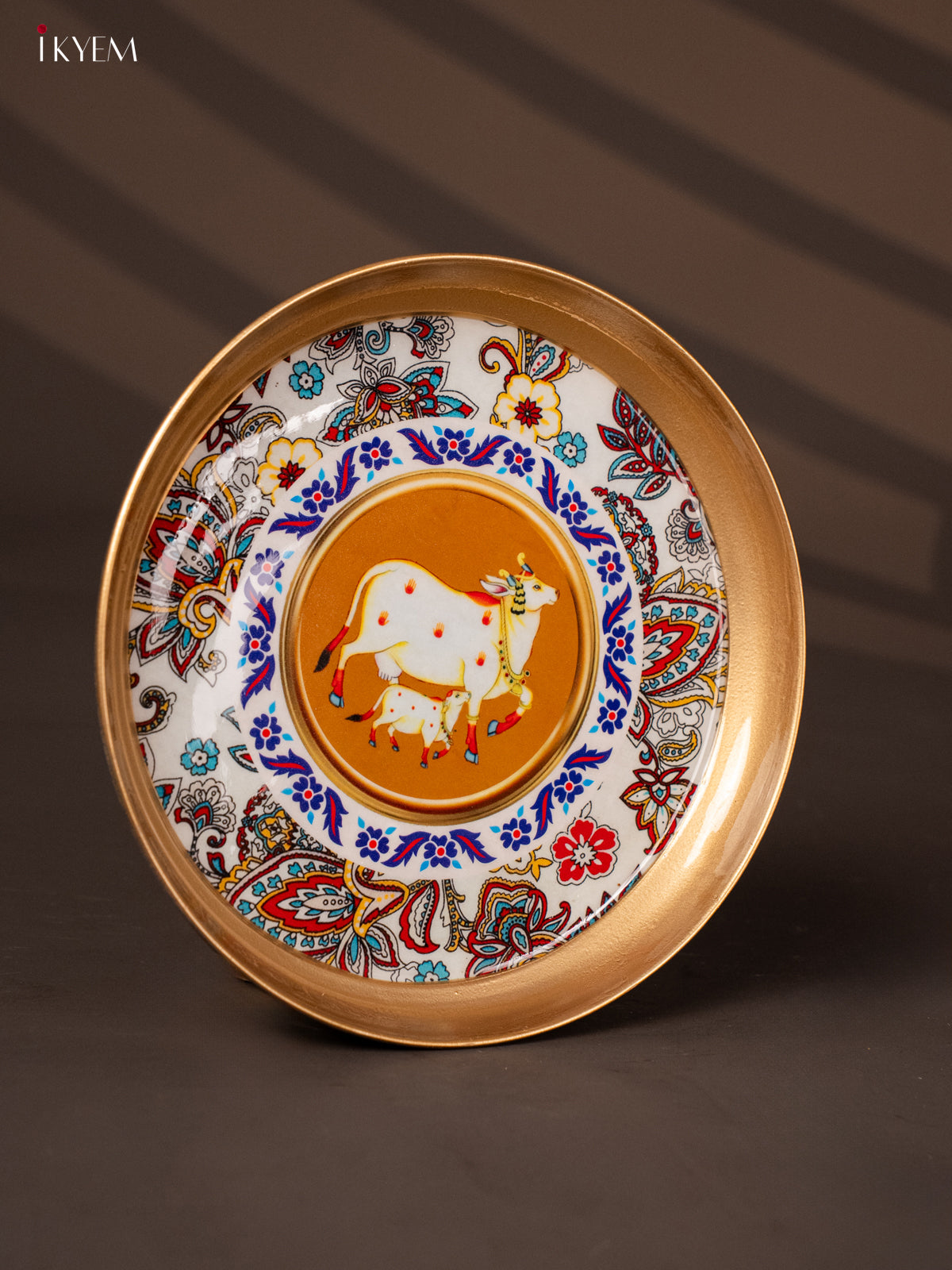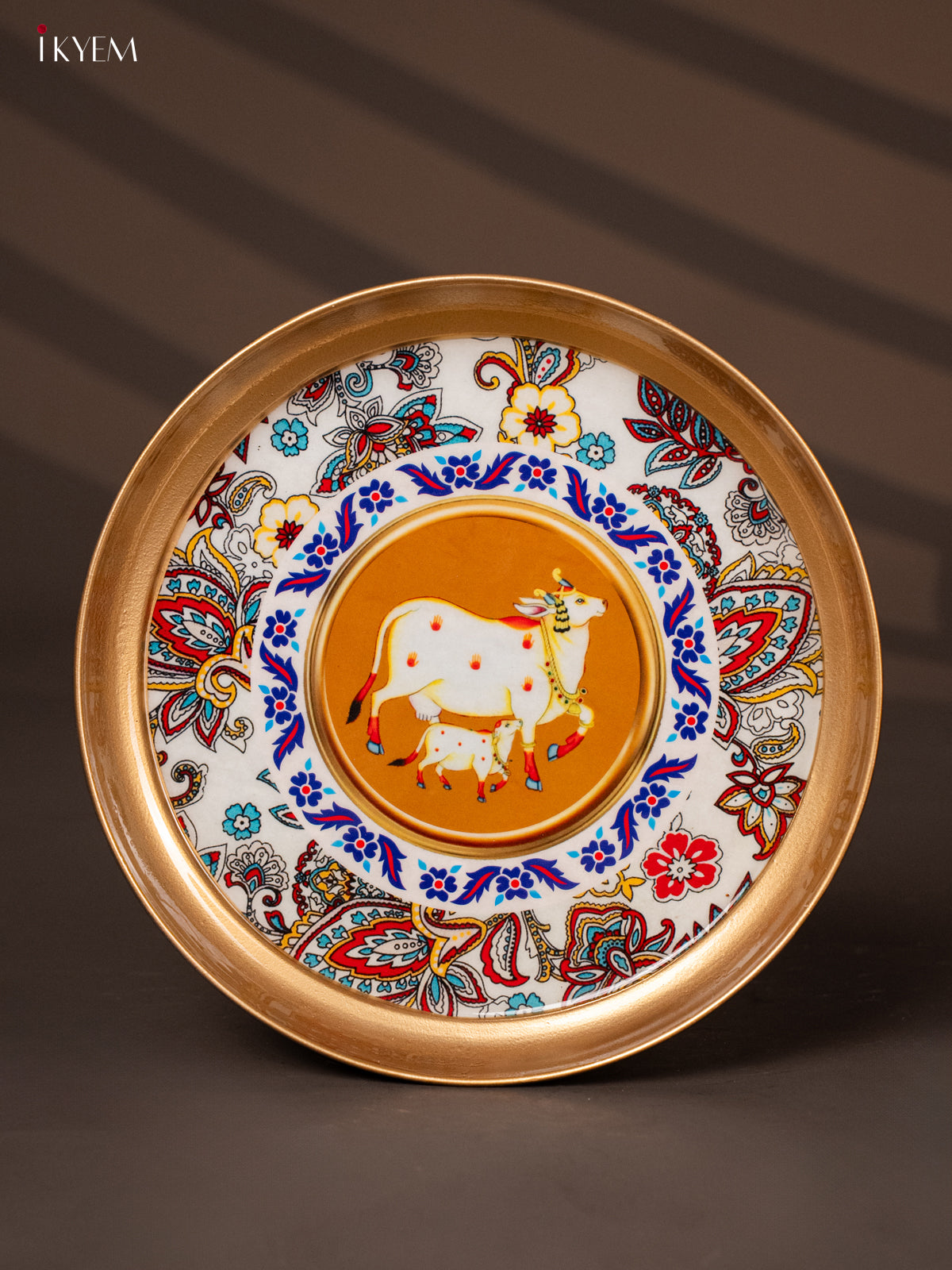 - This 8-inch white brass plate features a beautifully printed cow and calf design in blue, making it perfect for pooja celebrations and festive occasions such as Varamahalakshmi and Navaratri.