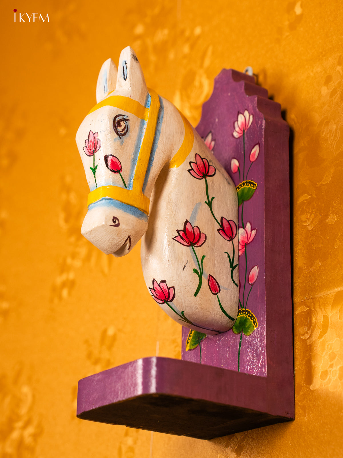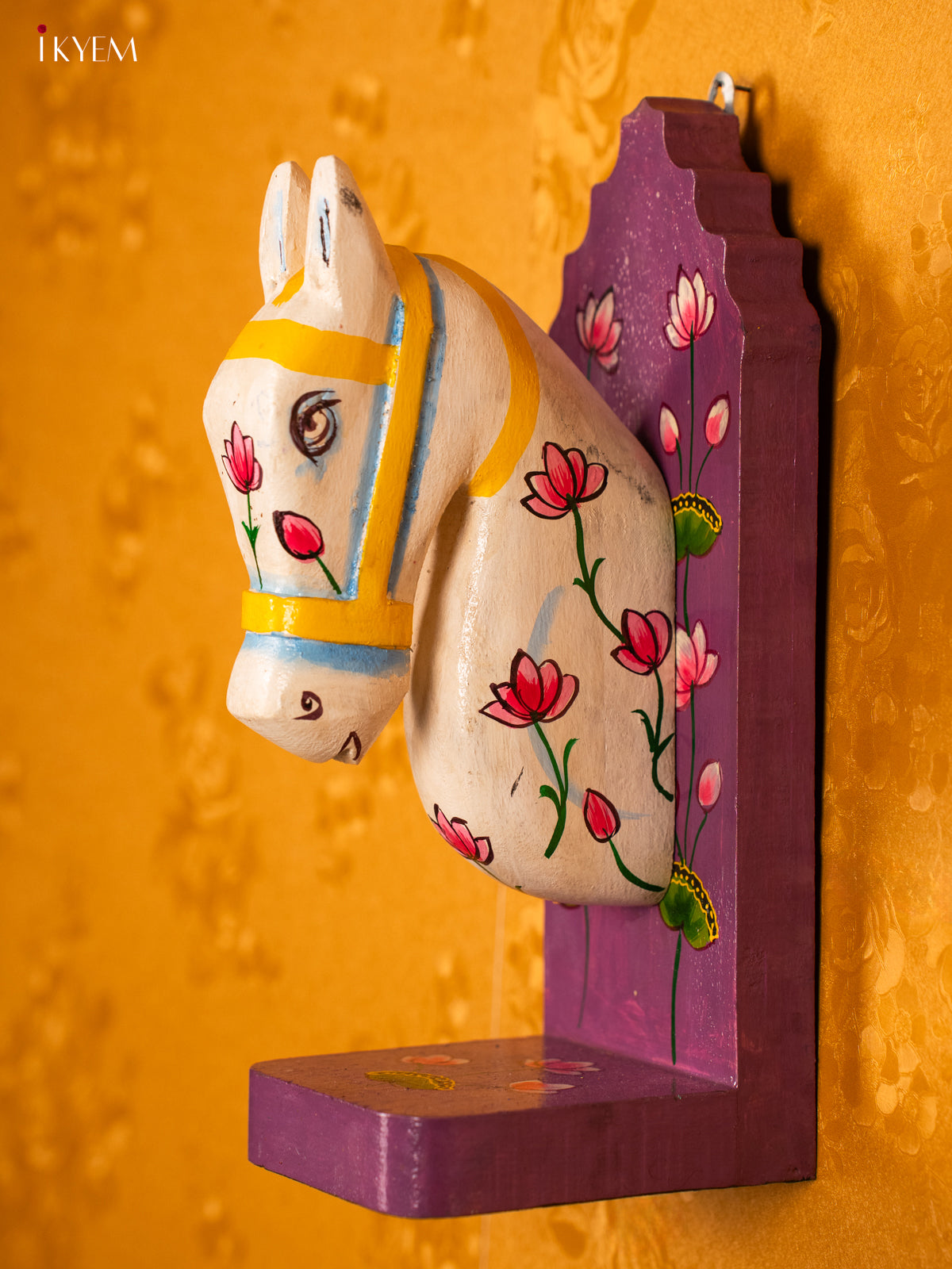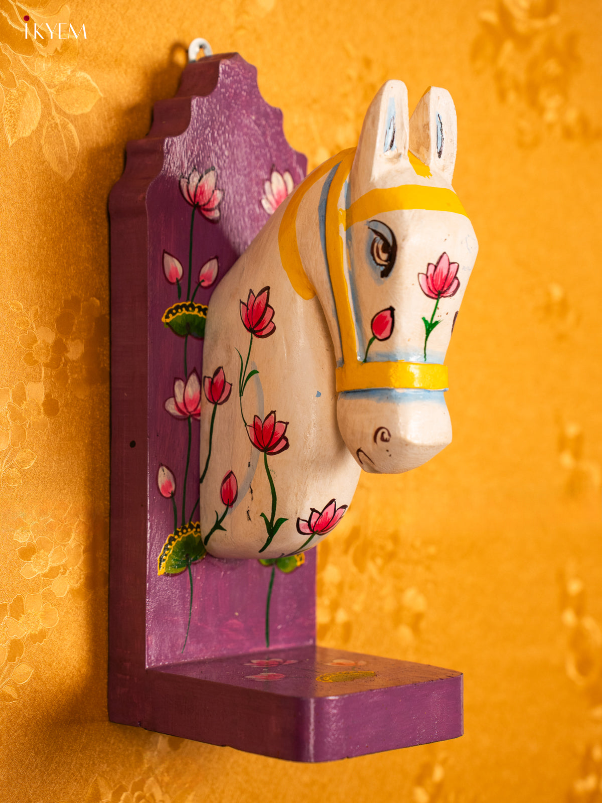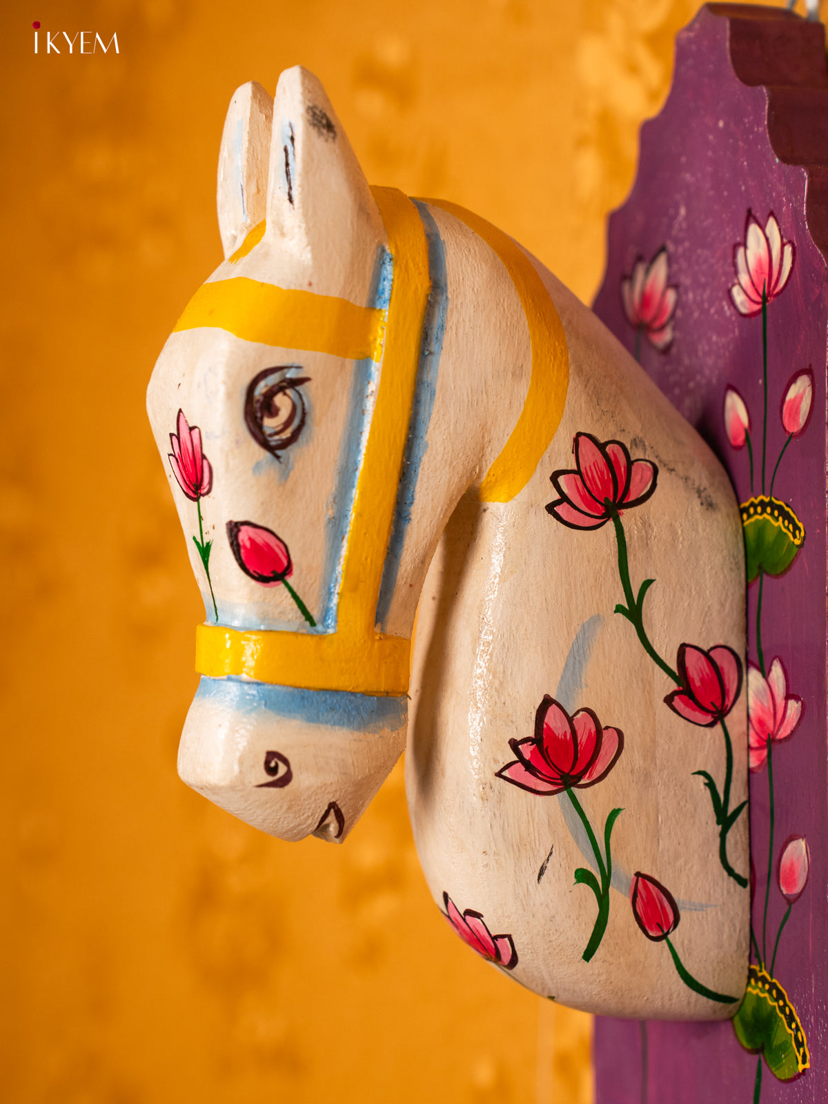 - This 12-inch wood wall decor features a hand-carved horse design painted in Purple and accented with a lotus motif, combining artistry and elegance.