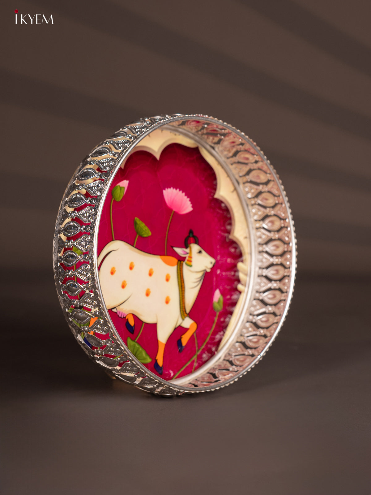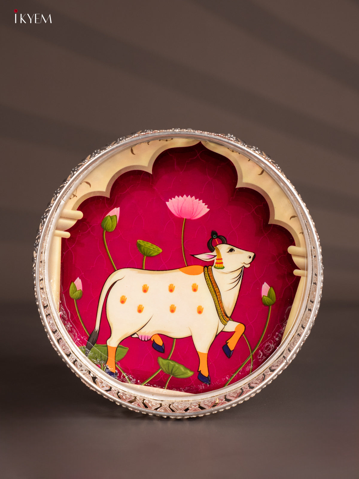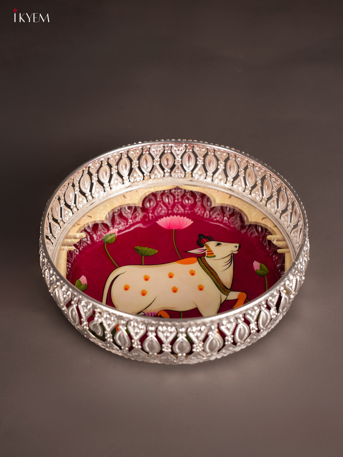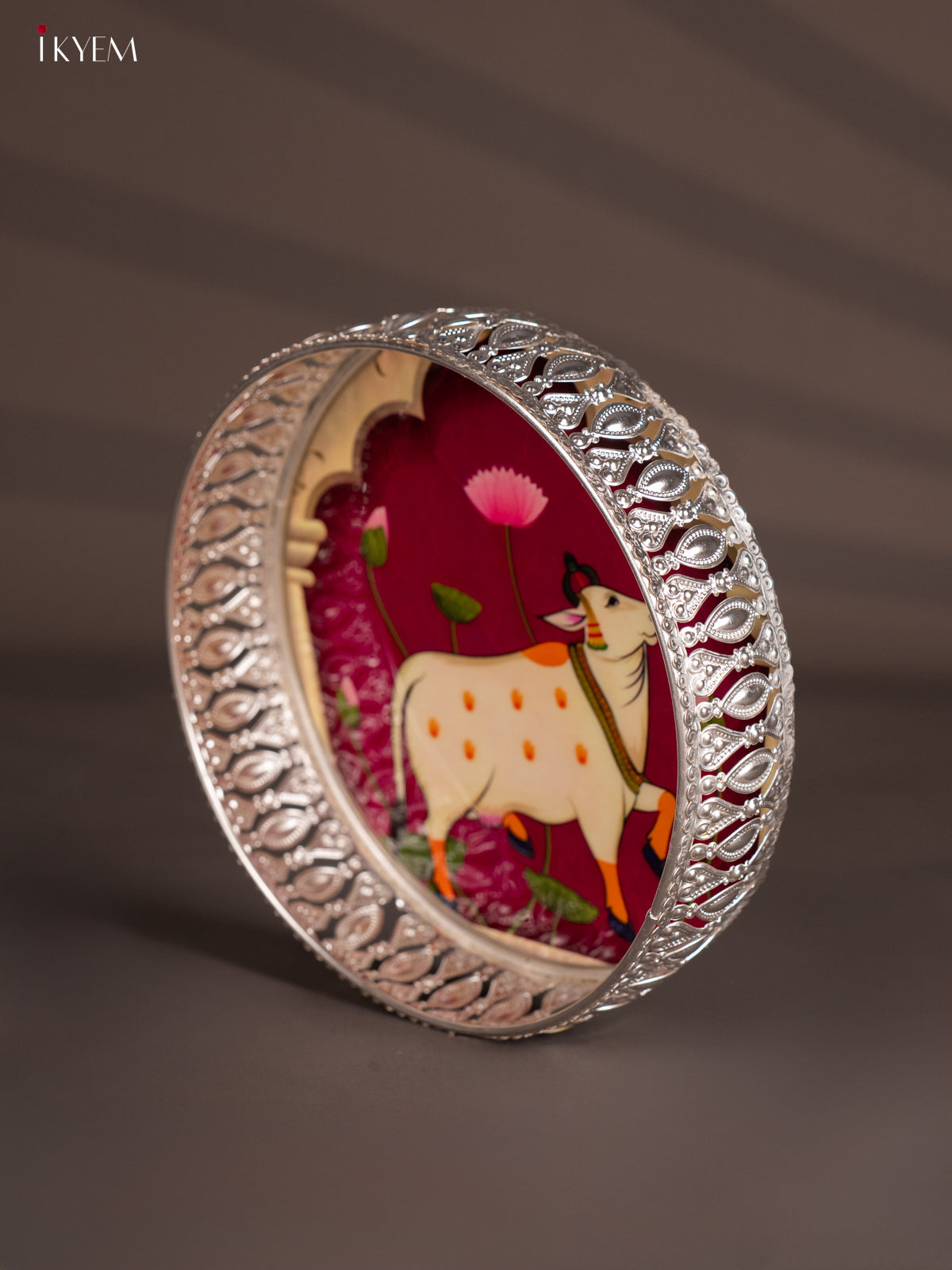 - This 8-inch Digital Printed German Silver Tray features a vibrant purple cow design, making it perfect for pooja ceremonies, elegant home decor, and thoughtful return gifts.