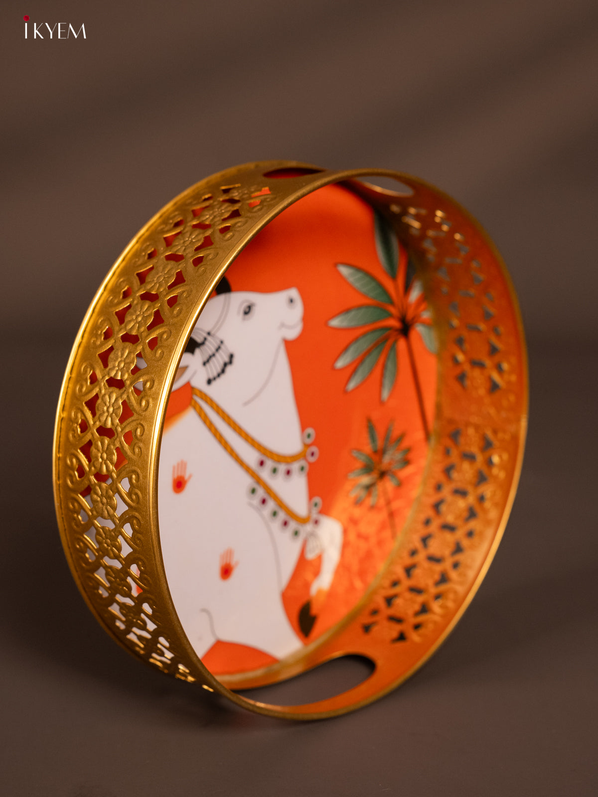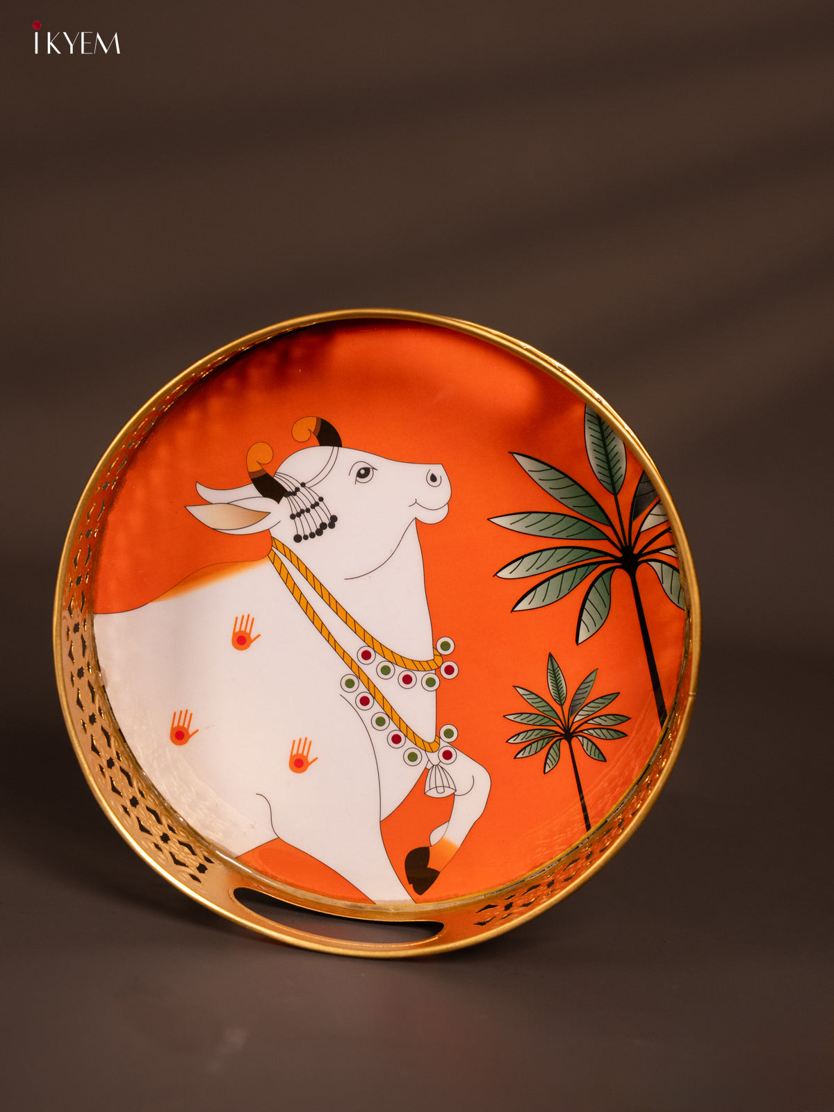 - This 8-inch round metal tray features a detailed digital print of a cow design in orange, ideal for pooja ceremonies and thoughtful return gifts.