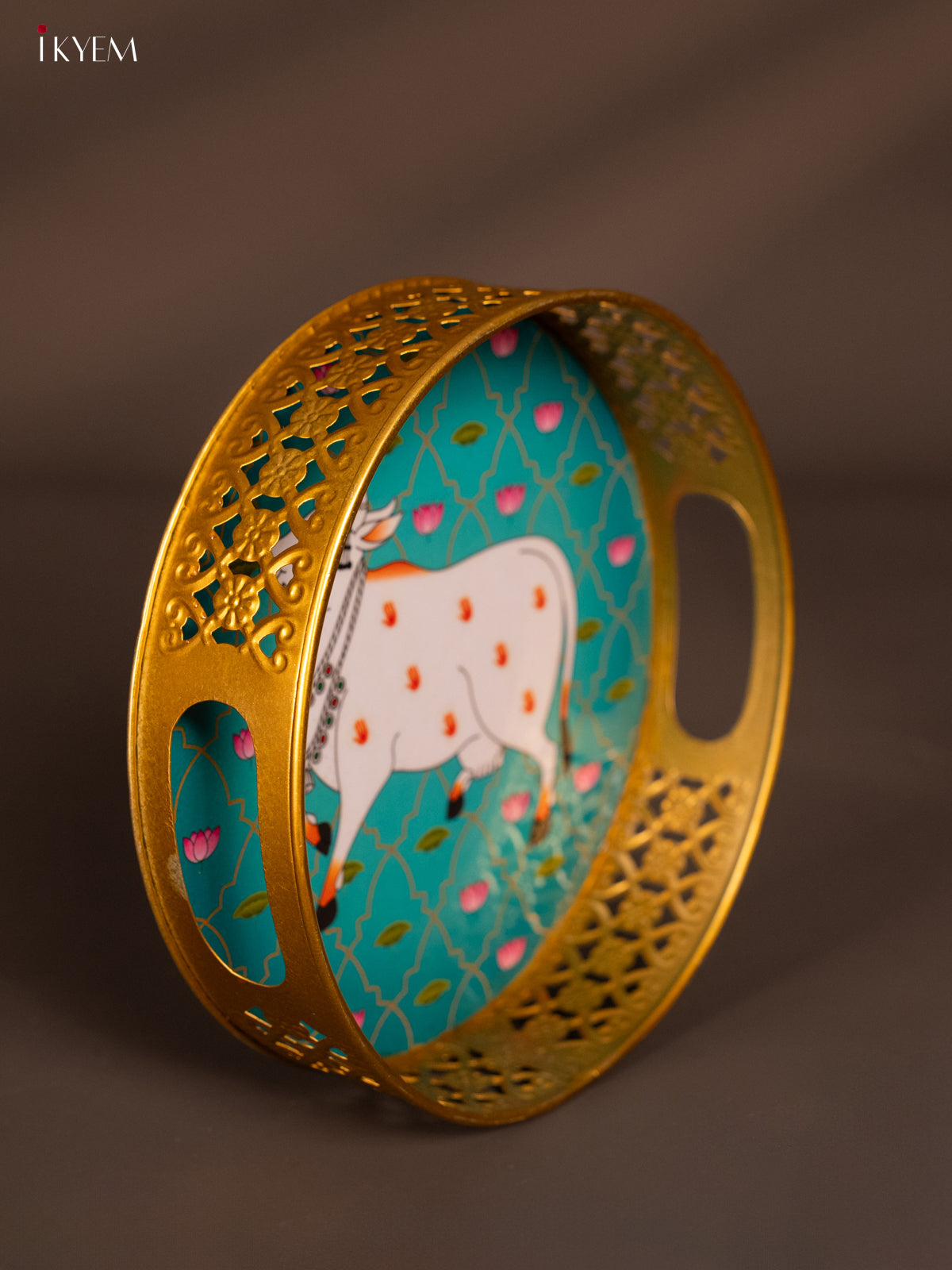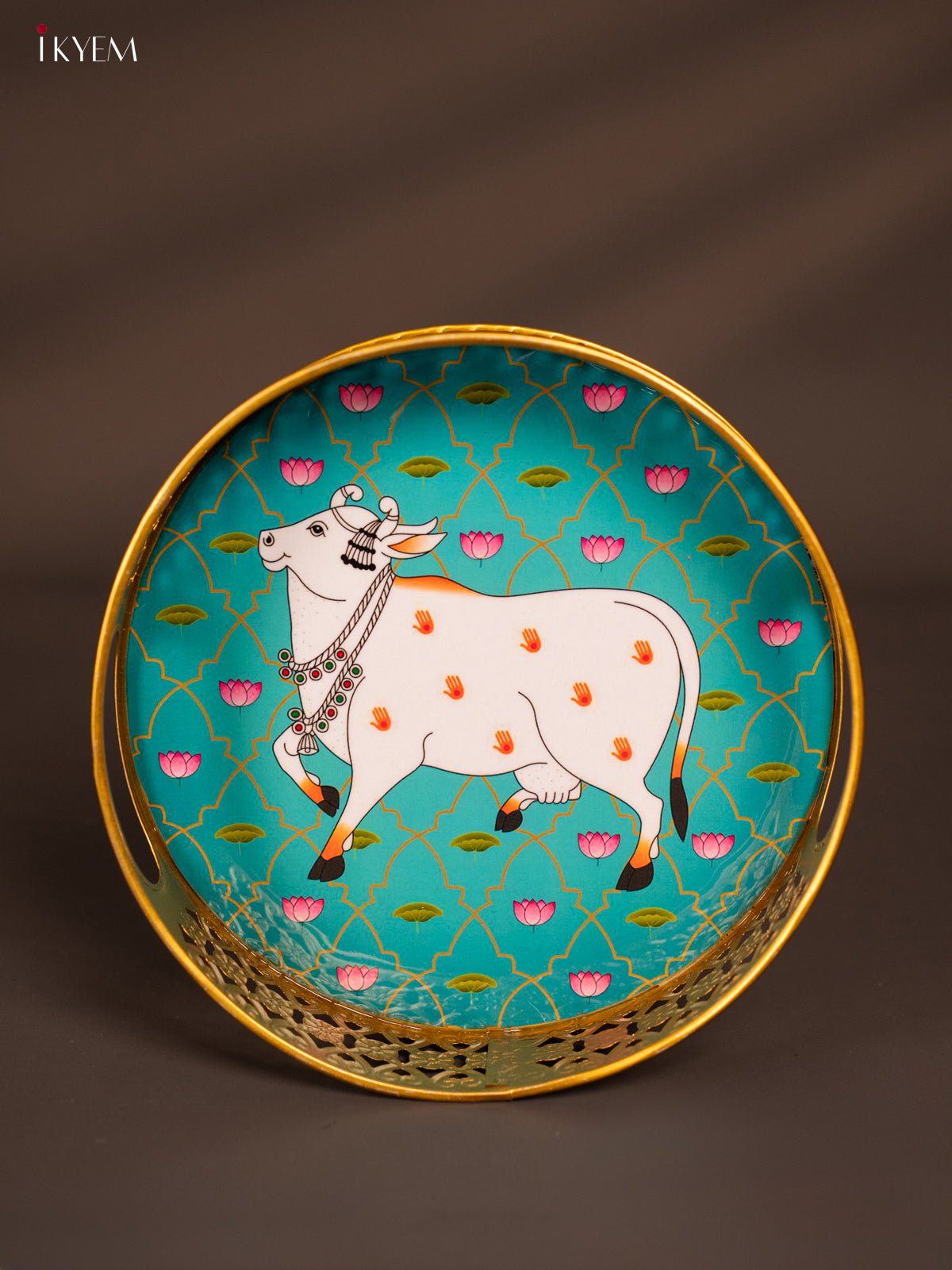 - This 8-inch round metal tray features a detailed digital print of a cow and Lotus in Teal green, ideal for pooja ceremonies and thoughtful return gifts.