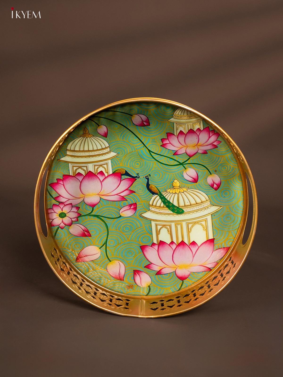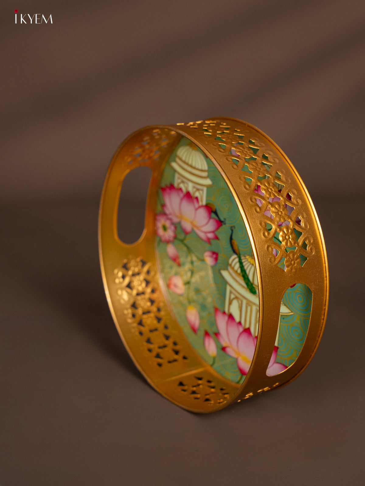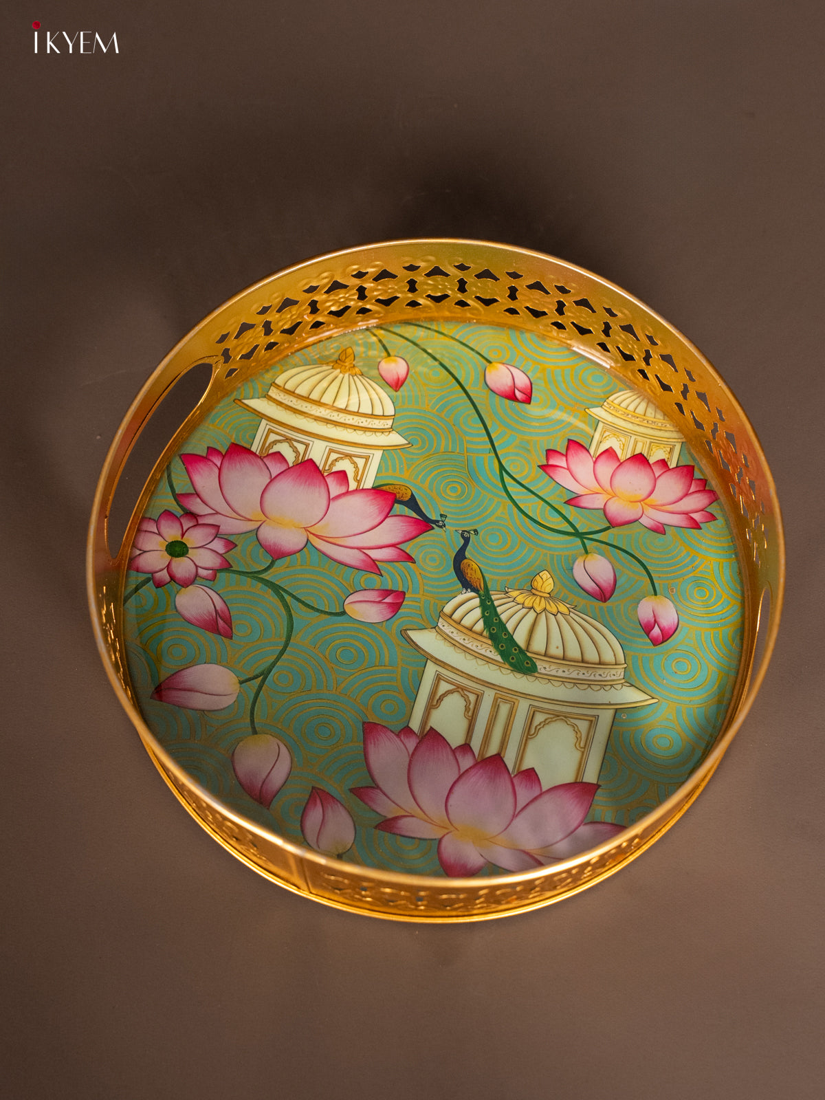 Digital printed Round Metal Tray Peacock & Lotus- Green - 8 Inches - KH13115